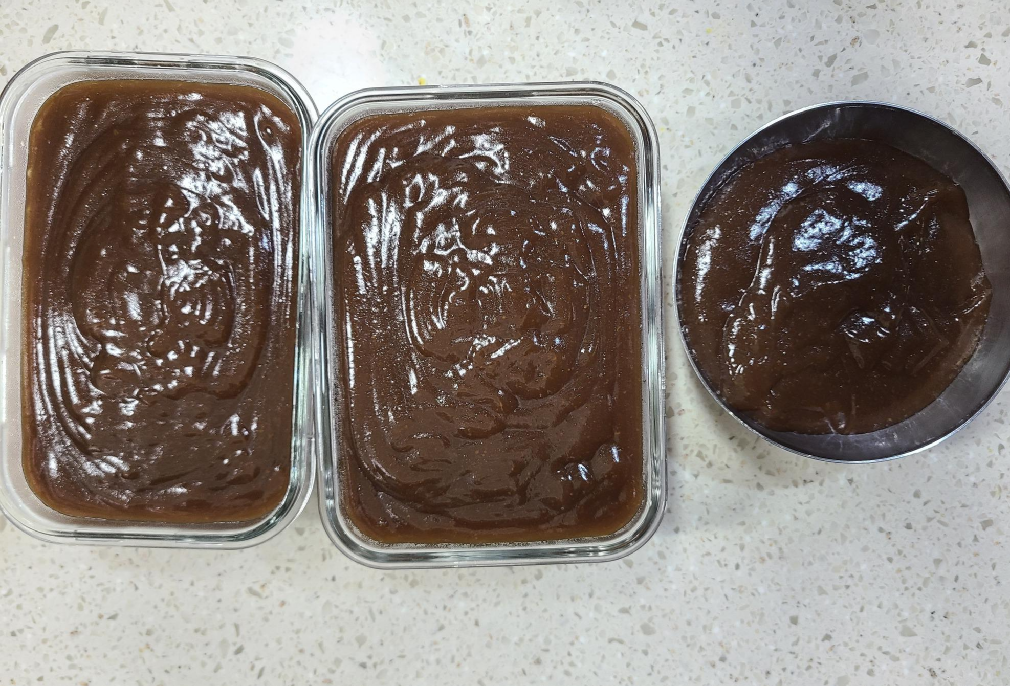 도토리묵 끓인 것을 그릇에 담아 시원한 곳에 6시간 이상 두었더니 묵이 굳었다.