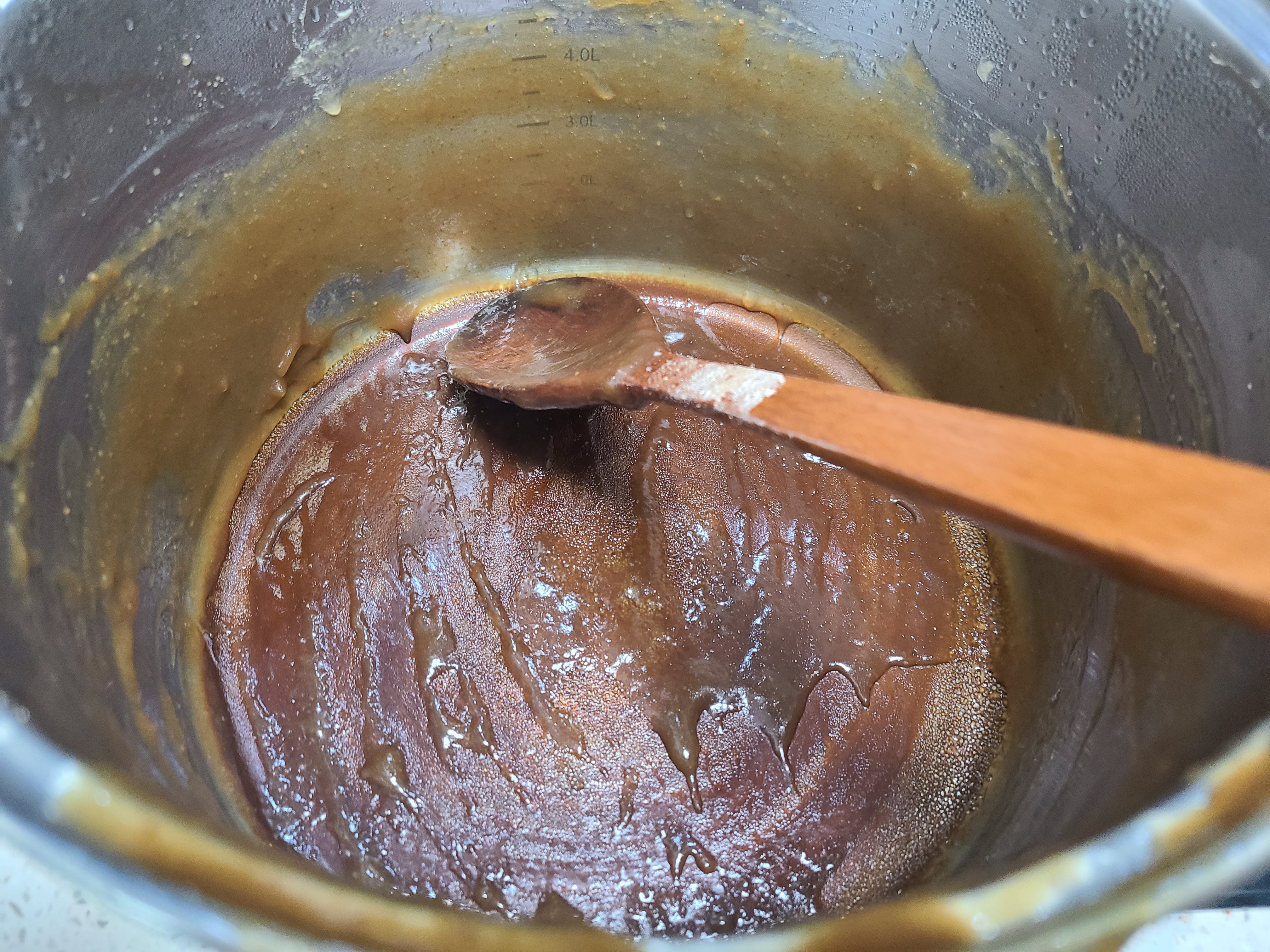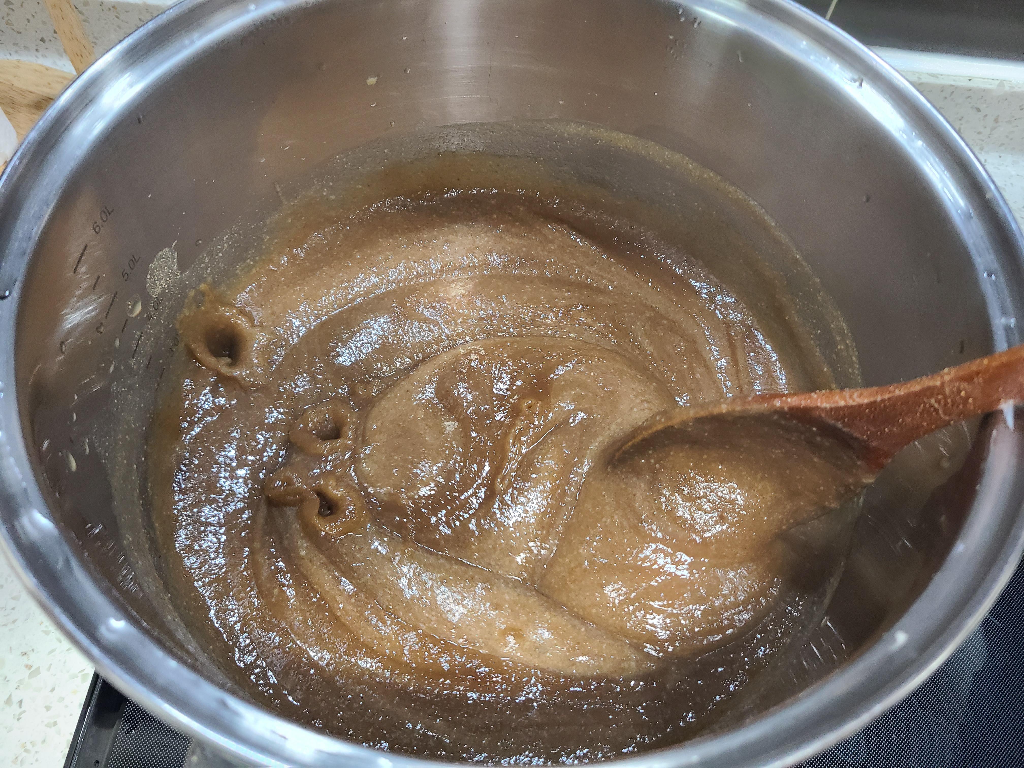 6. 저으면서 주걱을 들어 솥에 떨어트려 보았을 때 주르륵 흐르지 않고 느리게 덩어리로 떨어지면 거의 완성이 된 것이다.
