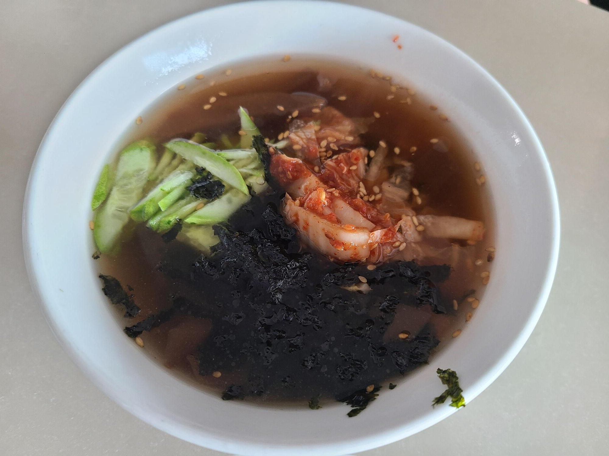 2. 그릇에 썰은 묵을 넣어준 후 준비해놓은 육수를 붓고 양념한 김장김치와 오이 그리고 김가루를 얹어 낸다.