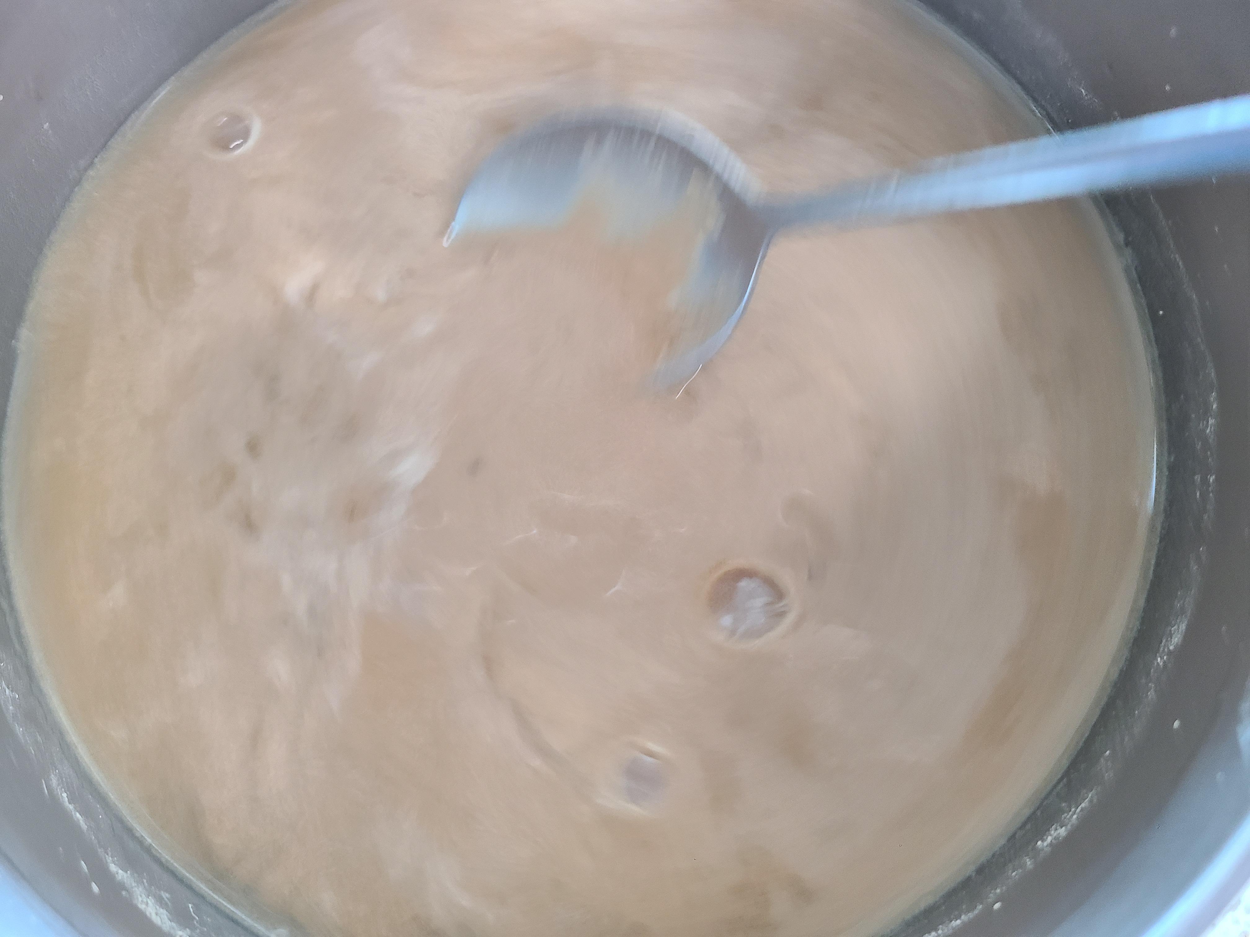 5. 도토리 앙금을 저어주면 앙금이 끓어오르면 기포가 터지기 시작하면 손에 화상을 입을 수 있으니 긴 주걱을 쓰거나 손에 면장갑을 끼고 하는 것이 좋다. 저으면서 너무 뻑뻑한 듯 해 물 1컵(200ml)을 더 부어주었다. 결국 7:1 비율로 만든 거다.