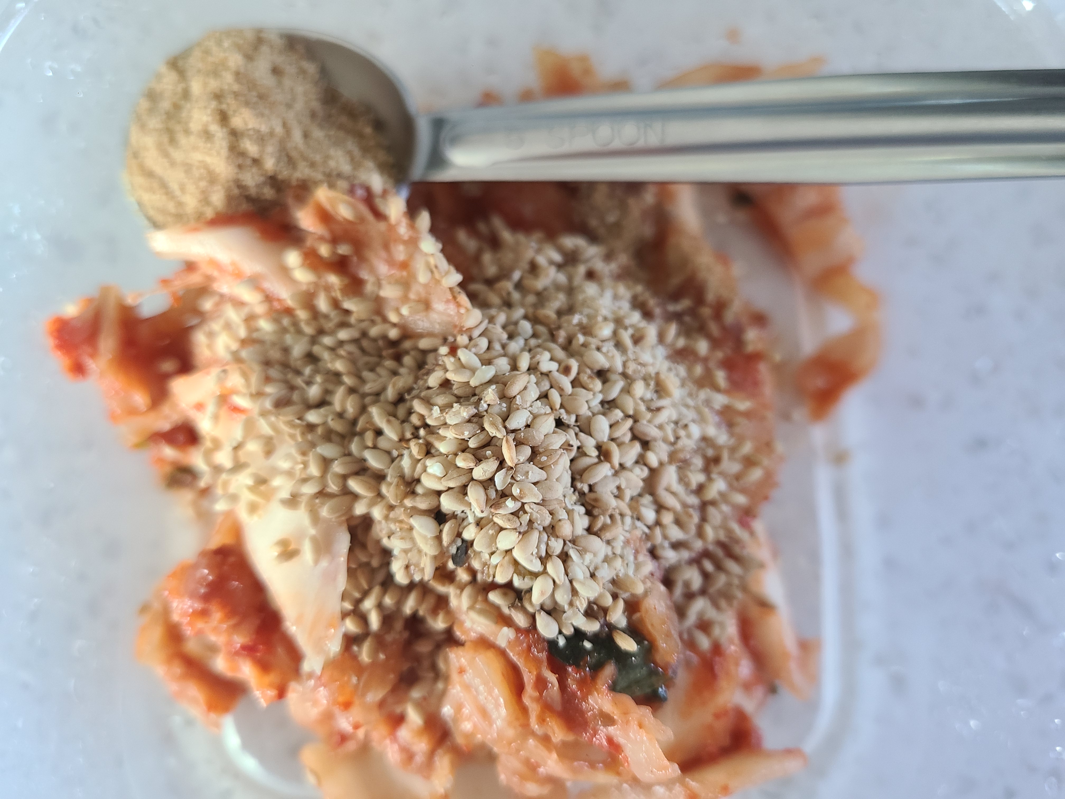 2. 썰어놓은 김장김치에 원당 1작은술과 깨소금 1큰술 참기름 한 방울을 넣고 조물조물 묻혀준다.