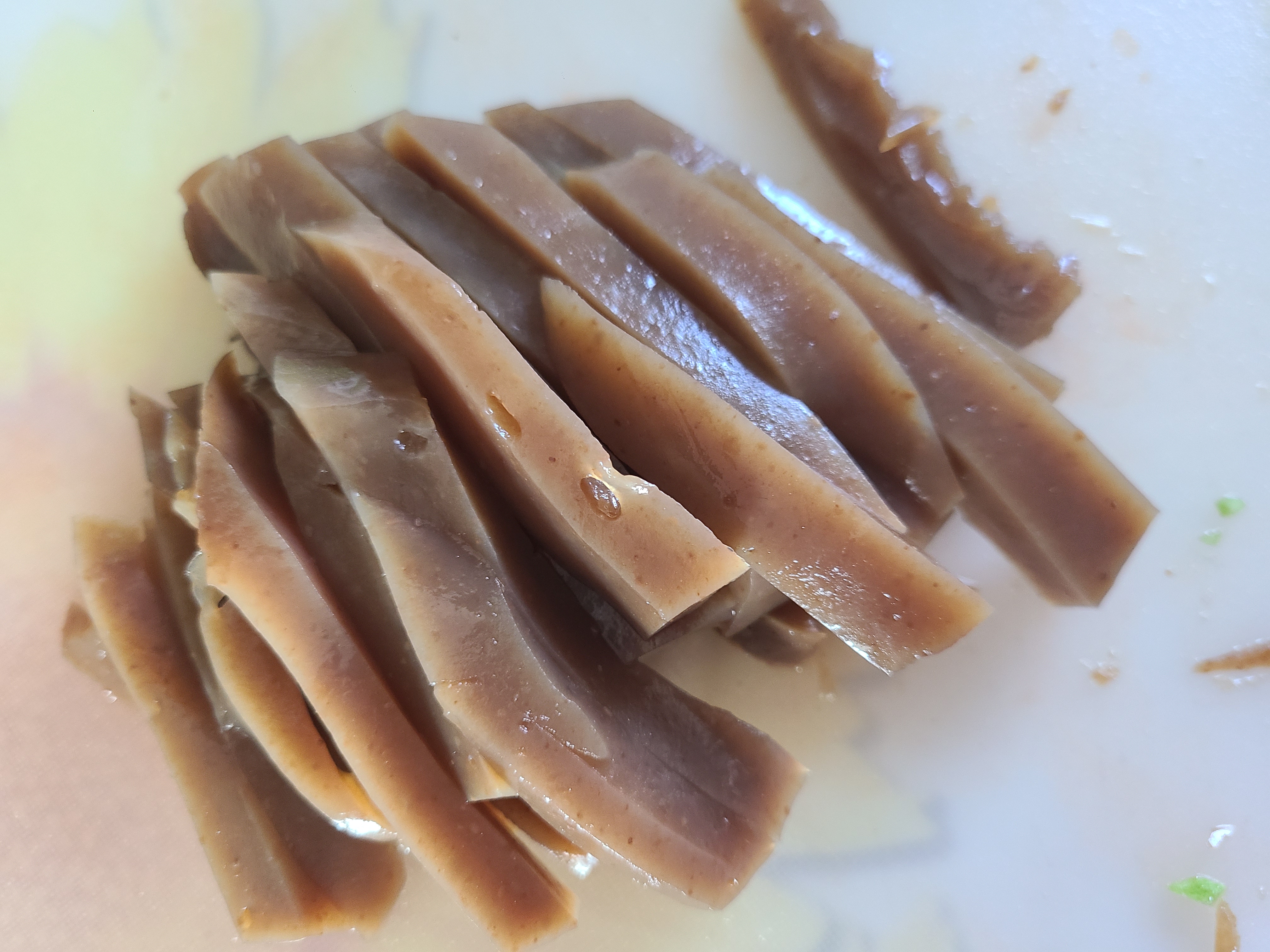 1. 도토리묵을 먹기 좋은 크기로 썰어줬다. 참기름을 넣어서인지 묵이 윤기가 흐른다. 하나 씹어보니 약간의 간이 느껴졌다.