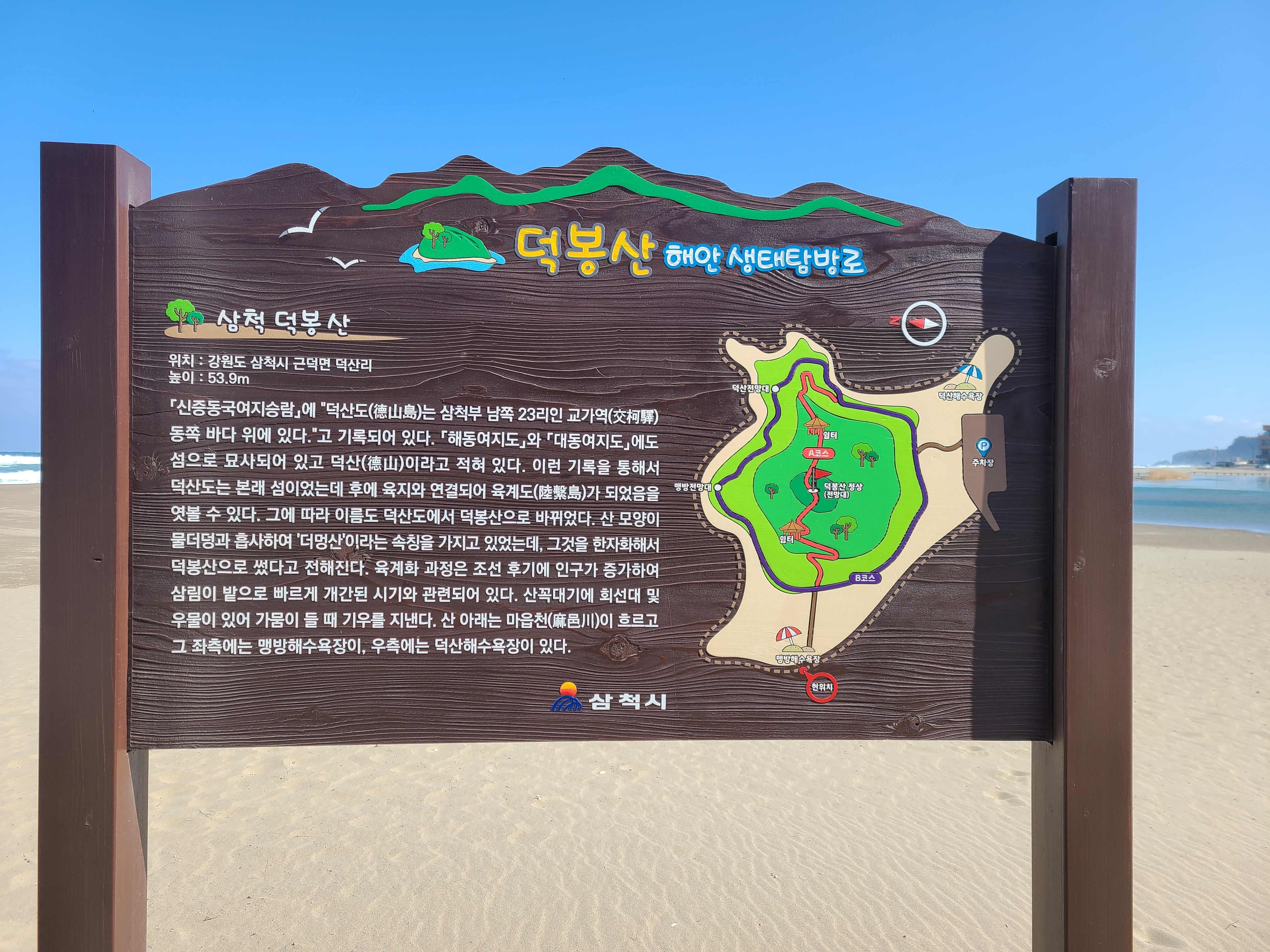 덕봉산을 중심으로 왼쪽에는 맹방해수욕장이 오른쪽에는 덕산해수욕장이 있다.