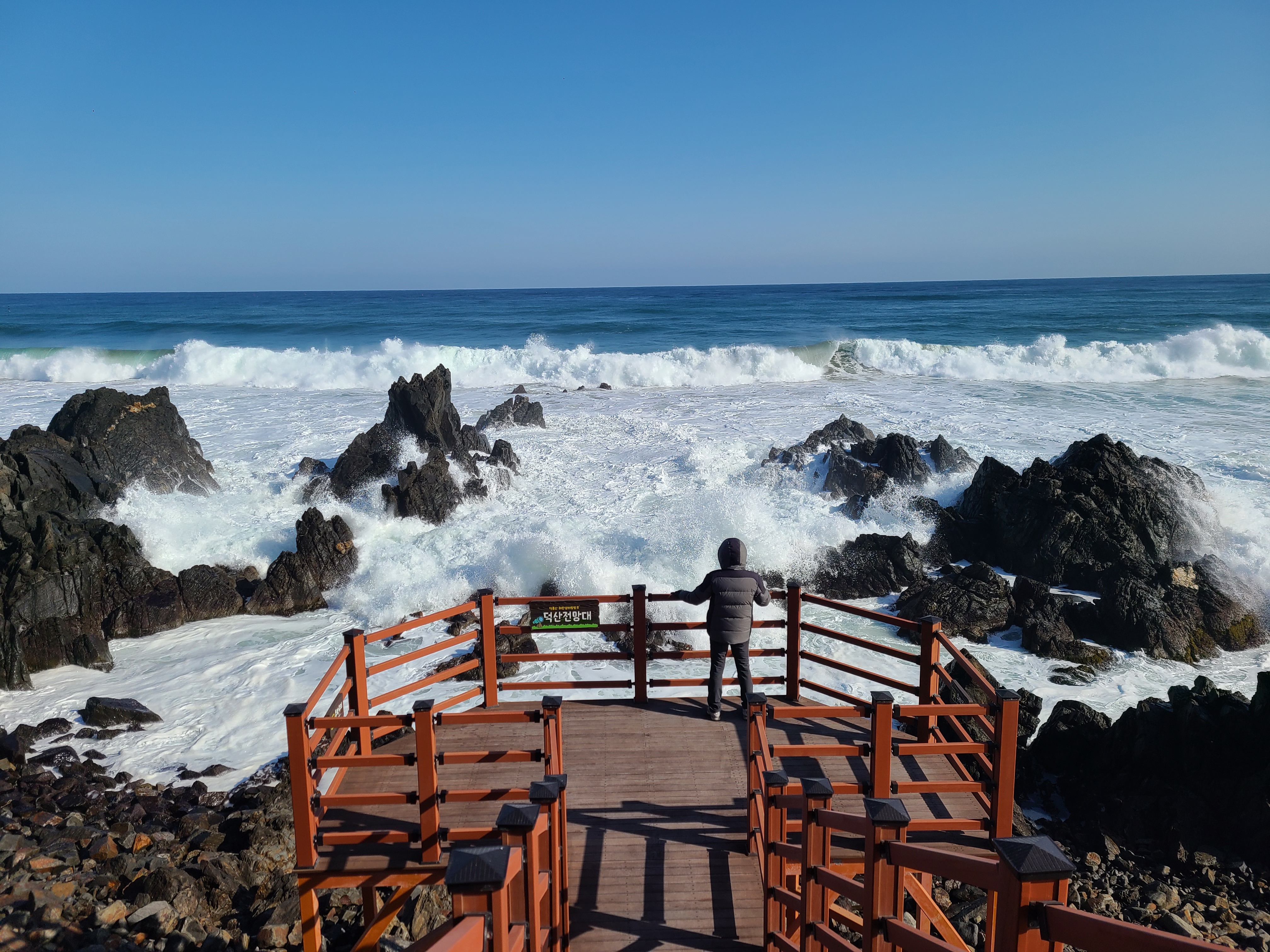 덕산 전망대에 서서 밀려오는 파도를 바라보는 데 그 규모가 너무 크고 웅장해 저절로 탄성이 나왔다. 파도가 부서질 때마다 바닷물이 전망대 위까지 튀었다.