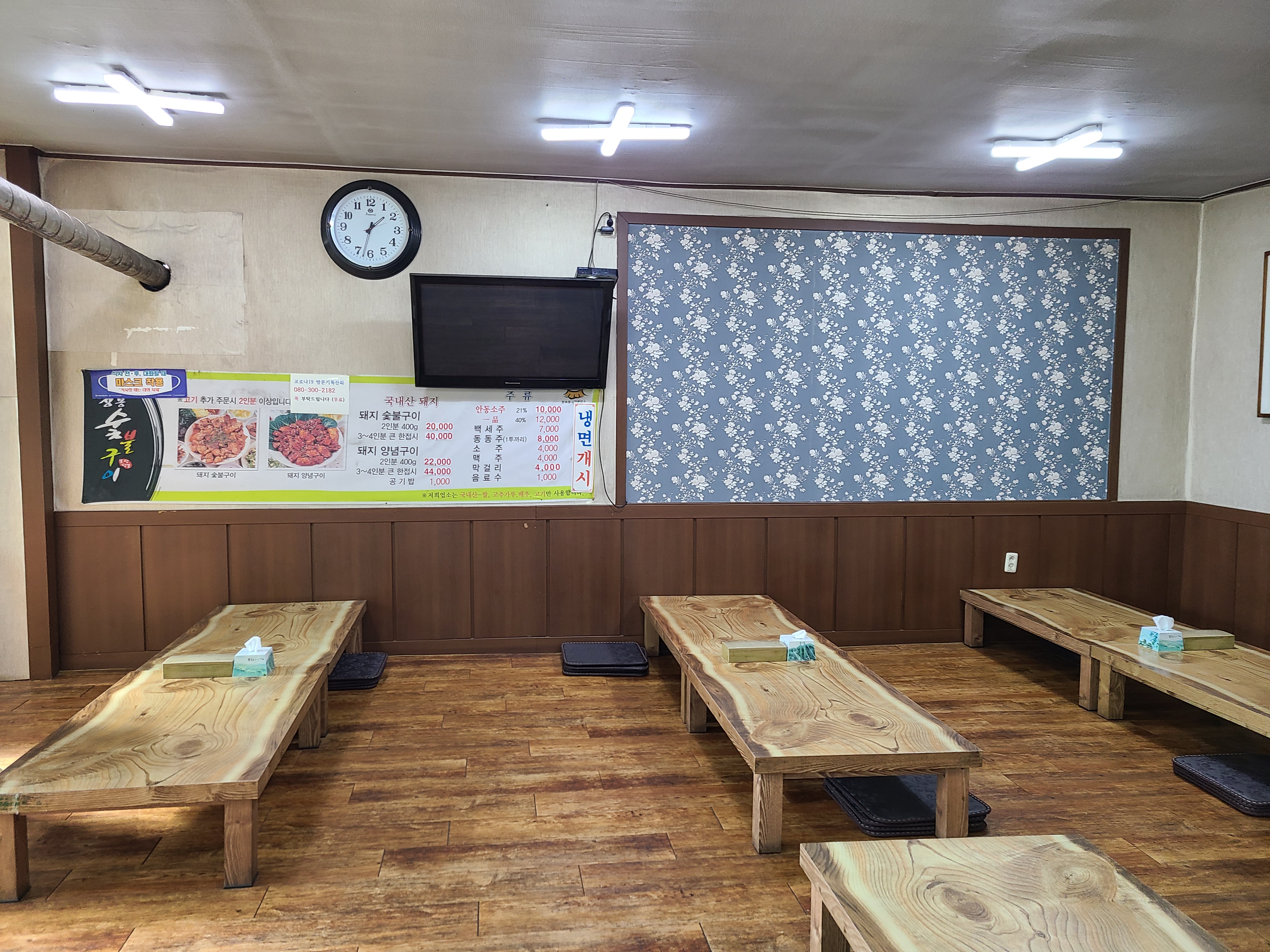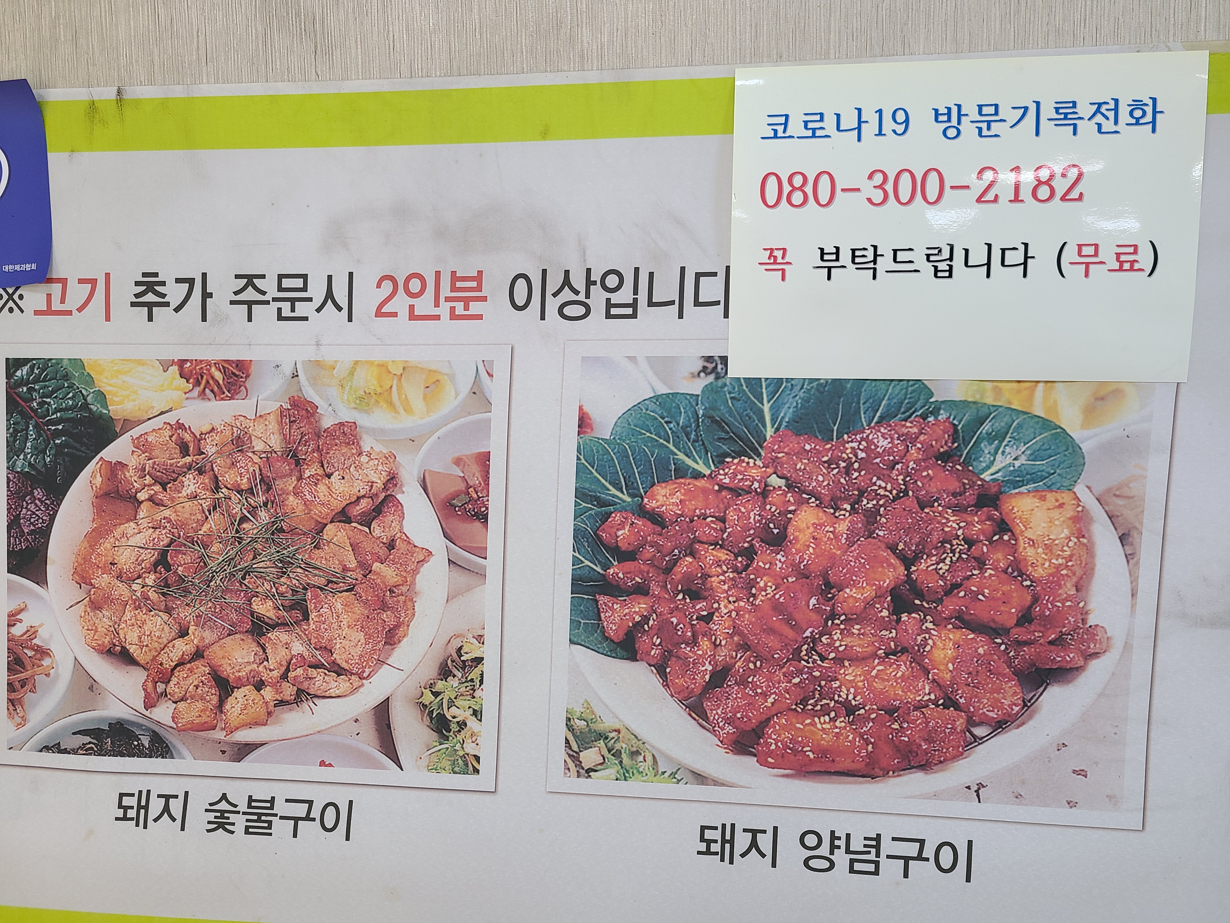 평일이었고 1시를 넘겨서인지 식당에는 손님이 없었다. 메뉴는 솔잎 돼지 숯불구이와 돼지 양념 숯불구이 두 가지였다. 돼지 숯불구이로 주문하니 연세 많으신 아주머니가 3인분을 주느냐고 묻는데 2인분만 주문했다.