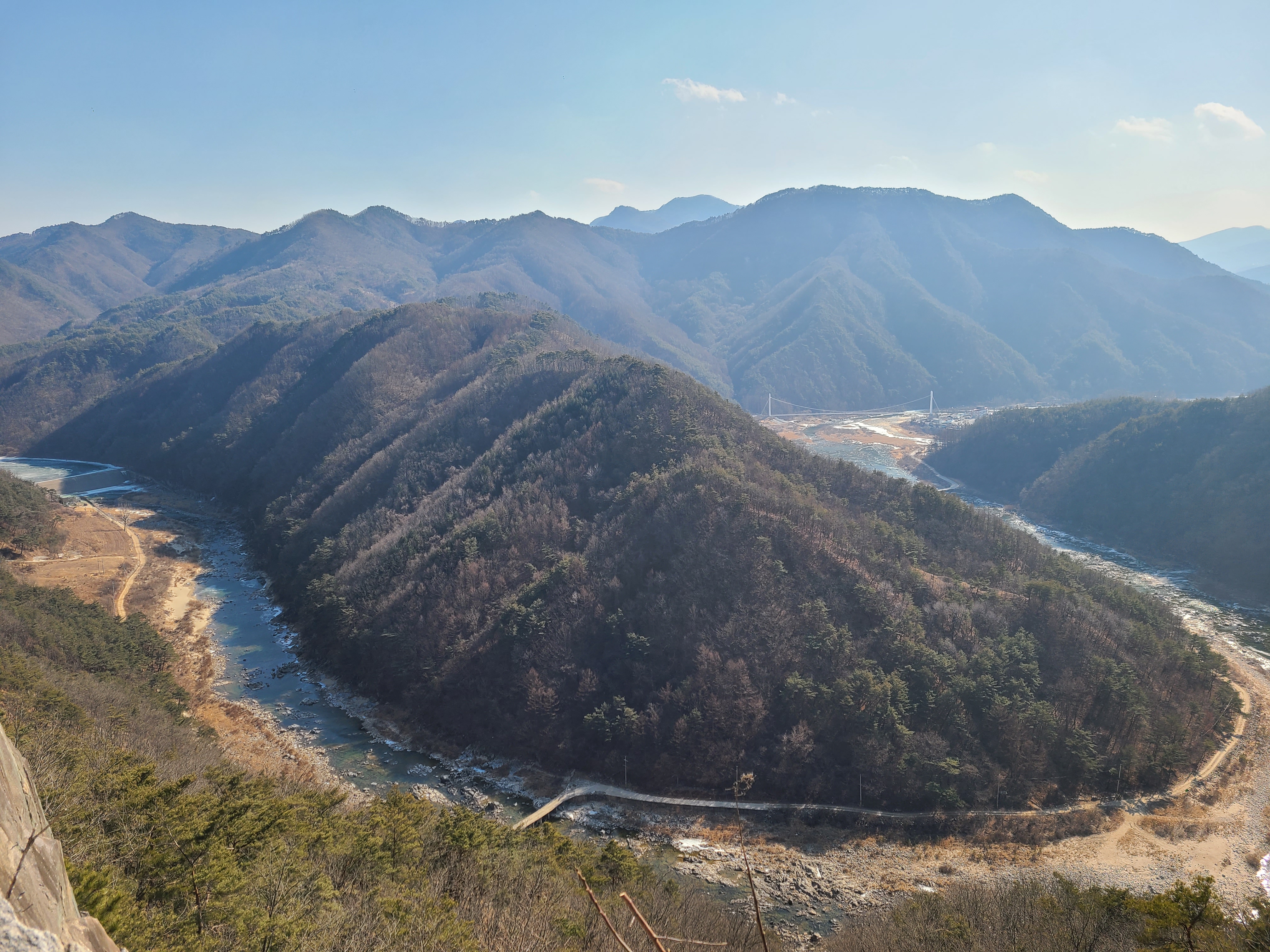범바위 전망대에서 내려다 보이는 황우산과 낙동강의 모습이 마치 영월 한반도 지형을 보는 듯했다. 낙동강은 추운 날씨로 얼어 있고 황우산 오른쪽 뒤편으로 명호 이나리 출렁다리가 보인다.