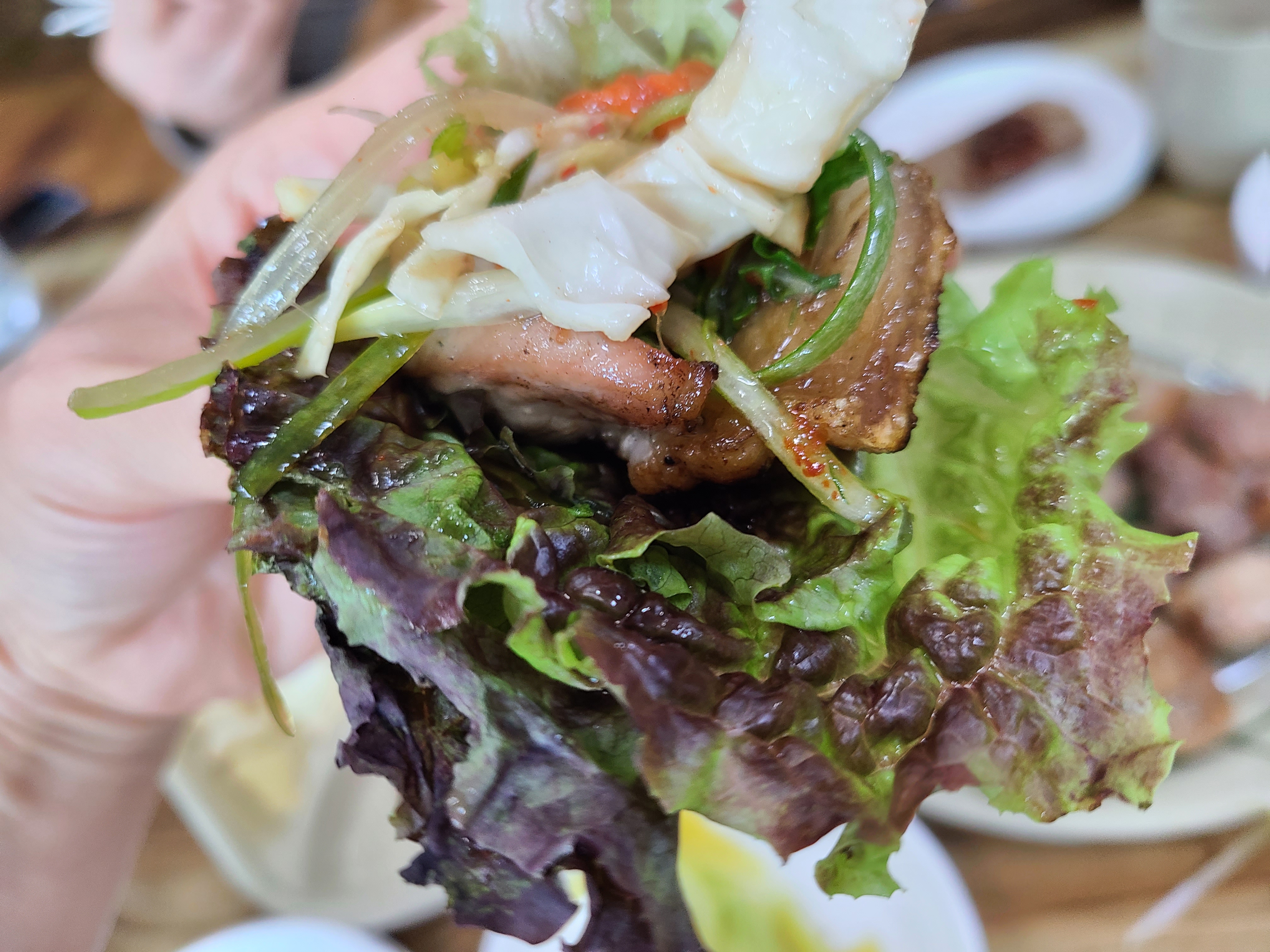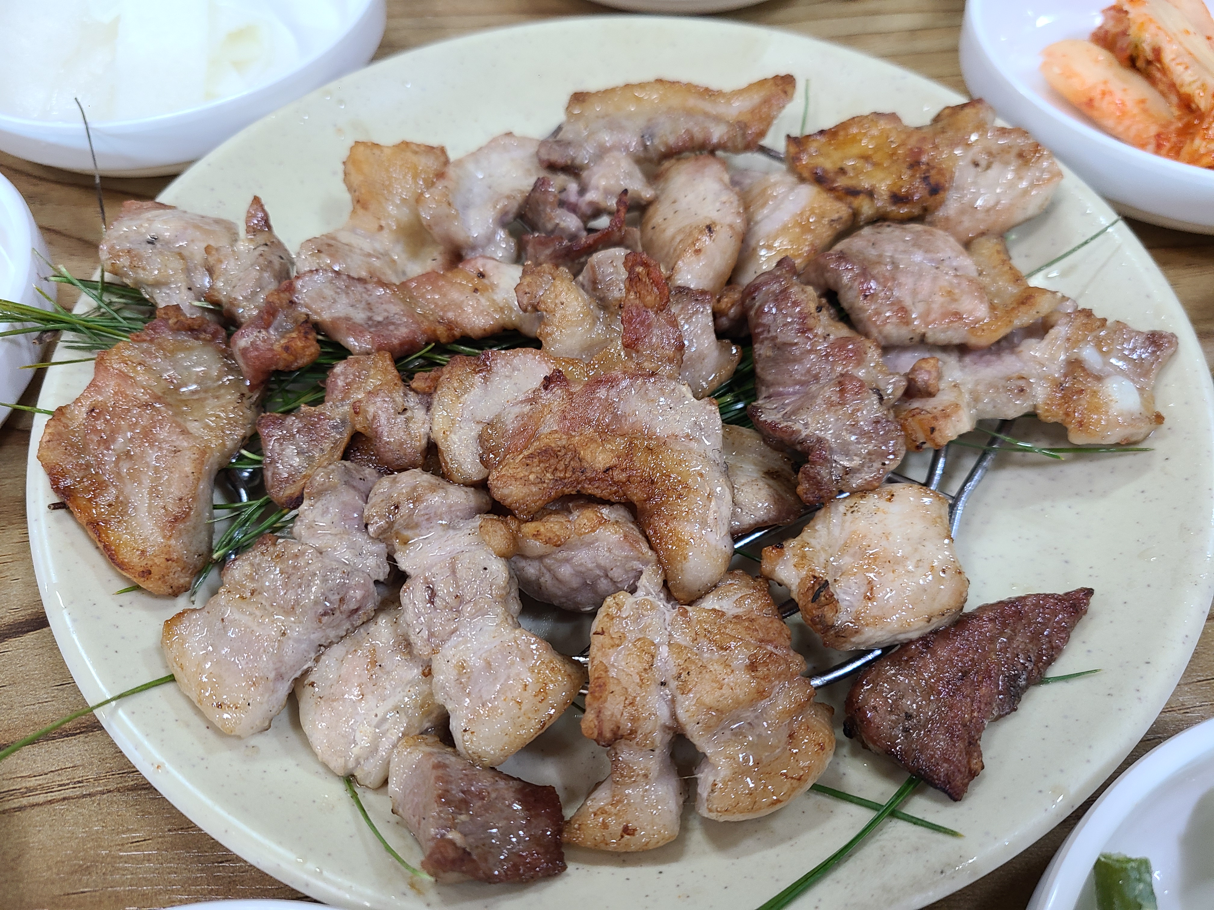 초벌구이를 해놓았었는지 주문한 지 10분도 되지 않아 솔잎 돼지 숯불구이가 노릇노릇하게 구워져서 나왔다. 솔잎을 깔고 그 위에 돼지고기를 얹어 나왔는데 솔향과 숯불향이 입혀져 고기 향이 너무 좋았다.