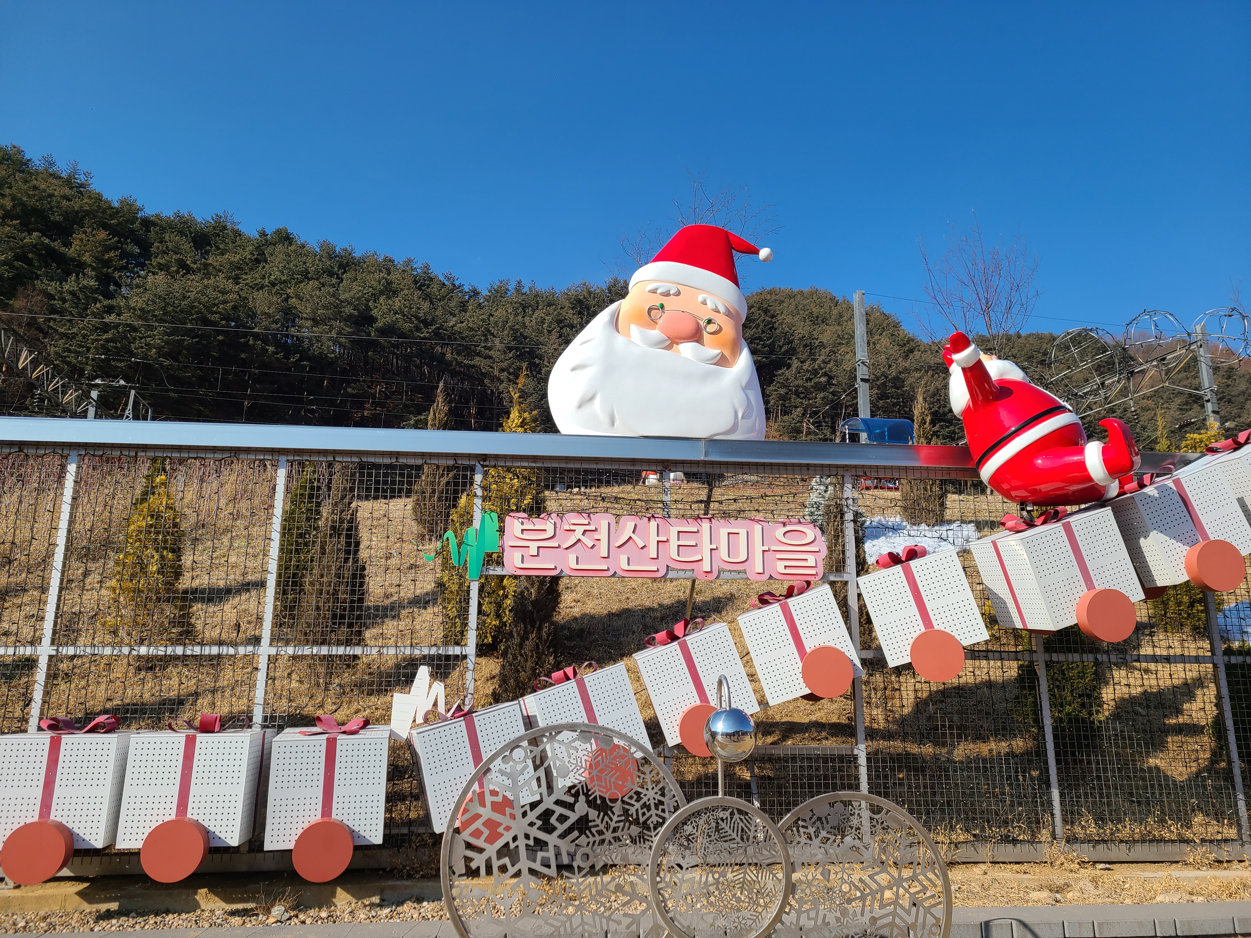 분천역 산타마을 주차장에 차를 세우니 산타와 크리스마스트리가 먼저 눈에 들어온다.