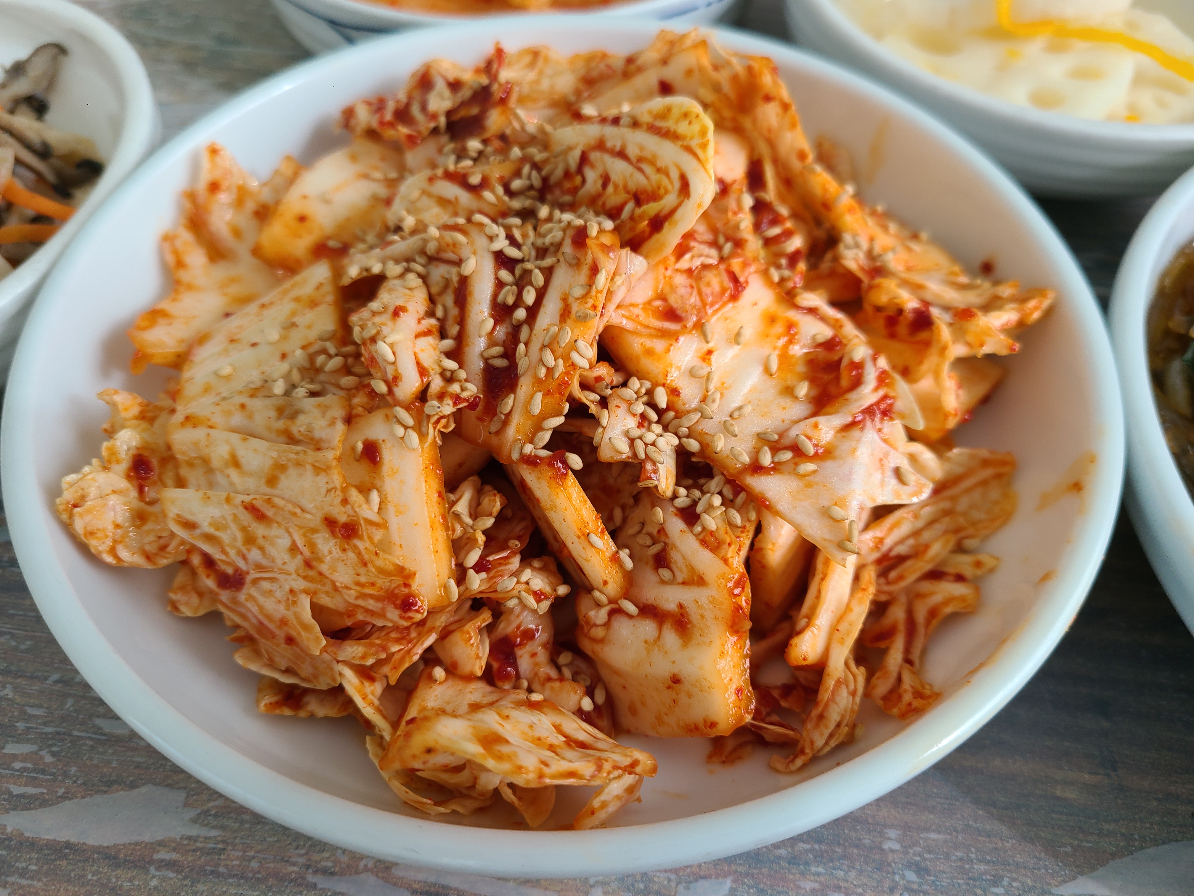 배추 겉절이는, 배추를 절이지 않고 양념장을 만들어 바로 버무려서 아삭한 식감이 살아있고 매콤하니 맛이 있다.