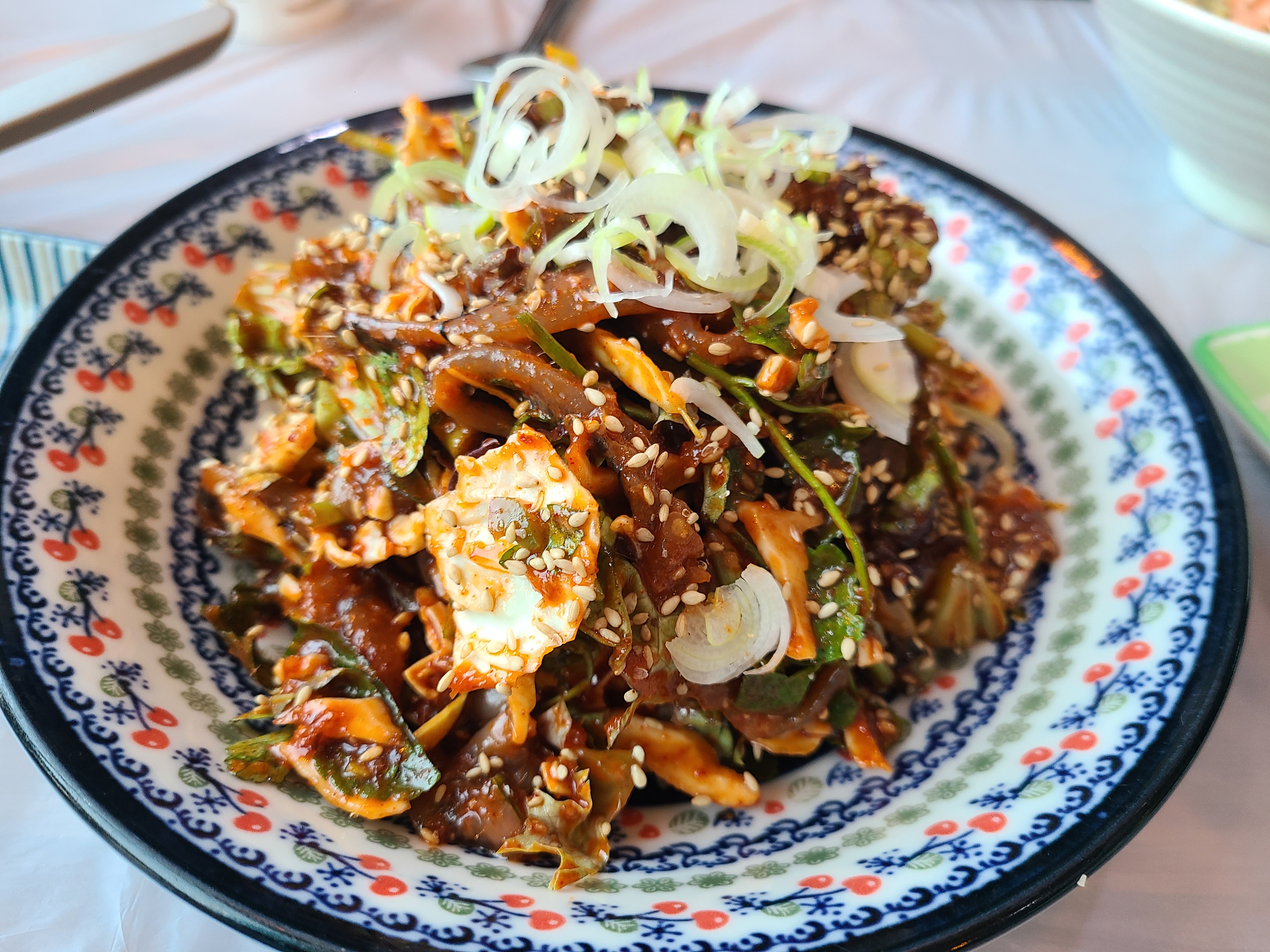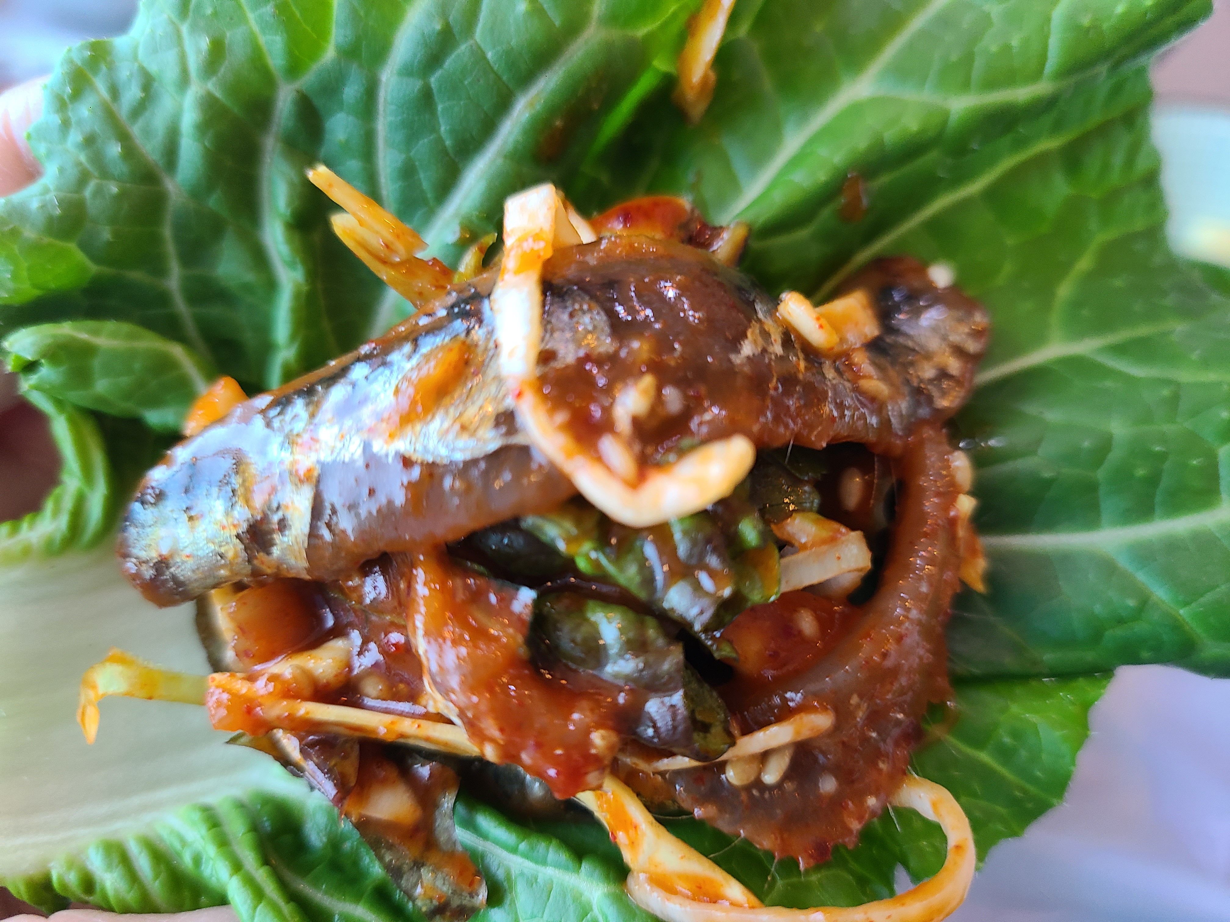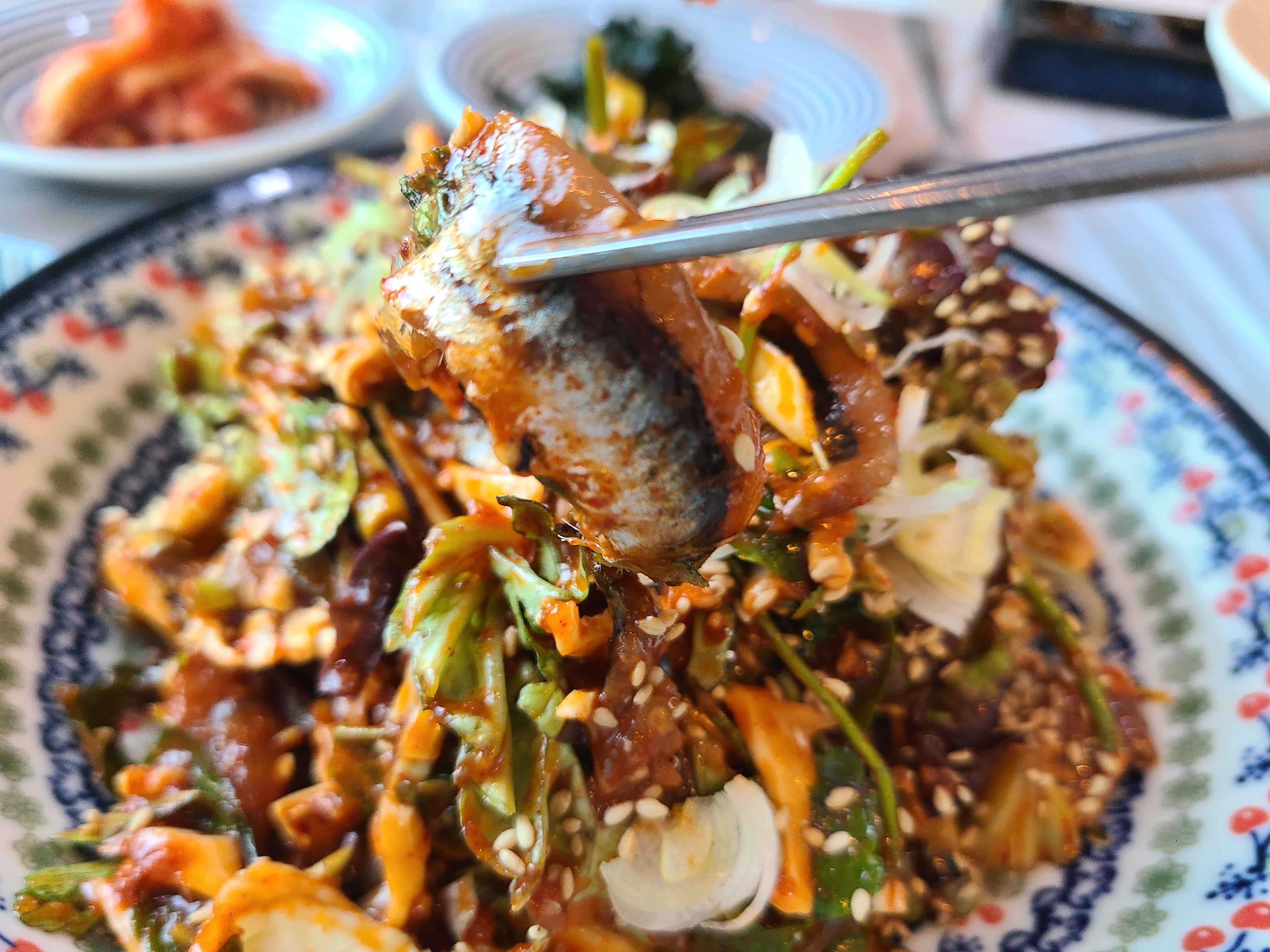 멸치회는 눈으로만 보아도 아주 먹음직스러워 보인다. 멸치회를 한 젓가락 들어 먹어보니 양념이 잘 어우러져 아주 맛이 좋고 생멸치가 너무 부드러웠다. 쌈에 싸서 먹는데 멸치회 맛이 훌륭했다.