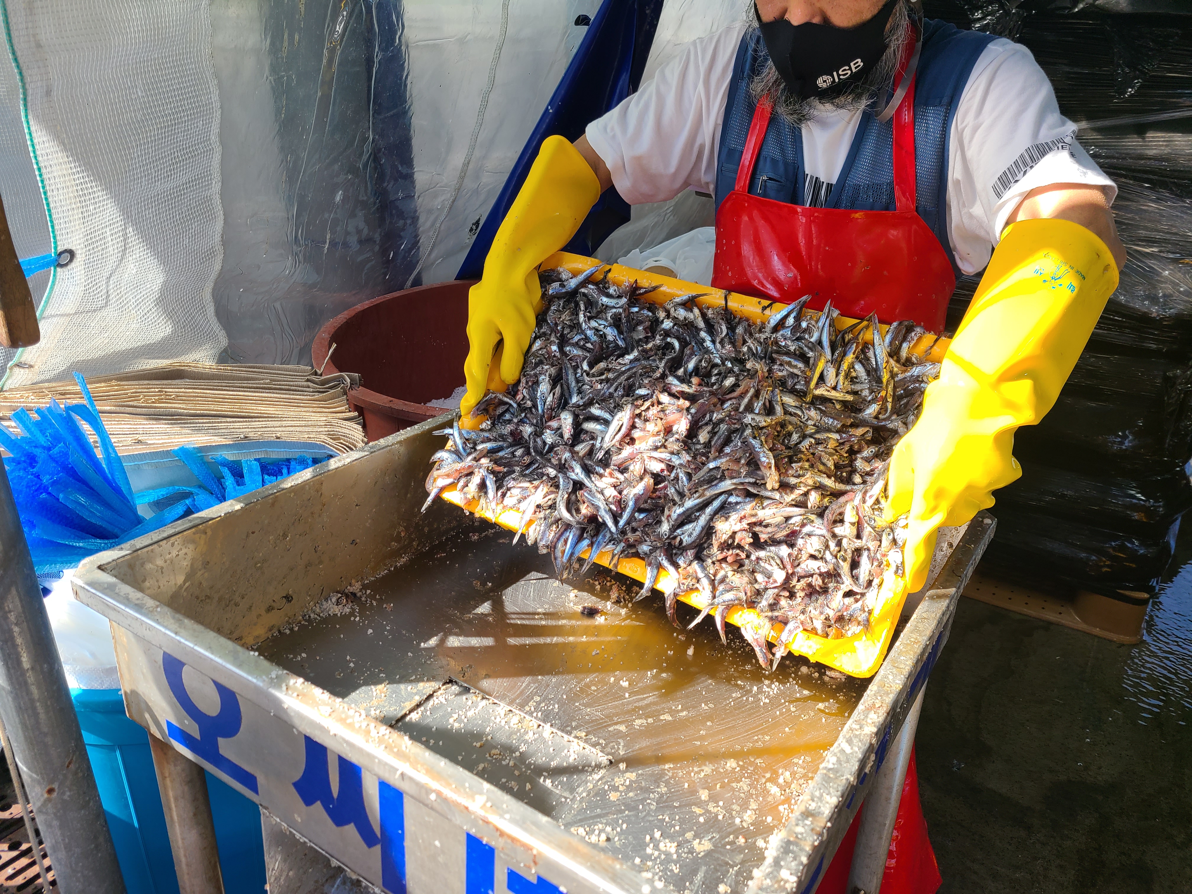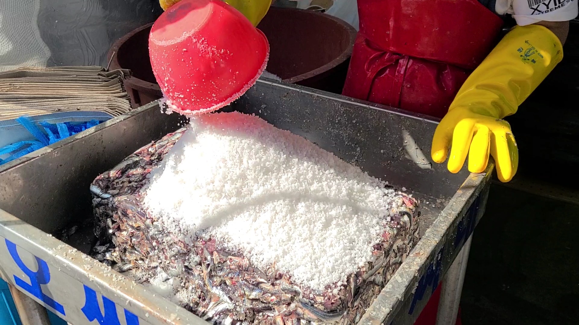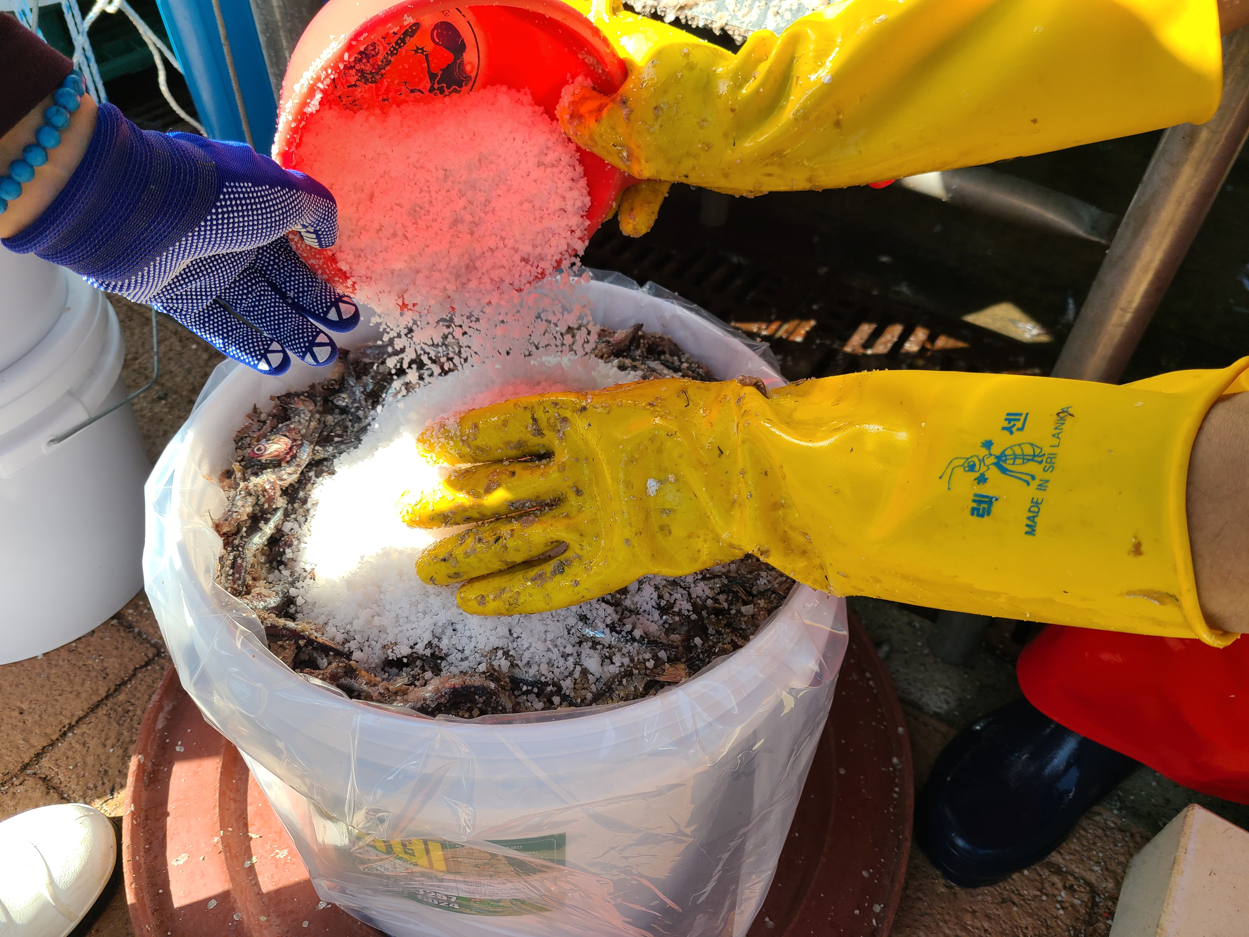 생멸치 30kg에 천일염 3 바가지를 붓고 골고루 섞어준다. 소금은 국산과 중국 산중 선택을 하는데 국산 천일염이 더 비싸다.