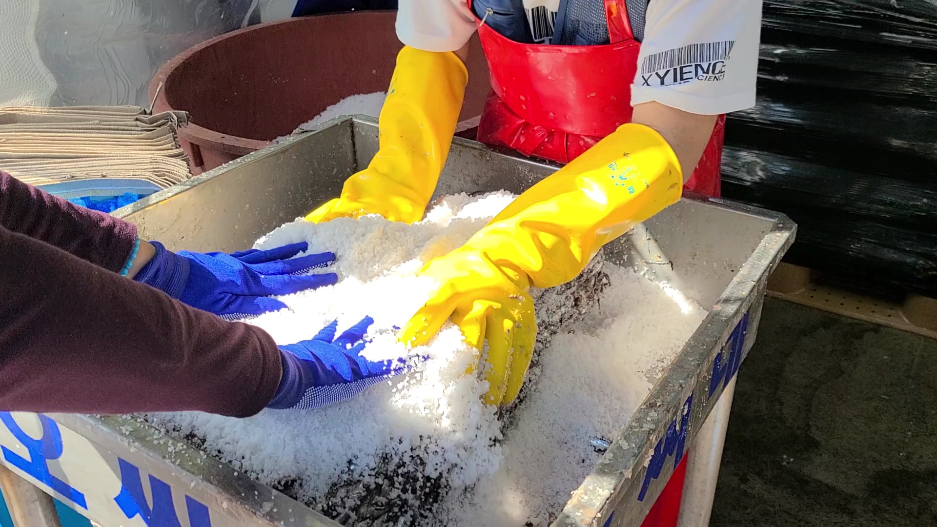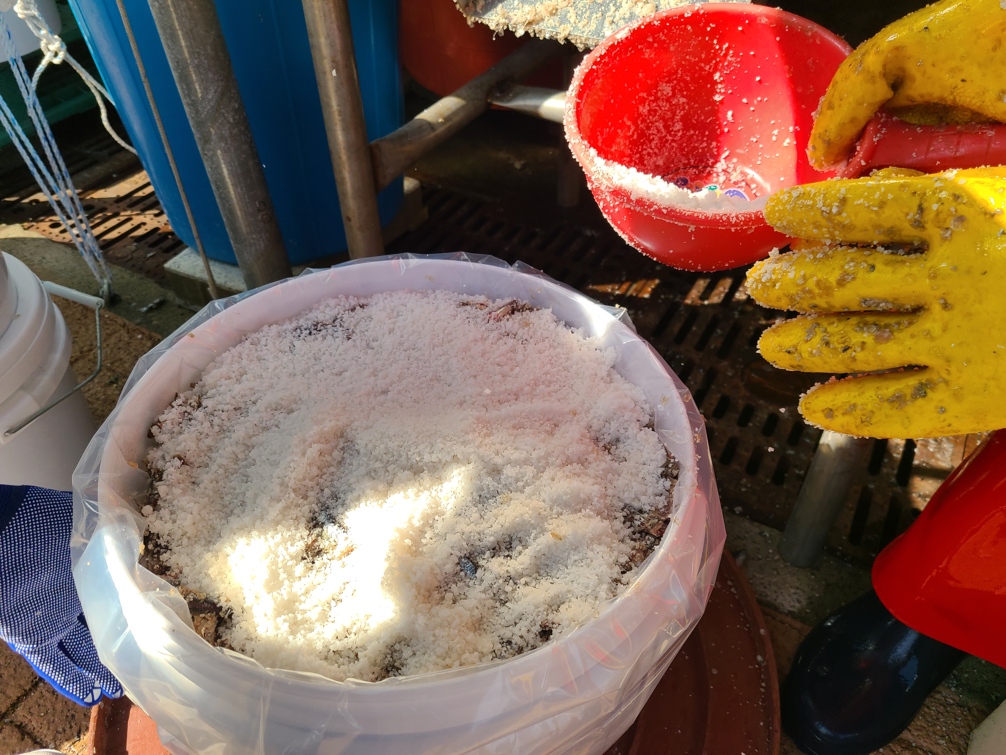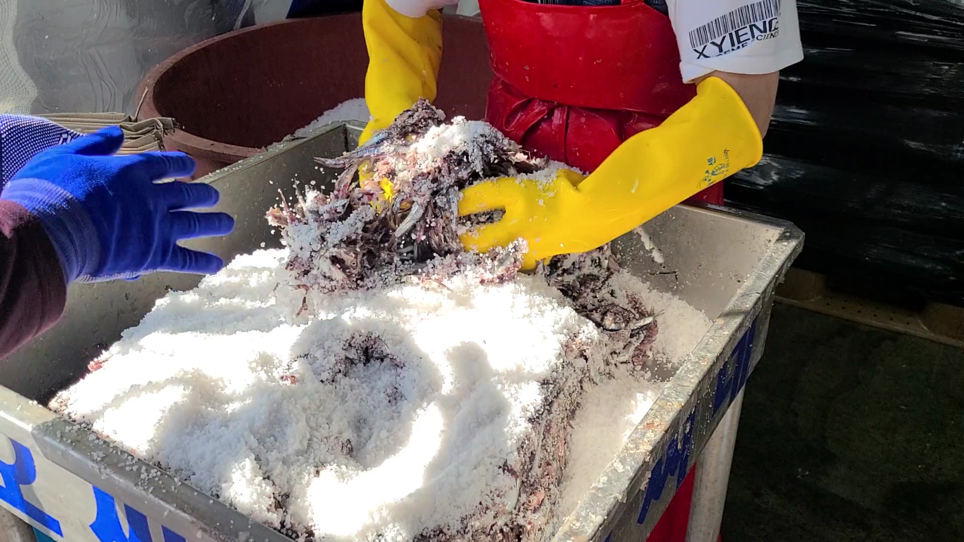 생멸치 30kg에 천일염 3 바가지를 붓고 골고루 섞어준다. 소금은 국산과 중국 산중 선택을 하는데 국산 천일염이 더 비싸다.