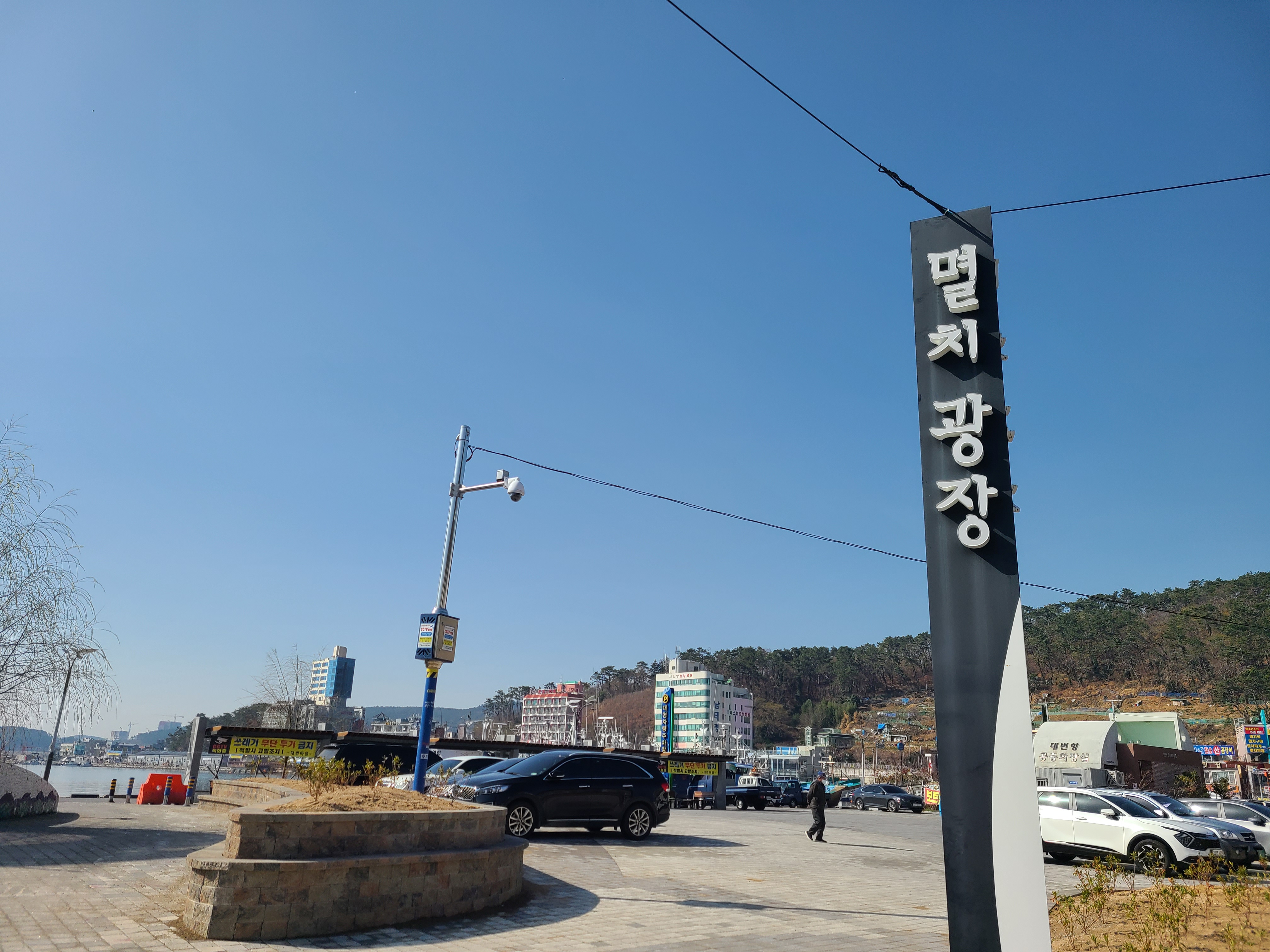 멸치 광장 양쪽으로는 공영주차장이 있어 차를 주차할 수 있다. 맞은편으로는 건어물 가게가 줄지어 있고, 대변항 쪽으로는 하얀 천막이 줄지어 있는데 그곳에서는 생멸치를 판매하고 있었다.
