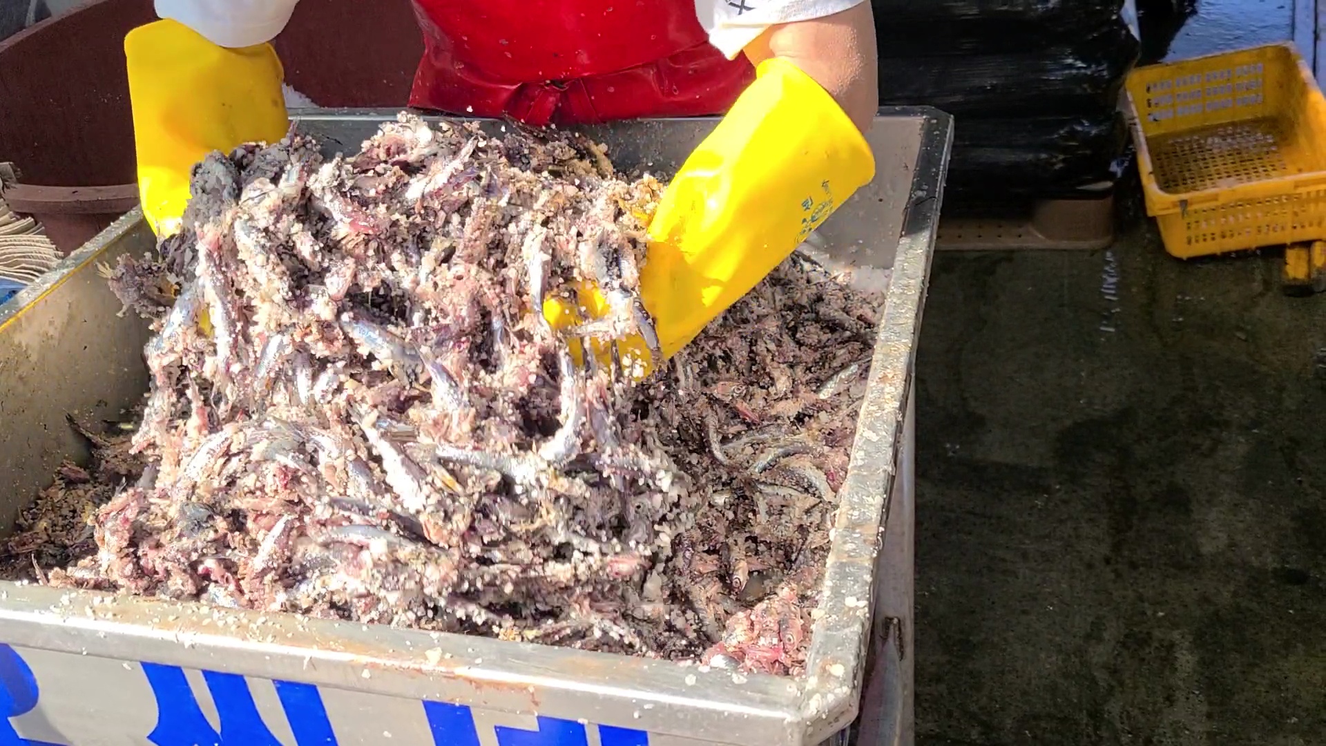 생멸치를 천일염을 넣고 골고루 섞어주면 통에 담아준다.