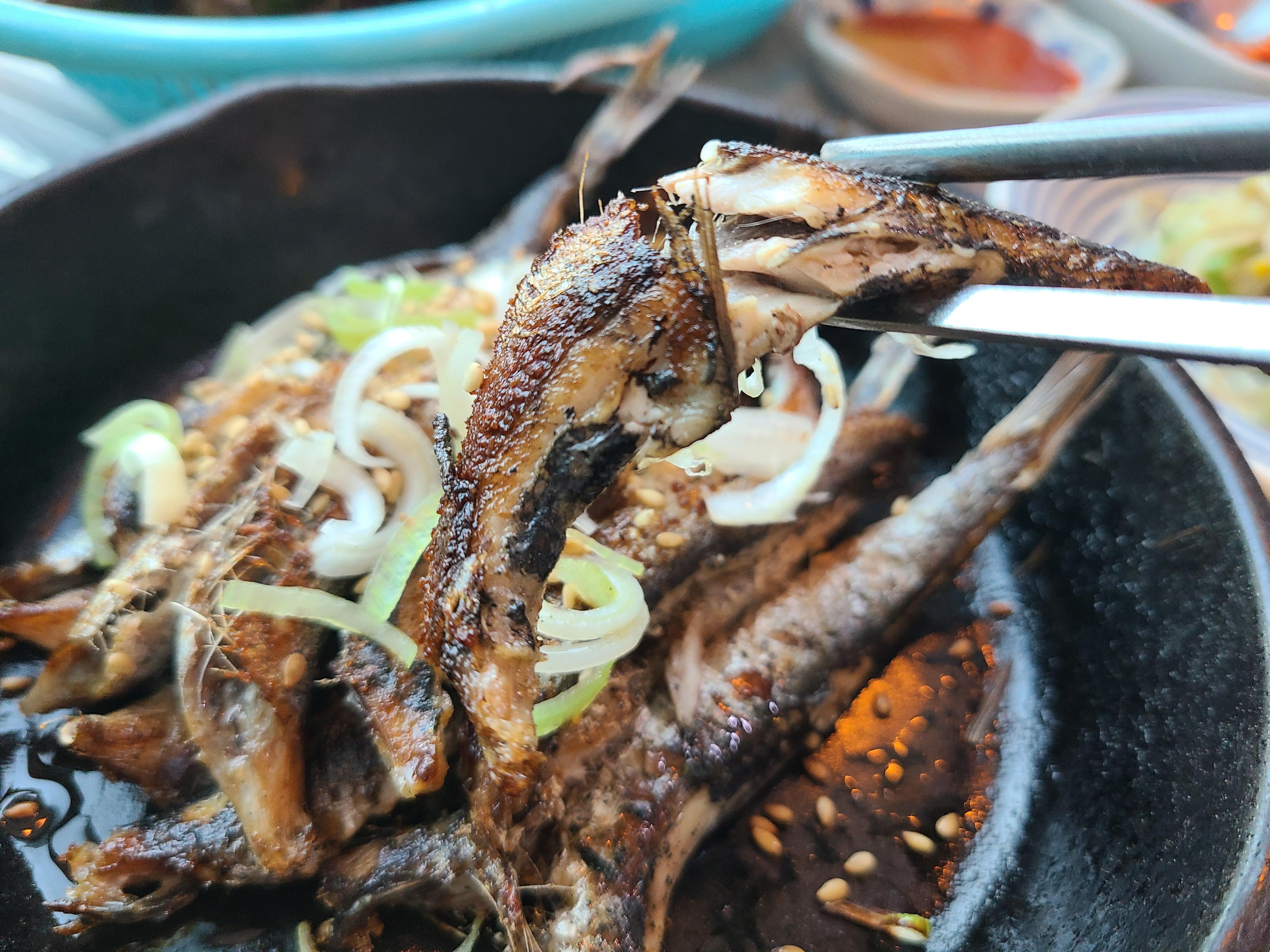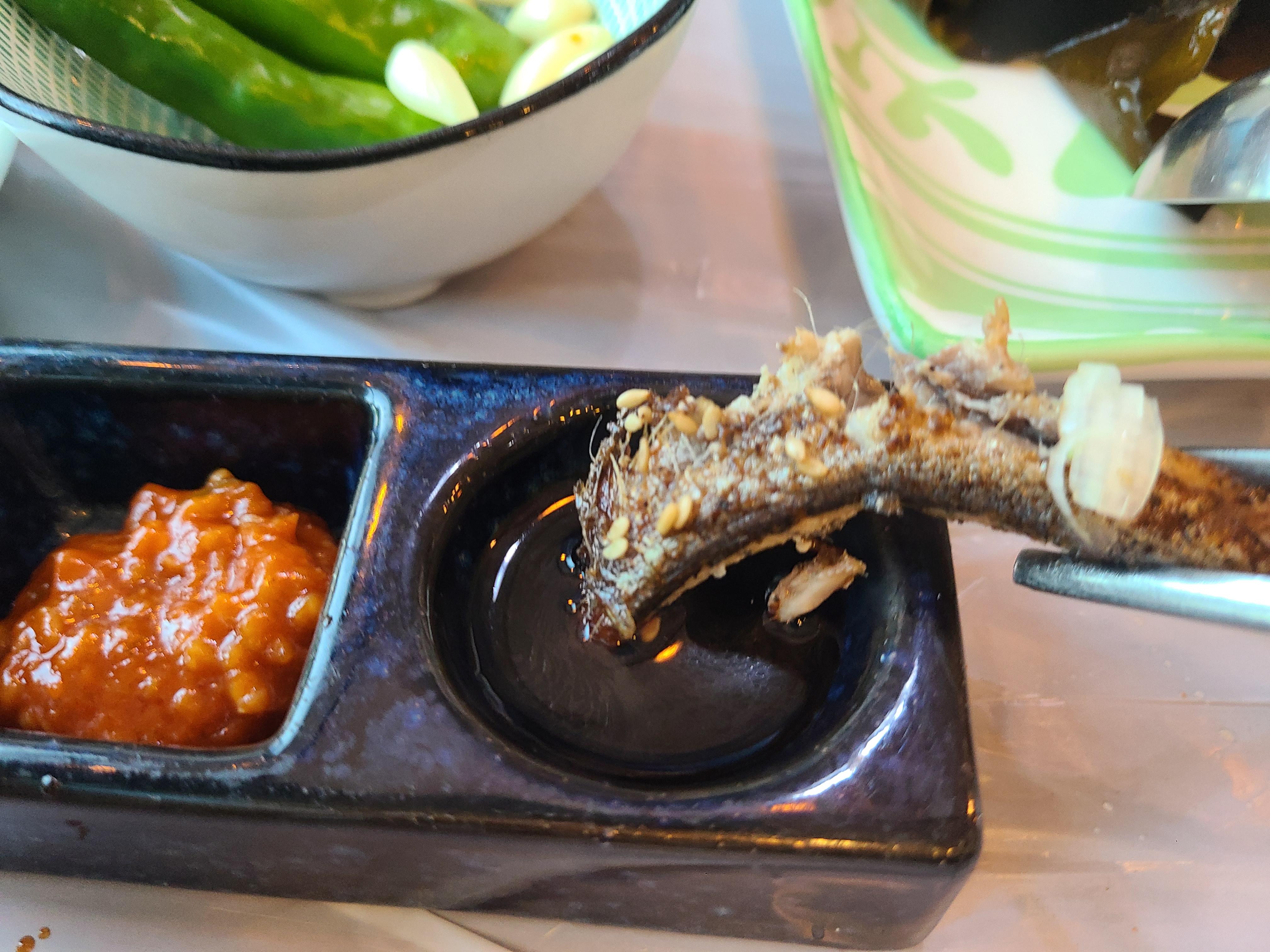 멸치구이를 간자 와사비장에 찍어서 뼈 채 먹는데 고소한 맛이 입안에 가득 찬다.