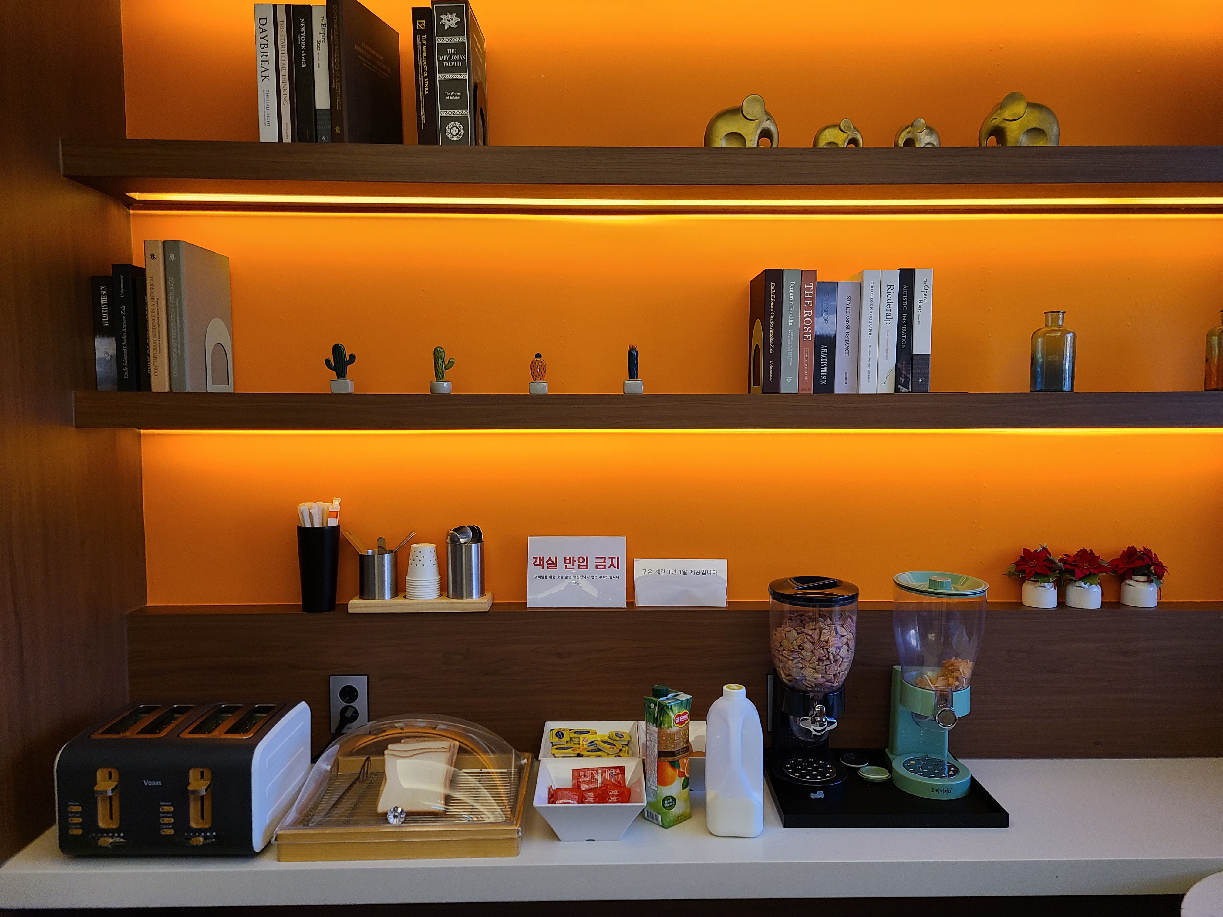 조식으로 토스트, 컵라면, 시리얼, 주스와 커피를 제공한다.