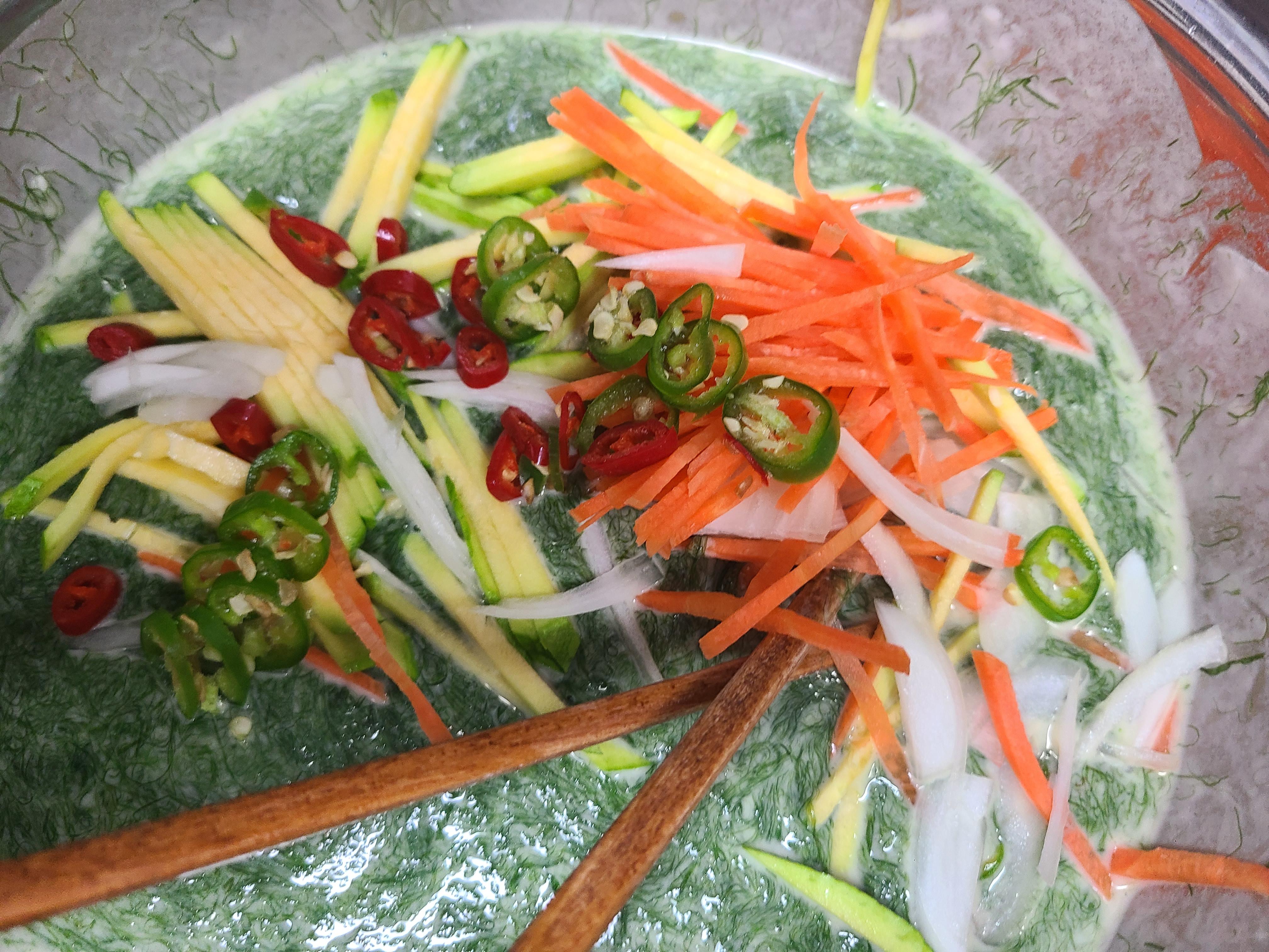 매생이 180g, 부침가루 1컵(200ml), 물 250ml, 계란 1개, 소금 1꼬집, 애호박, 당근, 양파 약간, 청양고추 2개(채소는 있는 것 활용)