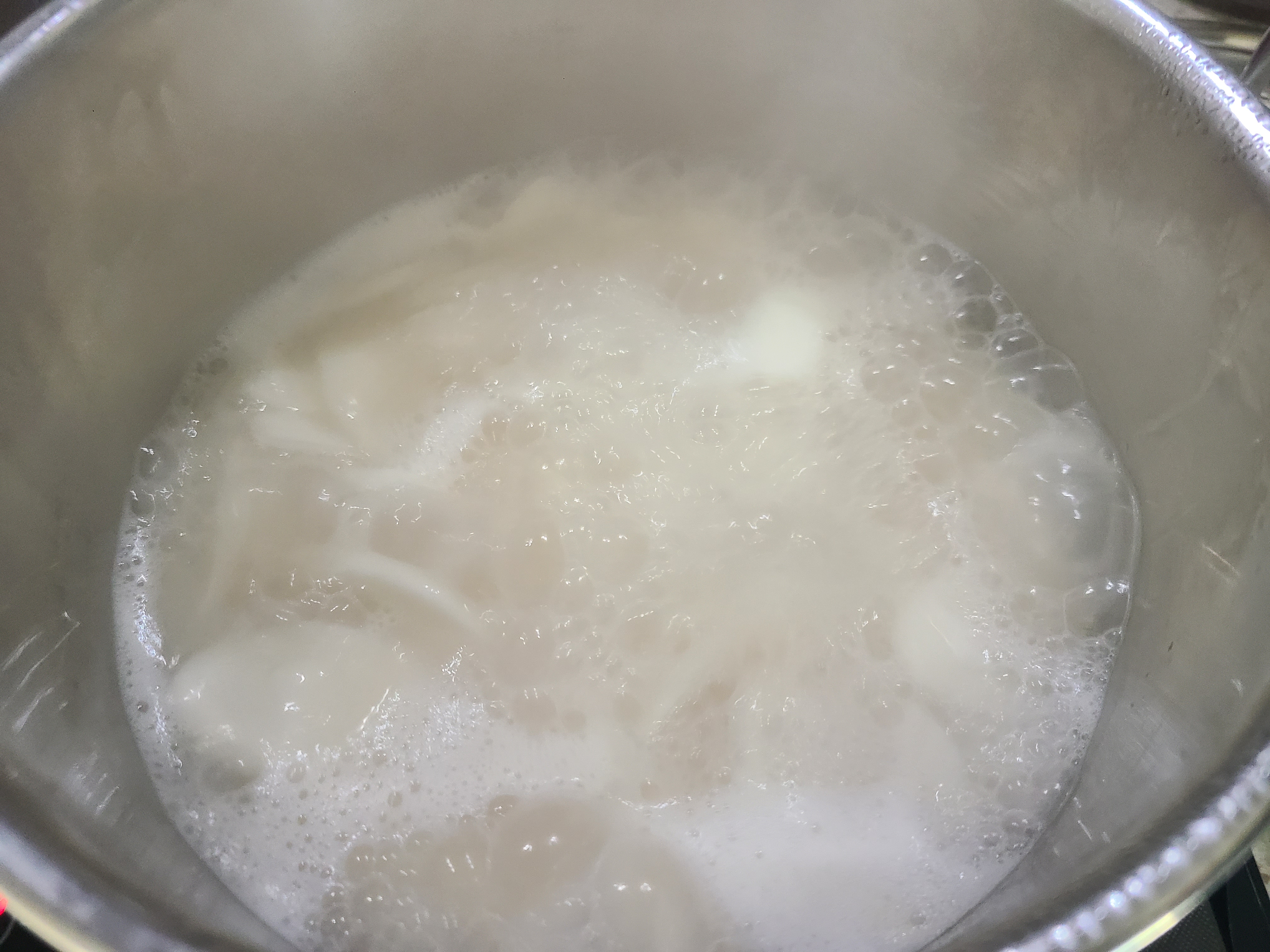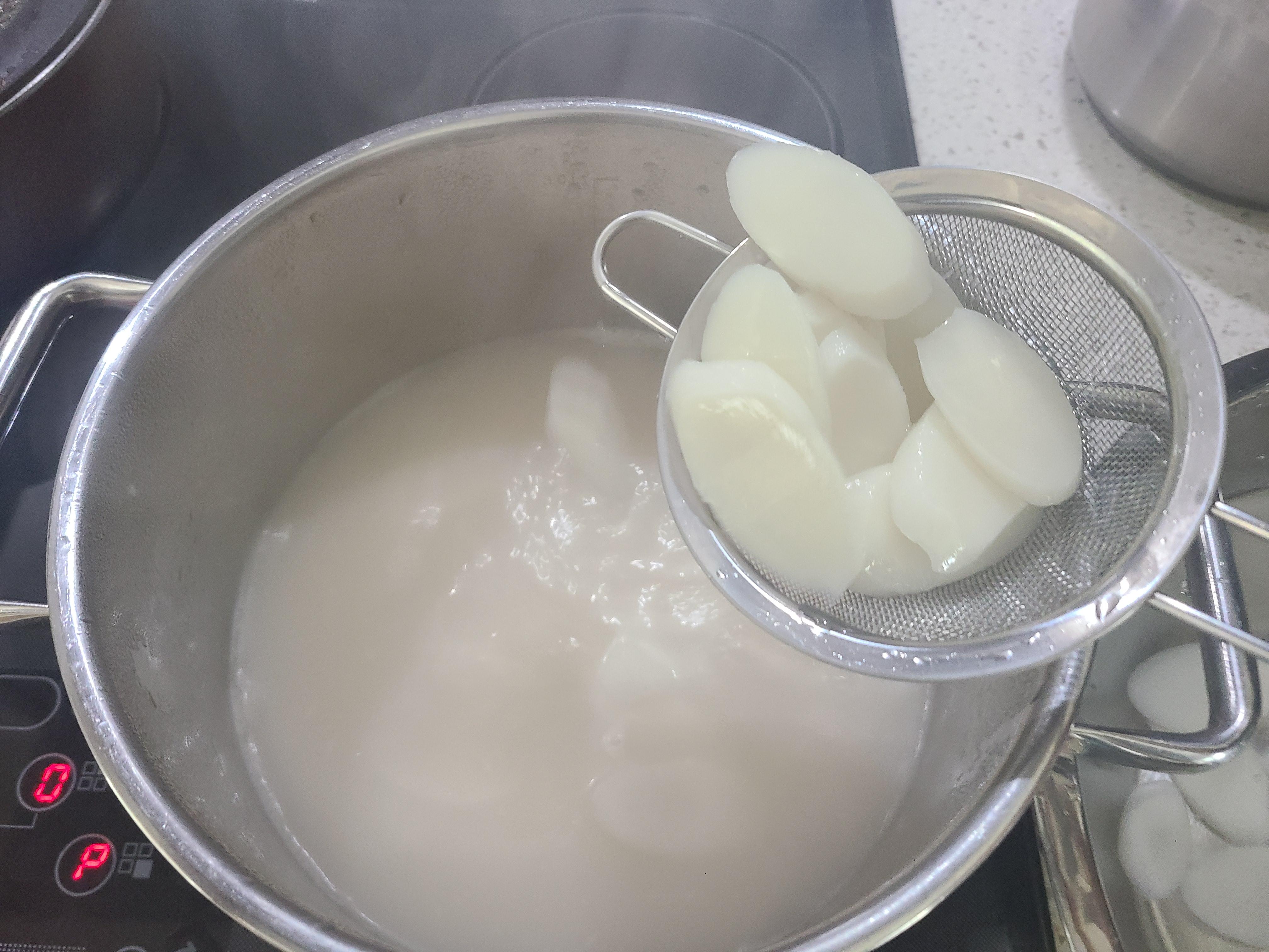 5. 사골 국물이 끓기 시작하면 물에 담아놓았던 흰떡을 체로 건져서 넣어준다.