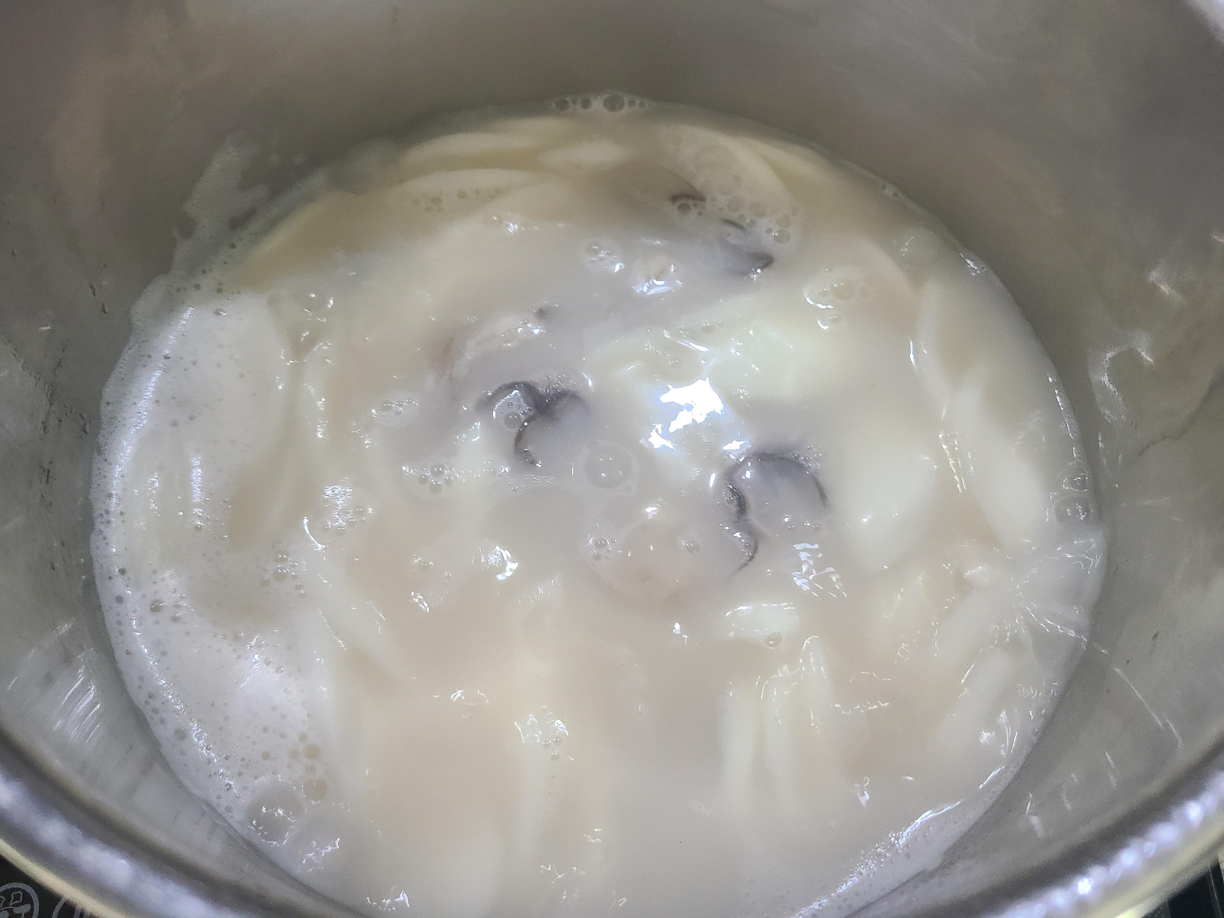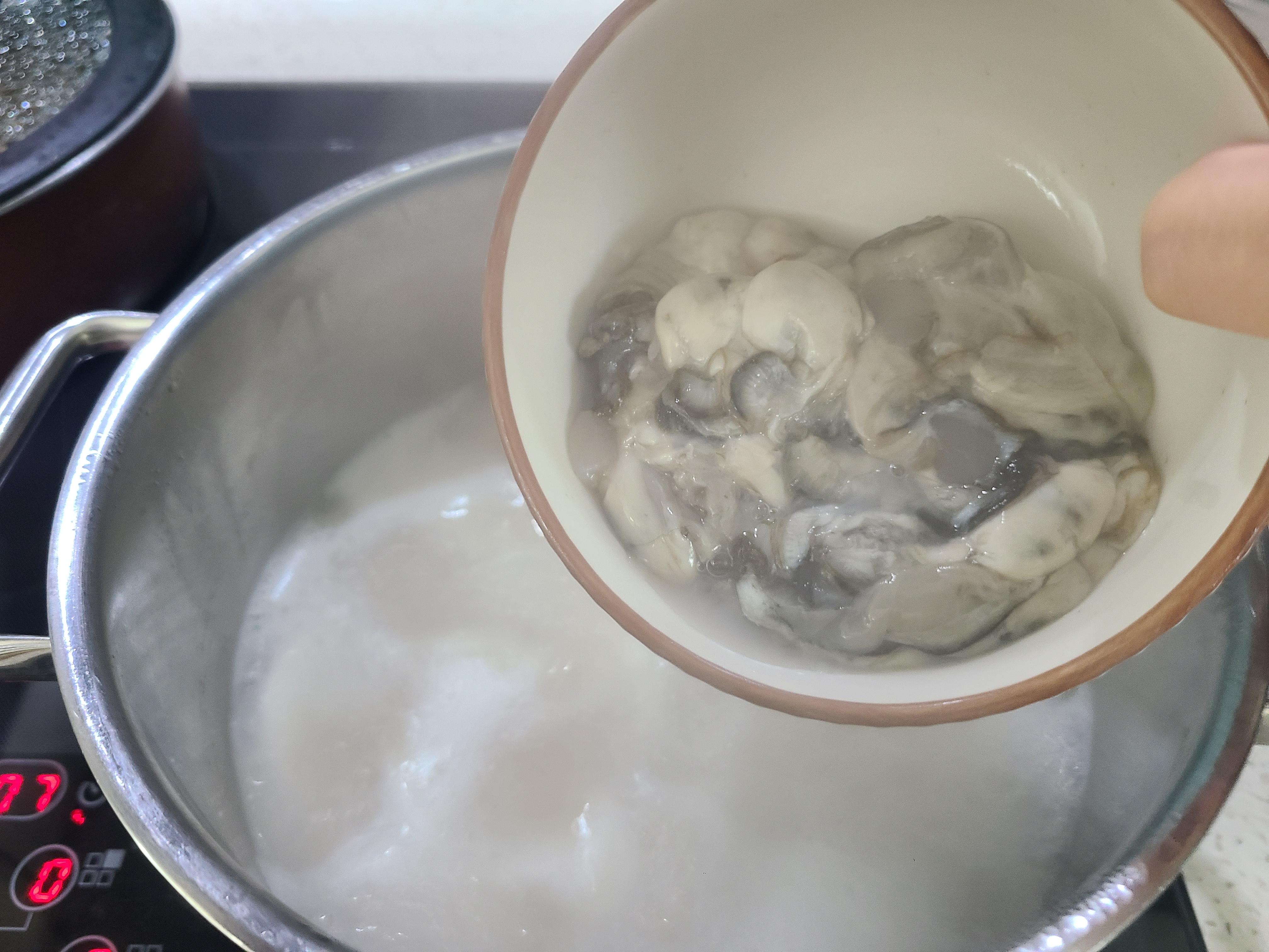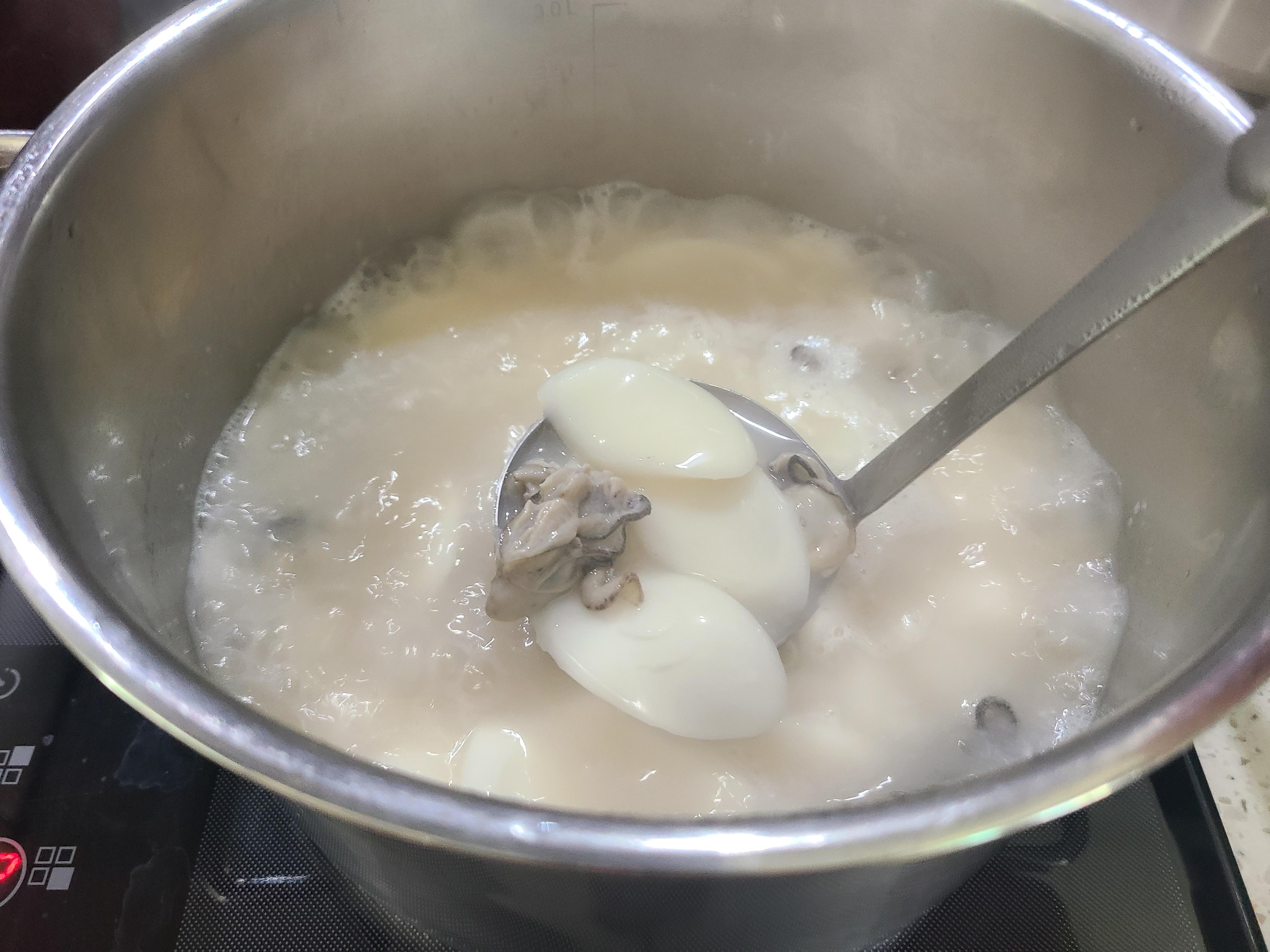 6. 흰떡을 넣고 5분 정도 끓인 후 세척해 놓은 생굴을 넣어준다.