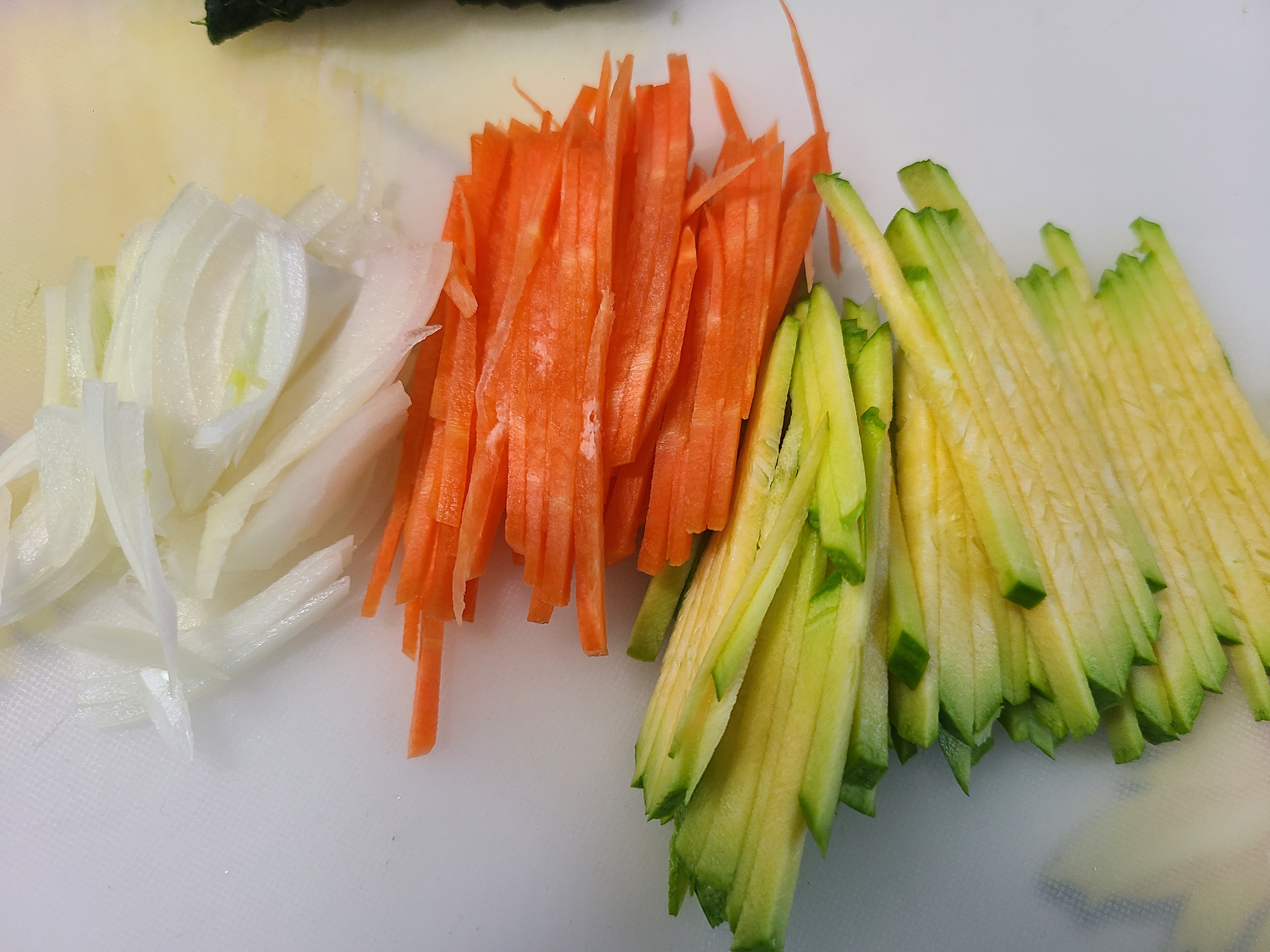 2. 집에 남아 있는 애호박, 당근, 양파를 채 썰어준다. 말린 새우가 있어 2큰술을 다져 함께 넣어주었다.