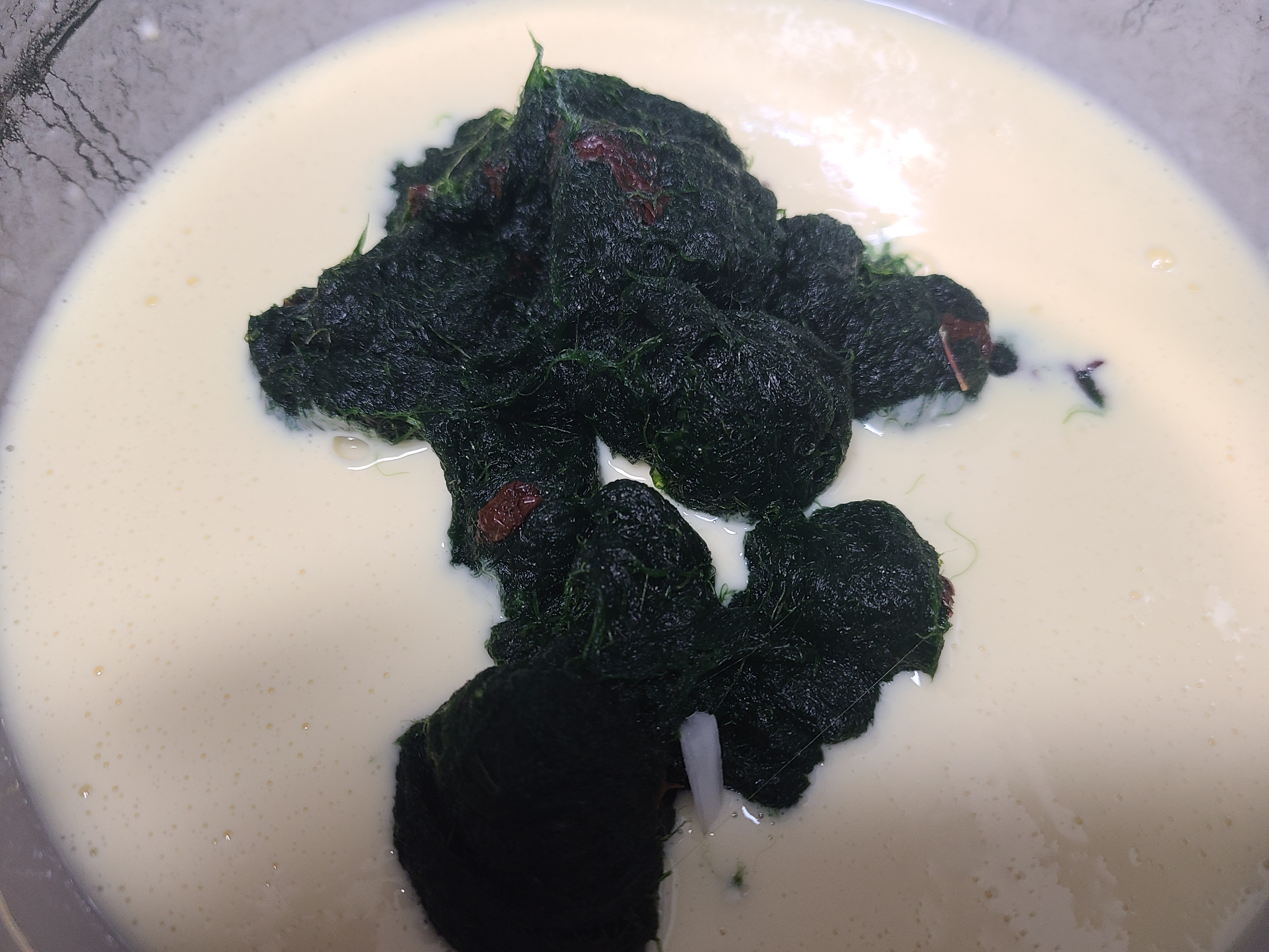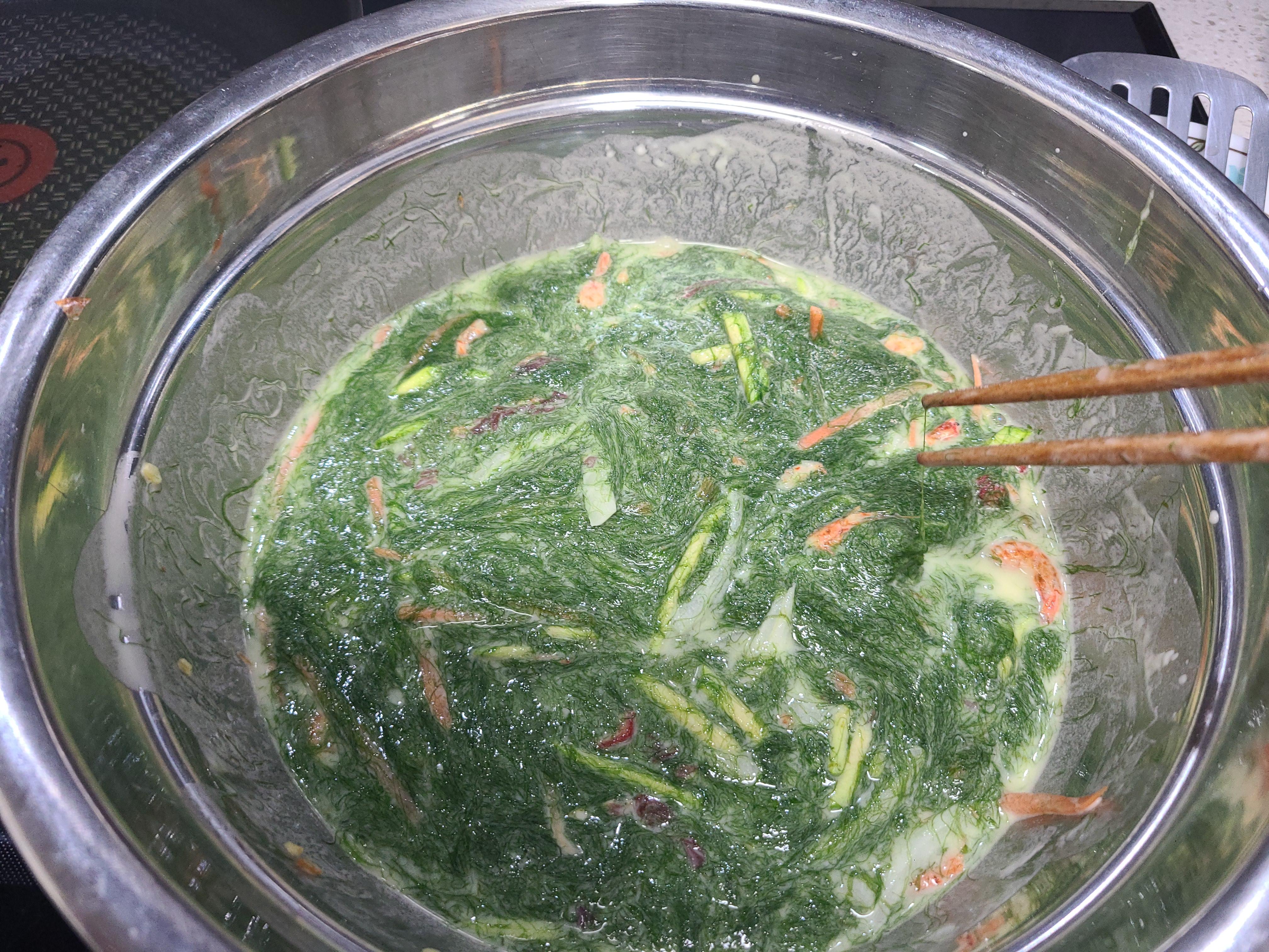 6. 썰어놓았던 매생이를 넣고 젓가락으로 풀어 반죽에 골고루 퍼지게 한다.