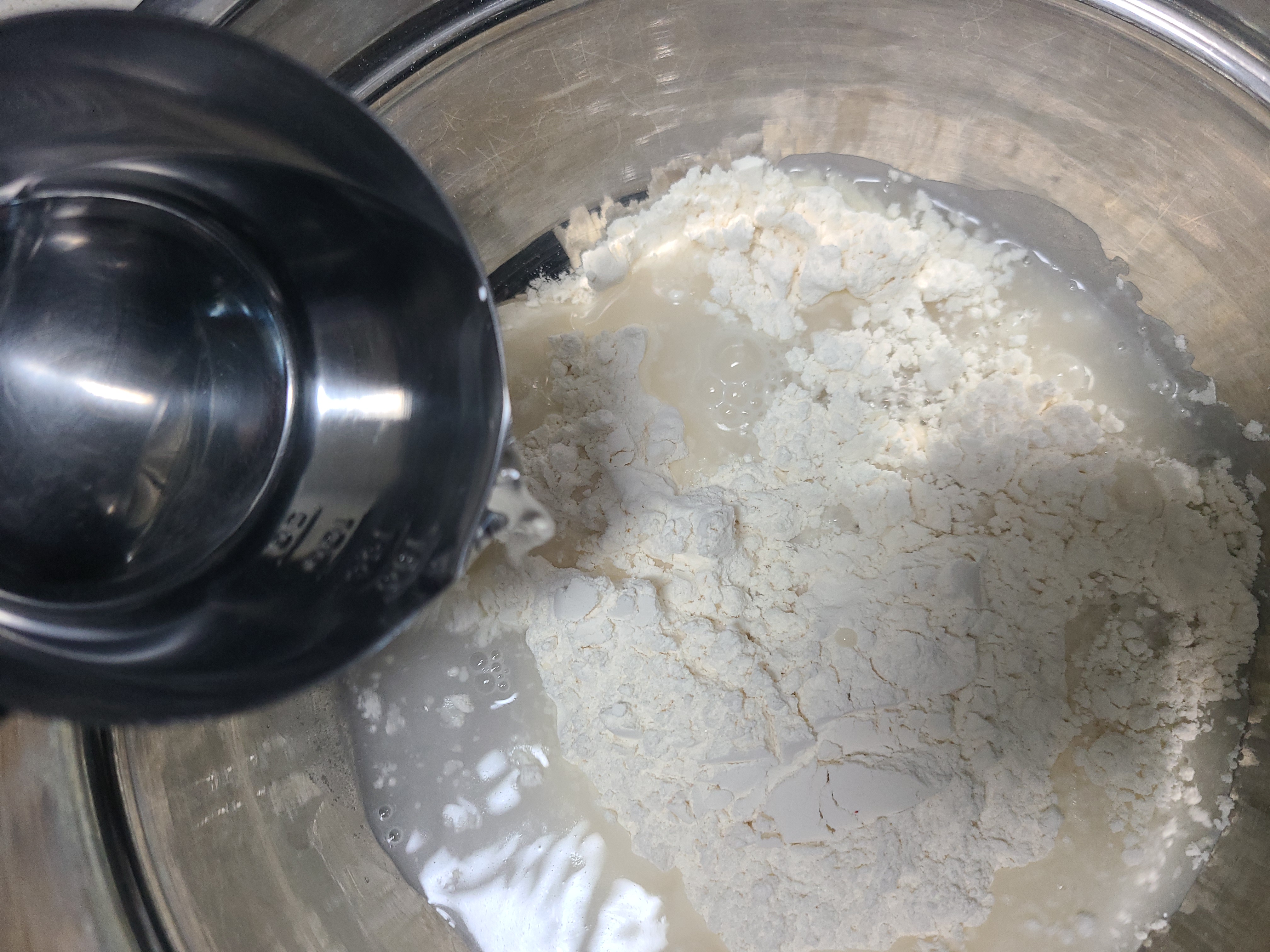 4. 부침가루 200ml에 생수 250ml를 붓고 계란 1개를 넣어 준다.