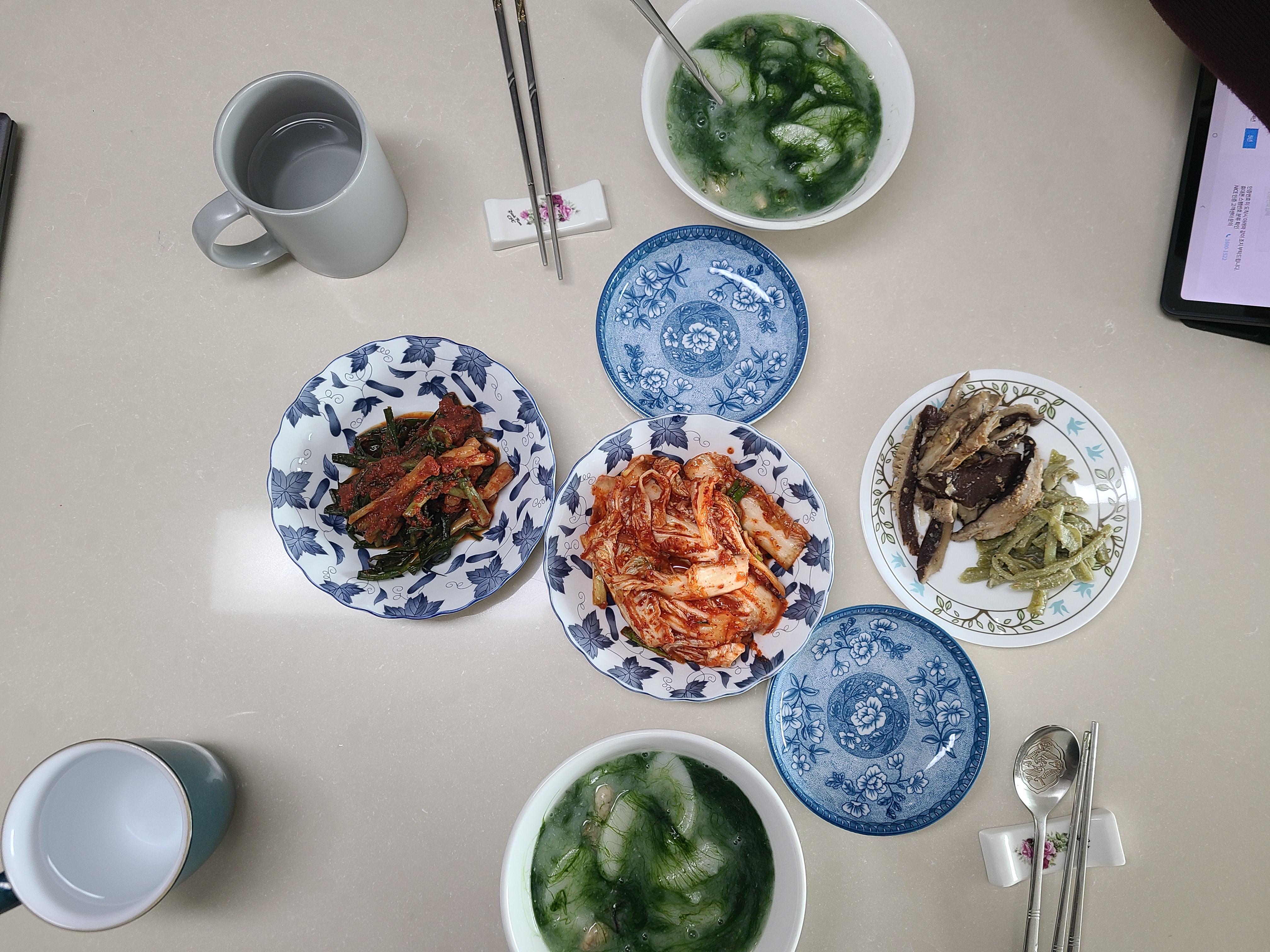 잘 익은 파김치와 전날 담근 배추 겉절이를 담아내고 표고버섯과 궁채 나물을 담아내어 한상을 차렸다.