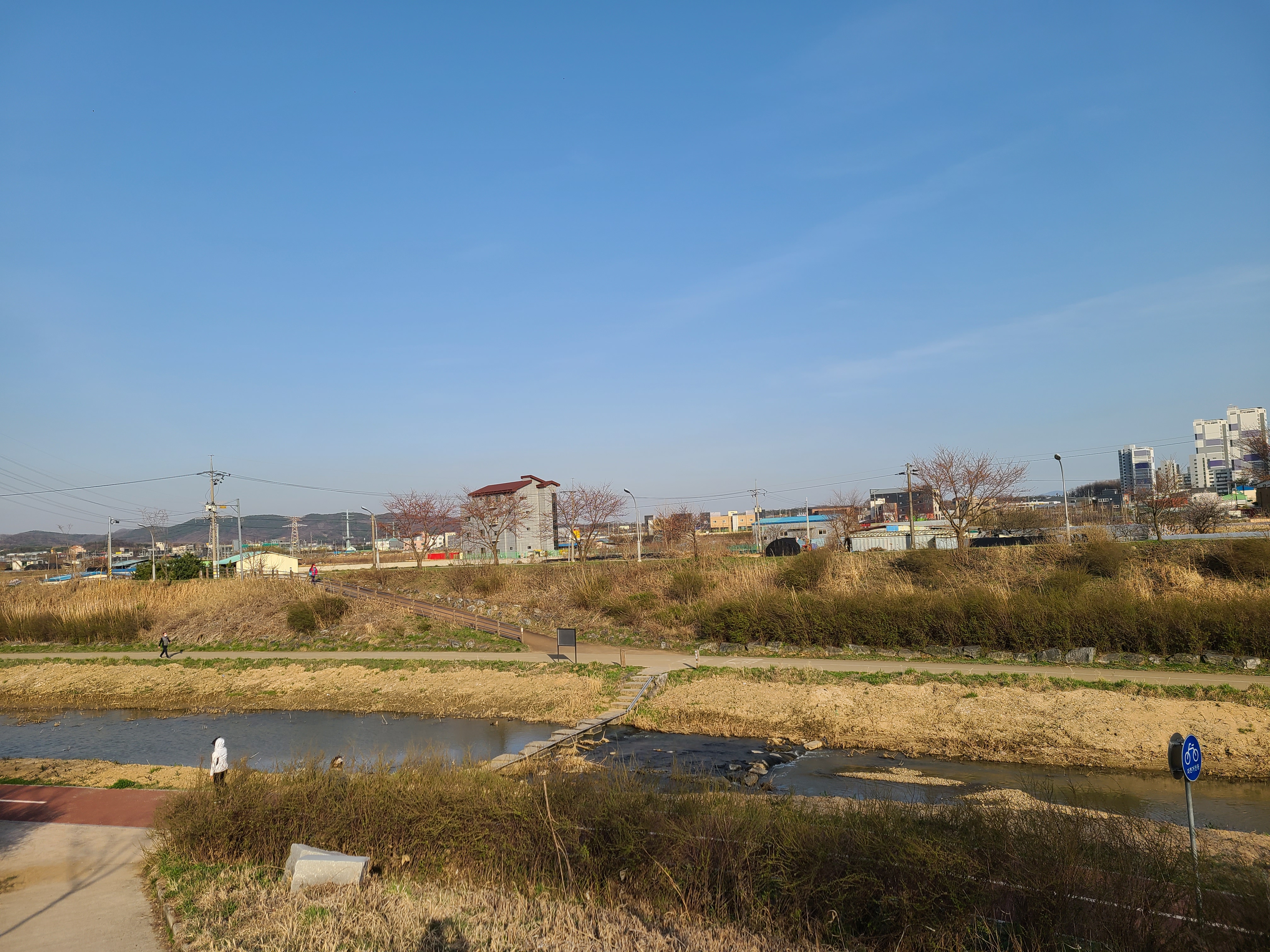 수촌마을에서 통복천을 따라 평택시내방향으로 걷다 보면 비포장길에서 포장길로 바뀌는데 이 구간부터 하천 옆으로 자전거도로가 시작된다.
