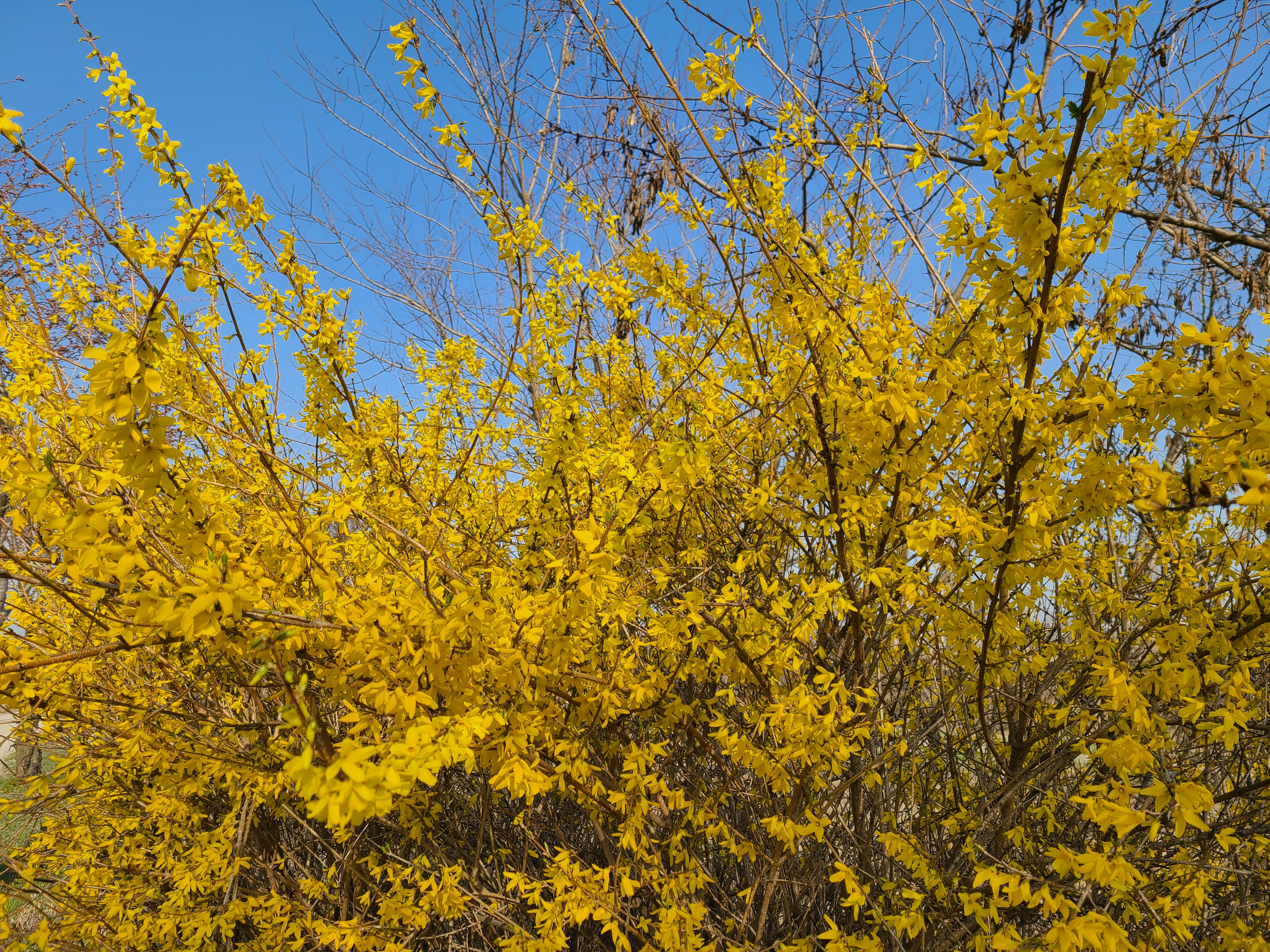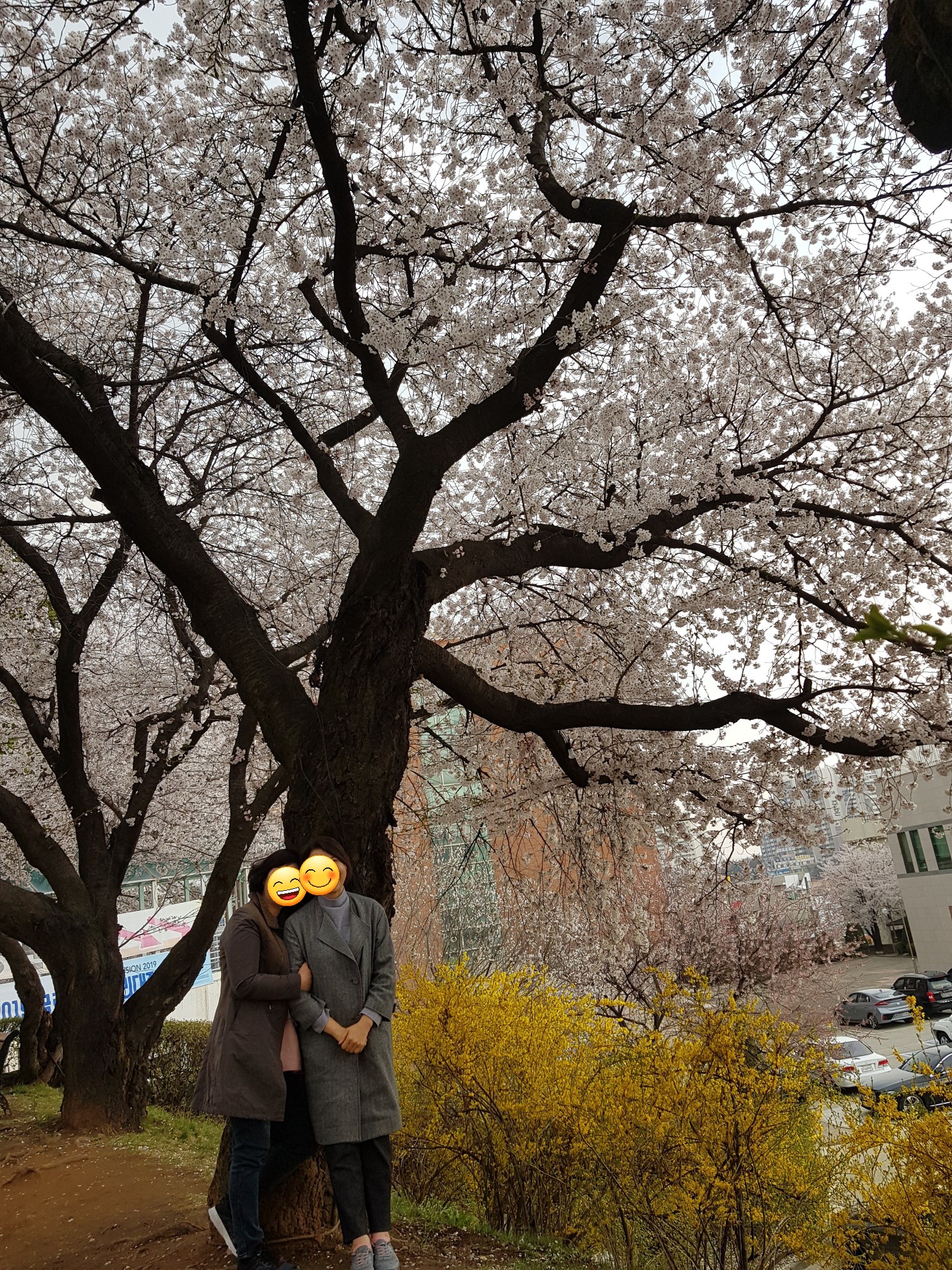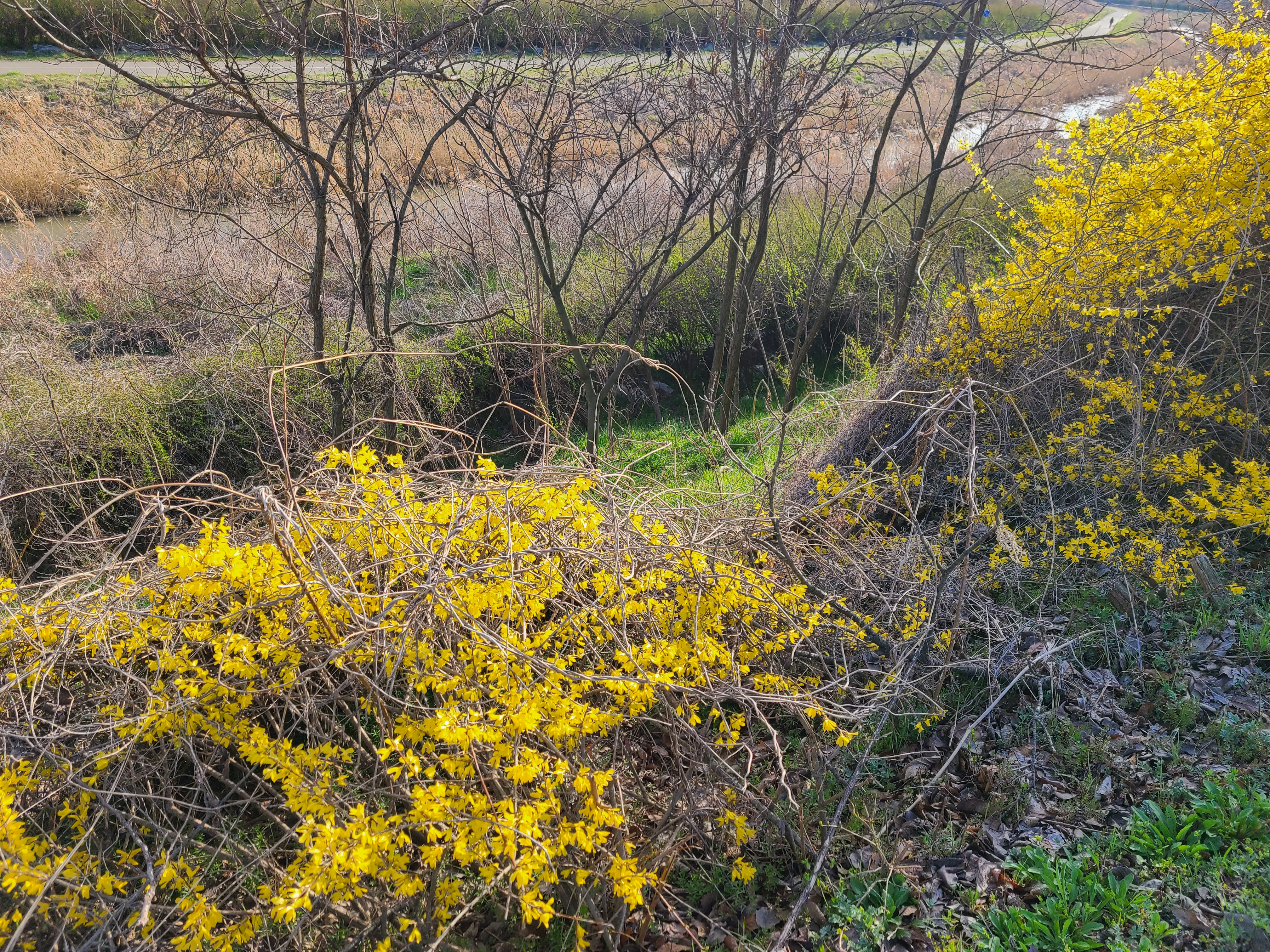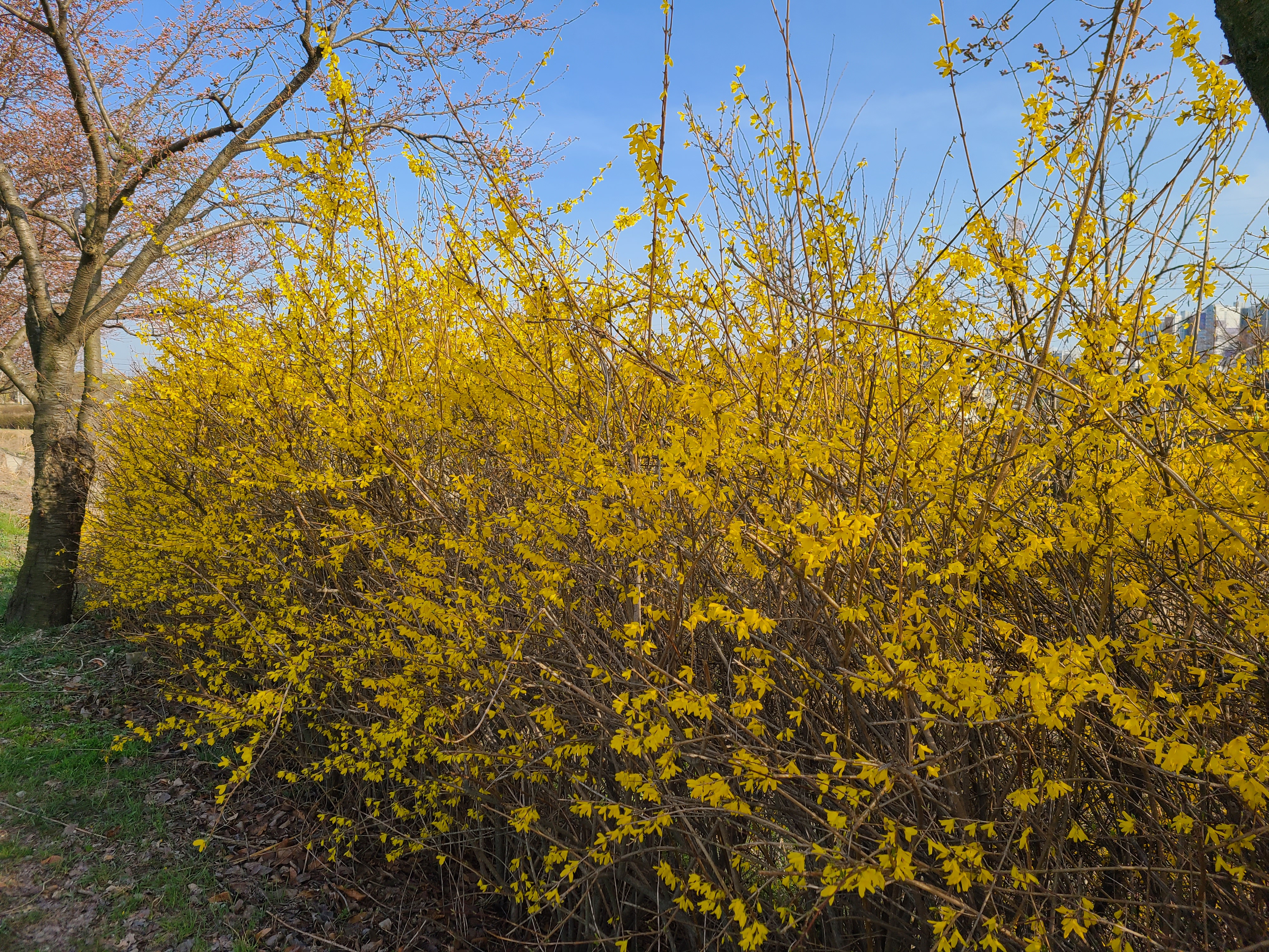 벚꽃나무 사이로 노란 개나리가 활짝 피어있다.