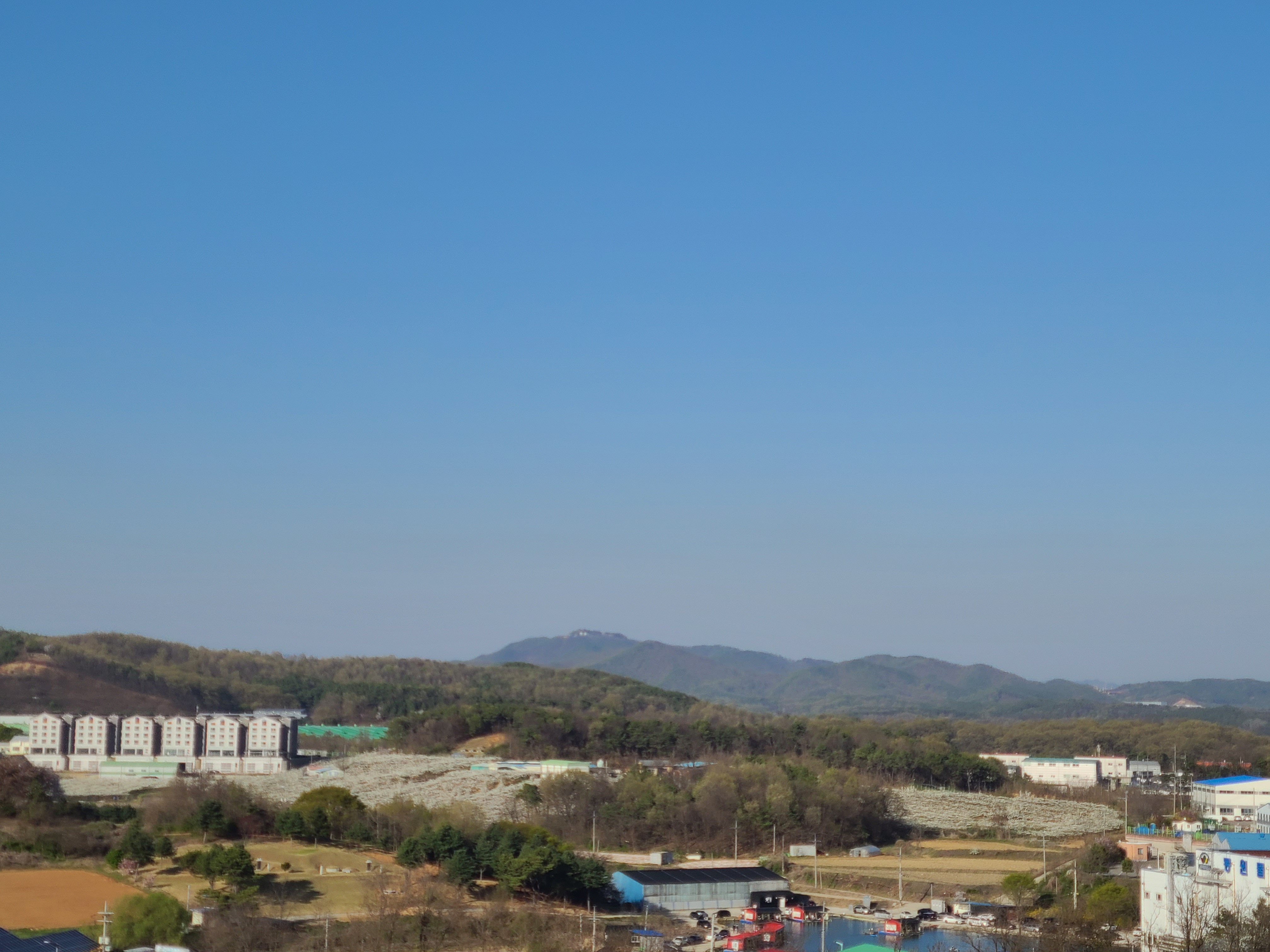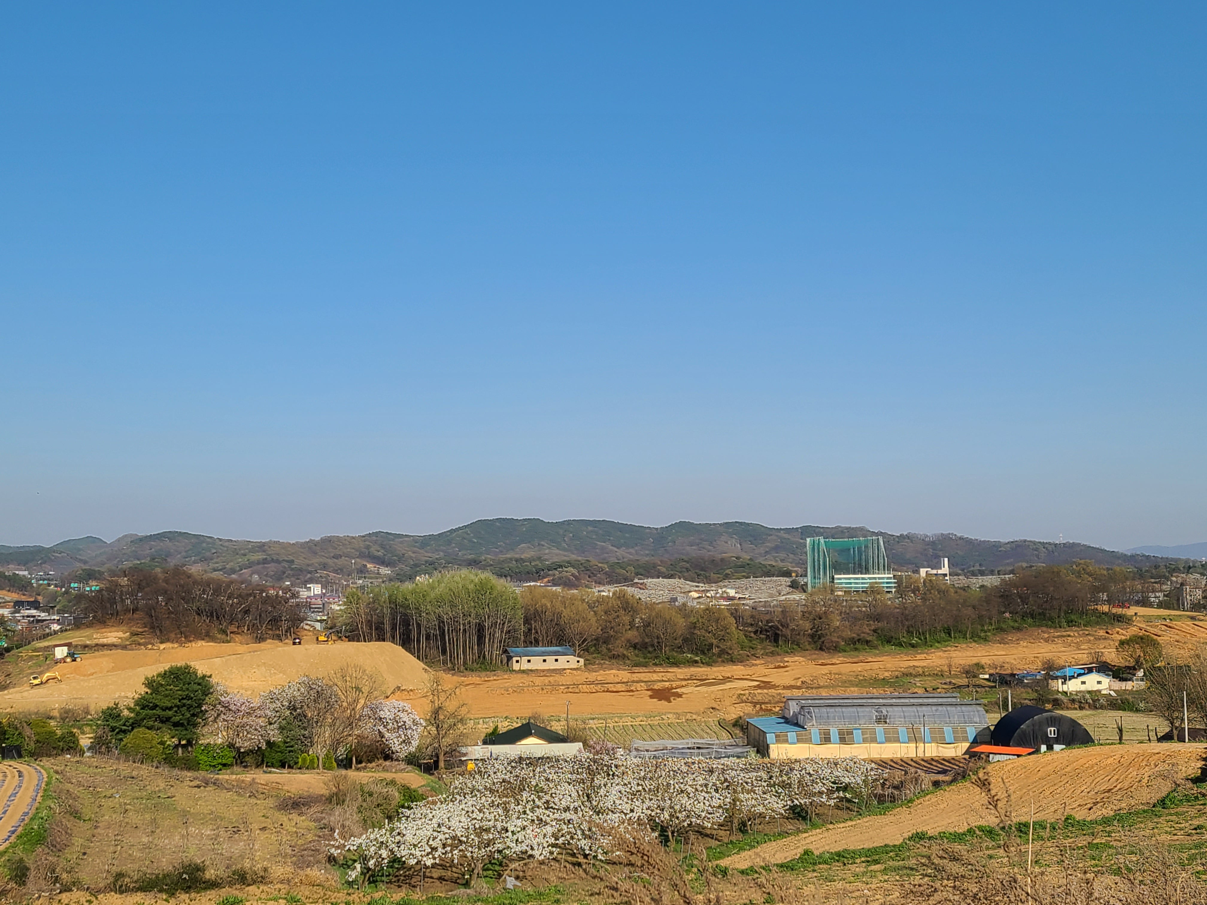 뒷동네 아파트 안쪽으로 전원주택단지가 건설 중인 것이 보이고, 평택 음성 간 고속도로 너머로 물류창고 단지와 브레인시티 개발 중인 도일동이 보인다.