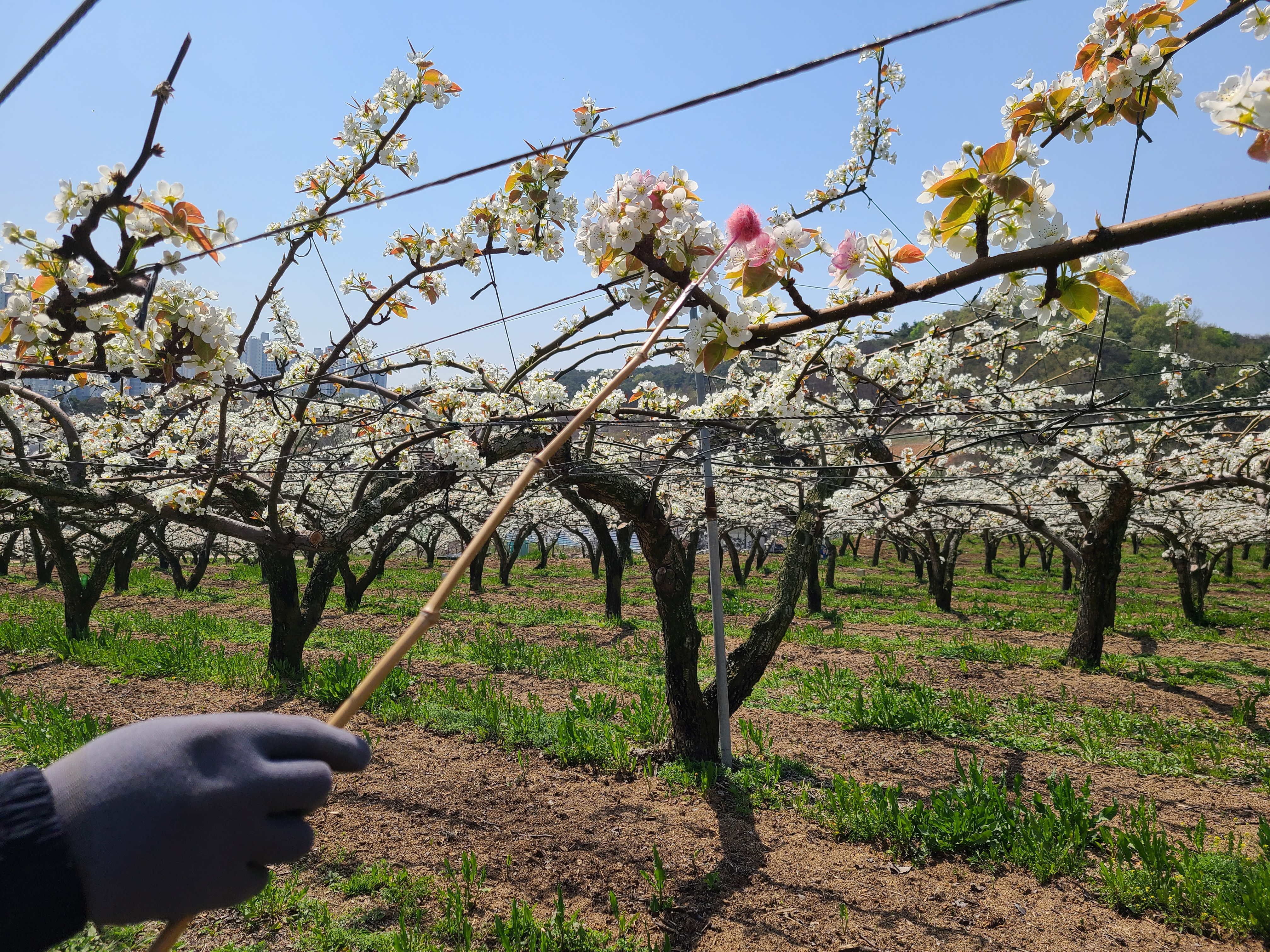 마침 배 과수원에서 사람들이 인공수분을 시키고 있었다. 면봉에 꽃가루를 묻혀 배꽃에 발라주고 있다.