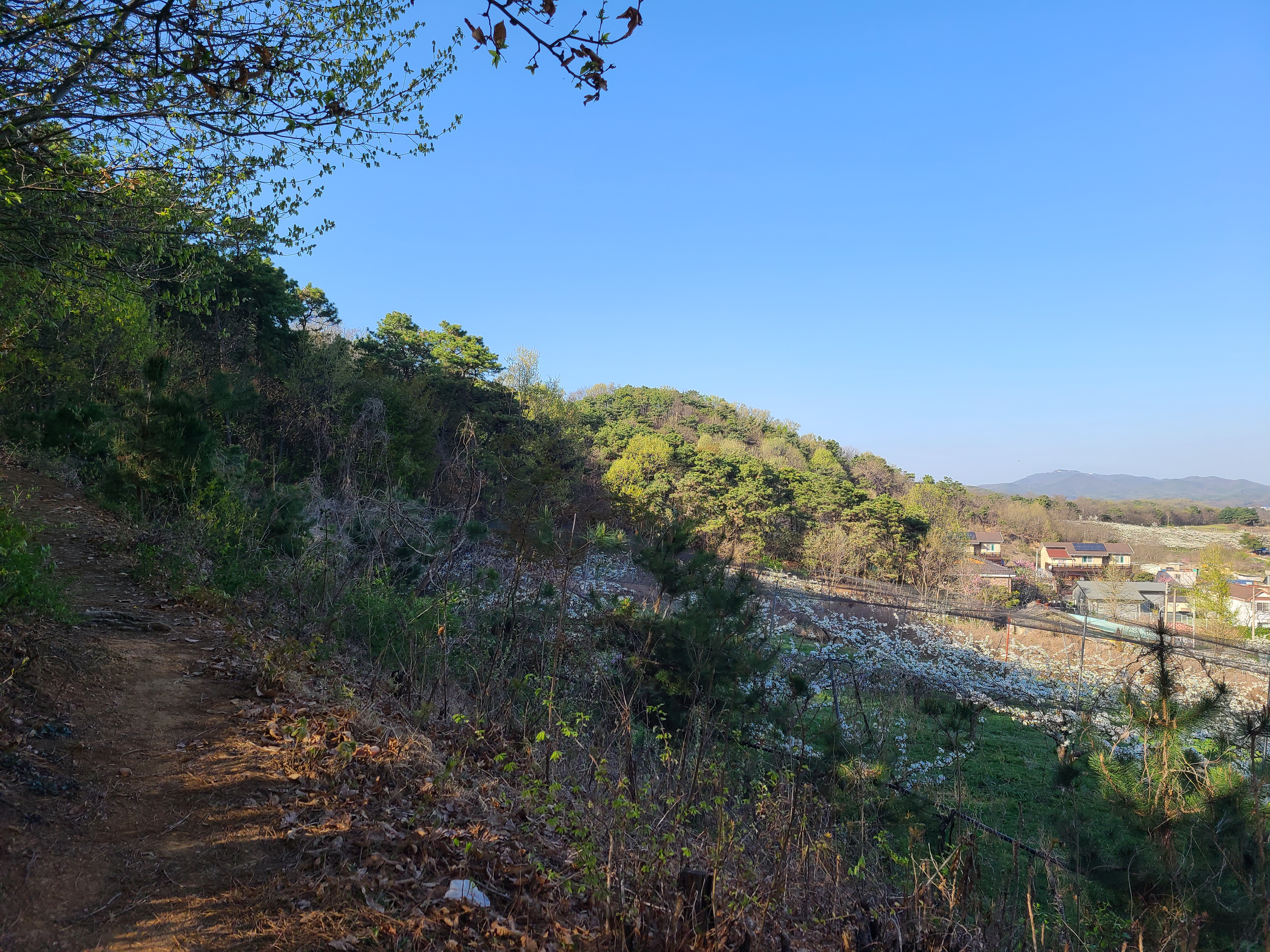 뒷동산 능선을 따라 걸으면 왼쪽으로 뒷동네에 있는 배나무 과수원도 보이는데 이곳도 배꽃이 활짝 피어있다.