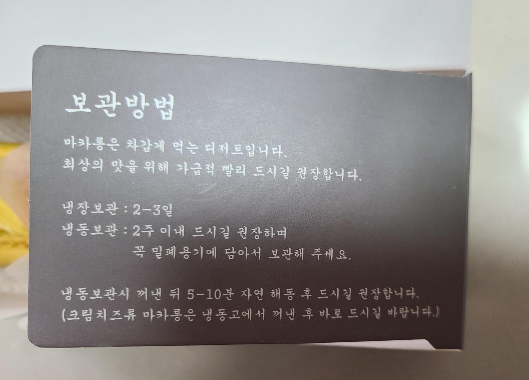 마카롱을 구매해서 집에서 먹을 때는 보관이 중요하다. 포장 박스에 친절하게 보관 방법을 적어 놓았다. 바로 먹지 않을 경우는 냉동실에 보관 후 냉장실에서 해동해서 먹는 것을 추천한다. 이번에 구매한 마카롱은 랜덤으로 구성된 5개 1세트 구성이라 저렴한 가격에 구매했다. 가나다라 마카롱 답게 비주얼도 맛집이다. 딸이 와서 따뜻한 아메리카노와 마카롱을 먹으며 좋아할 생각을 하니 기분이 좋아진다. 가족들과 티 타임 시 마카롱을 곁들이는 것을 추천한다.