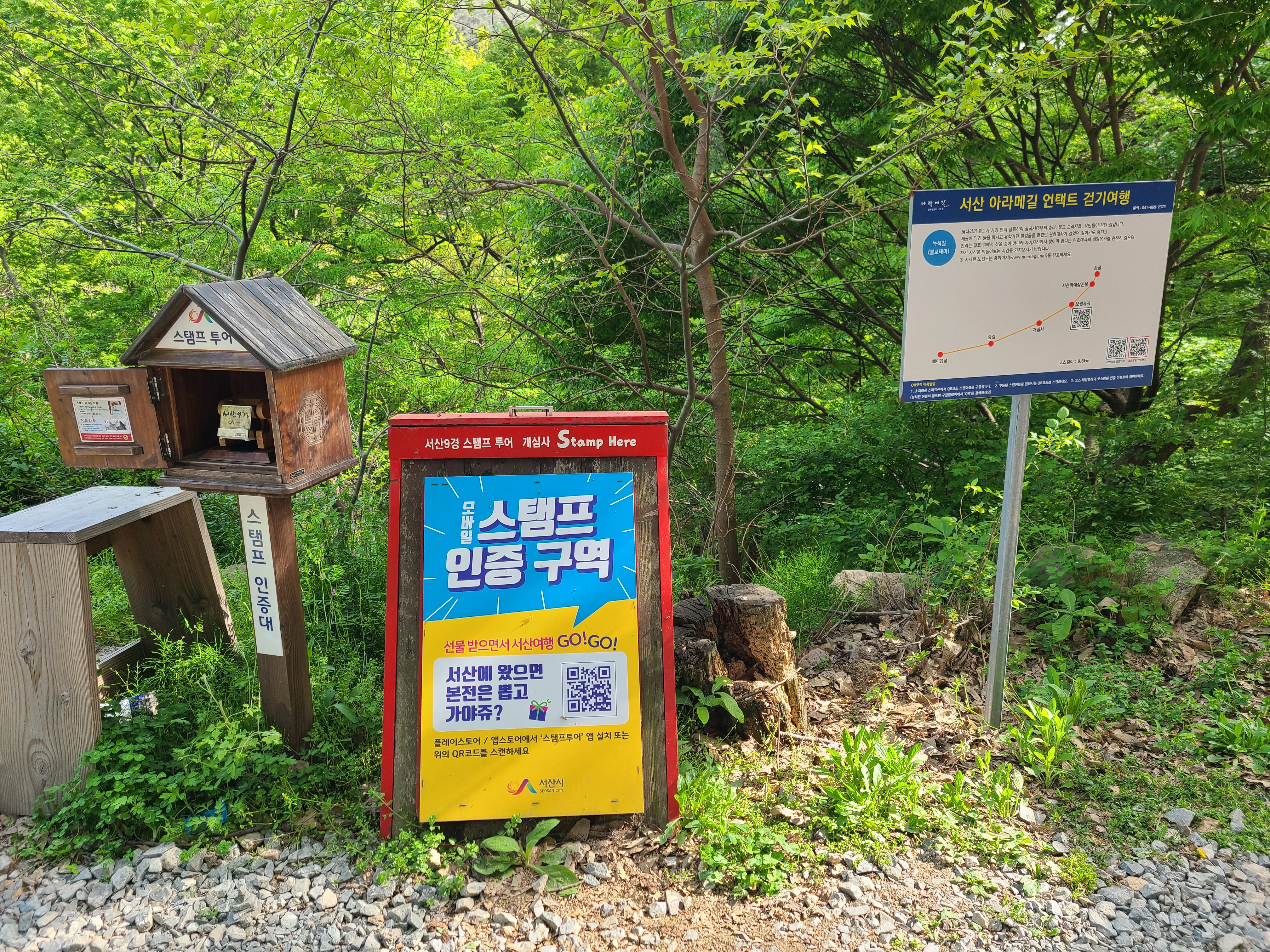 개심사에 내려올 때는 스탬프 인증대 오른쪽으로 향토숲(충남의 아름다운 100대 소나무 숲) 길을 즐기며 주차장으로 내려올 수 있다.