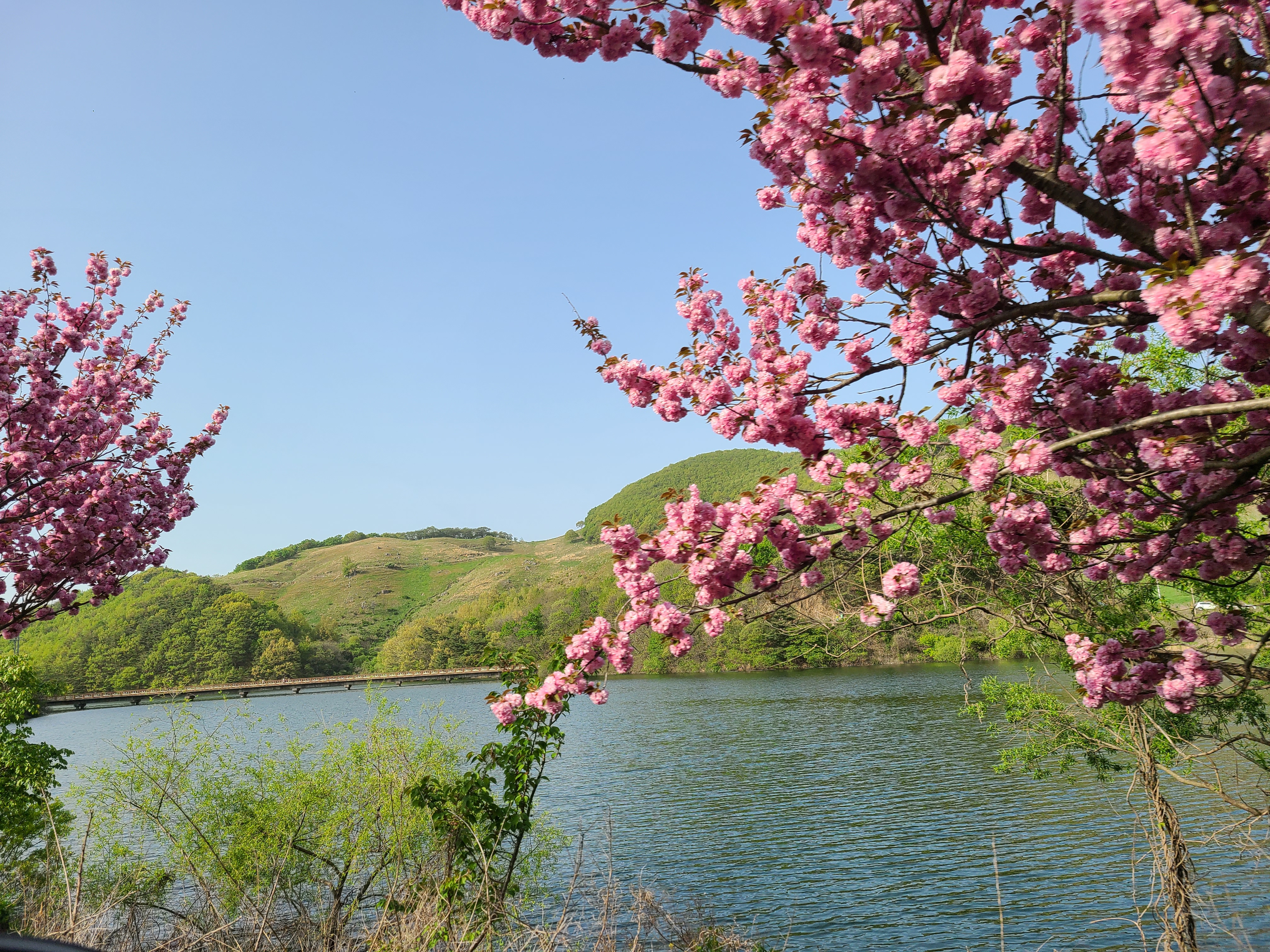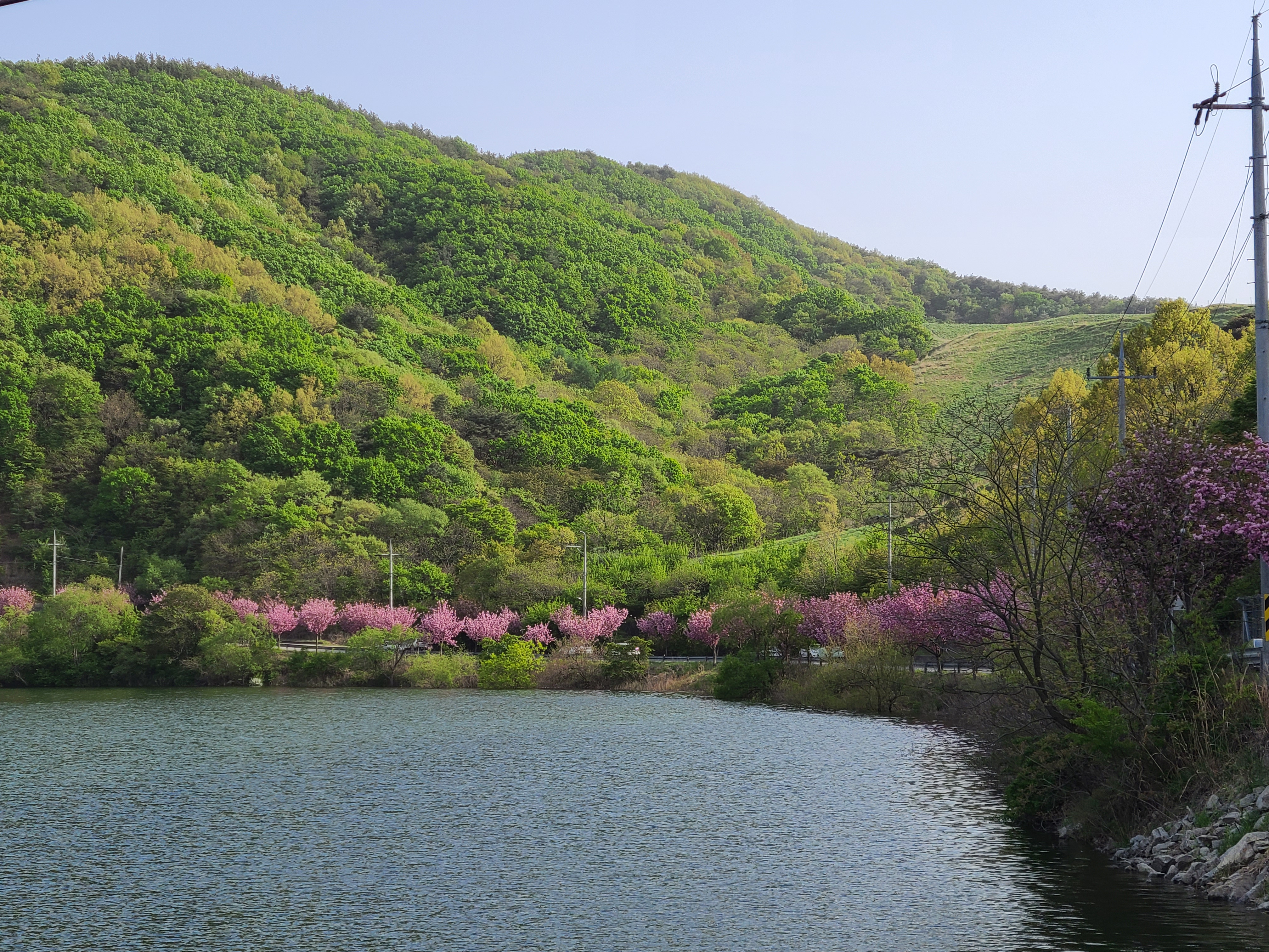 개심사에서 나와 신창 저수지를 오른쪽으로 두고 나오는데 왕벚꽃과 저수지 그리고 목장의 푸르름이 너무 아름답다.