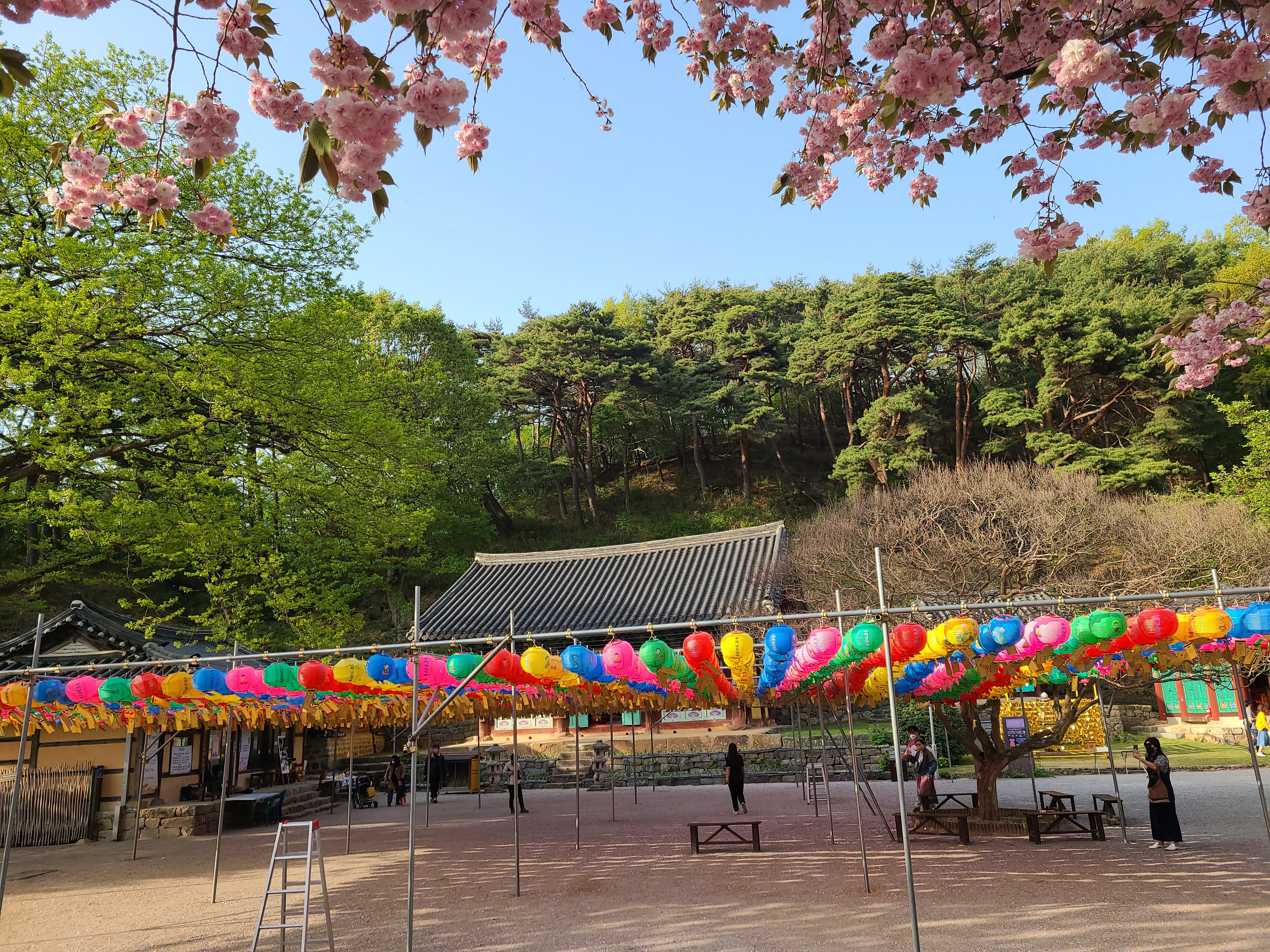 서산 문수사 극락보전 뜰에는 연등을 가득 달아 놓았다.