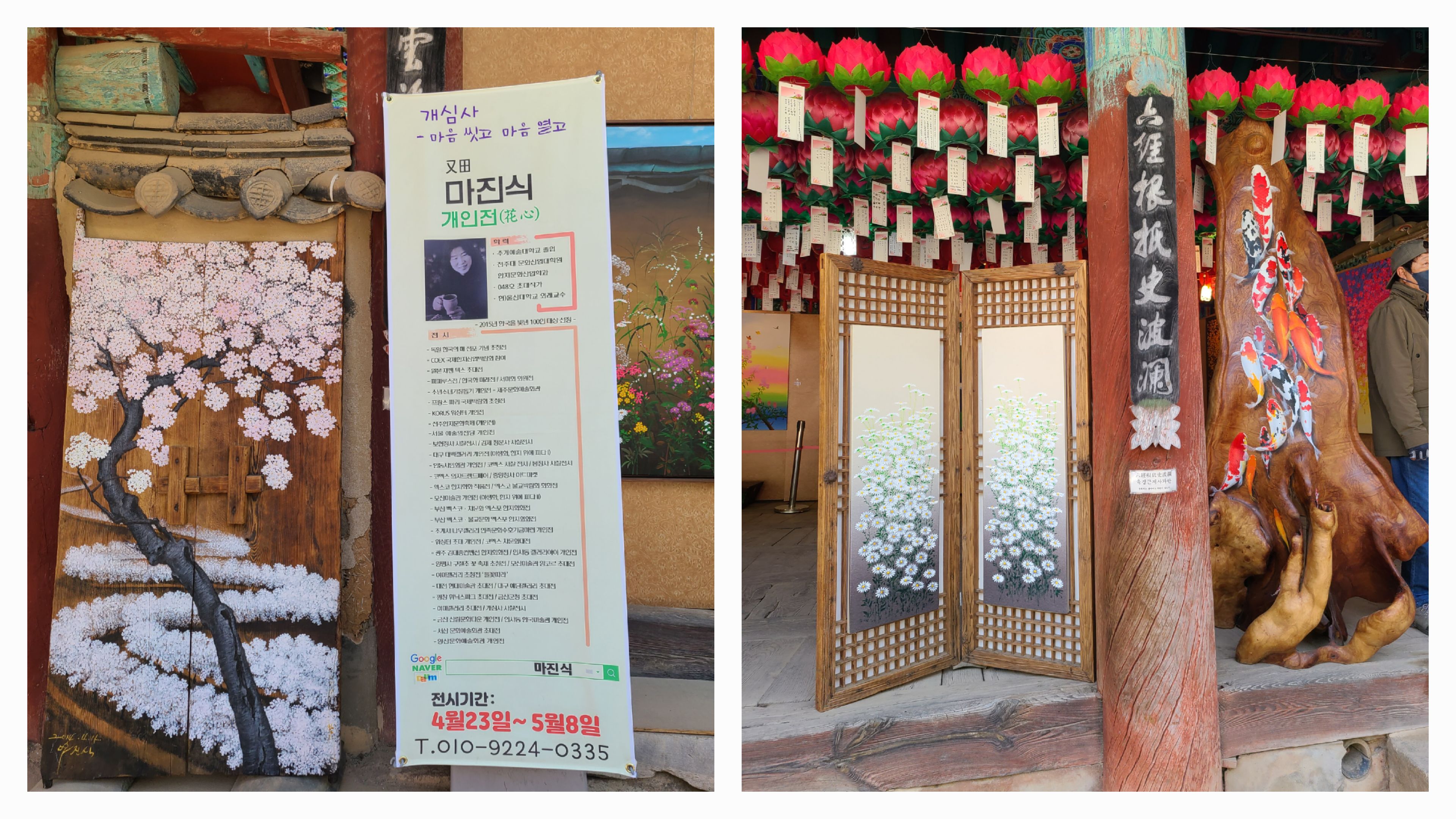 해탈문 옆 공간에는 마진식 작가의 한지 회화 야생화 전시회가 열리고 있었다. 5월 8일까지 전시하는 듯하다. 개심사의 왕벚꽃과 너무도 잘 어울리는 듯하다.