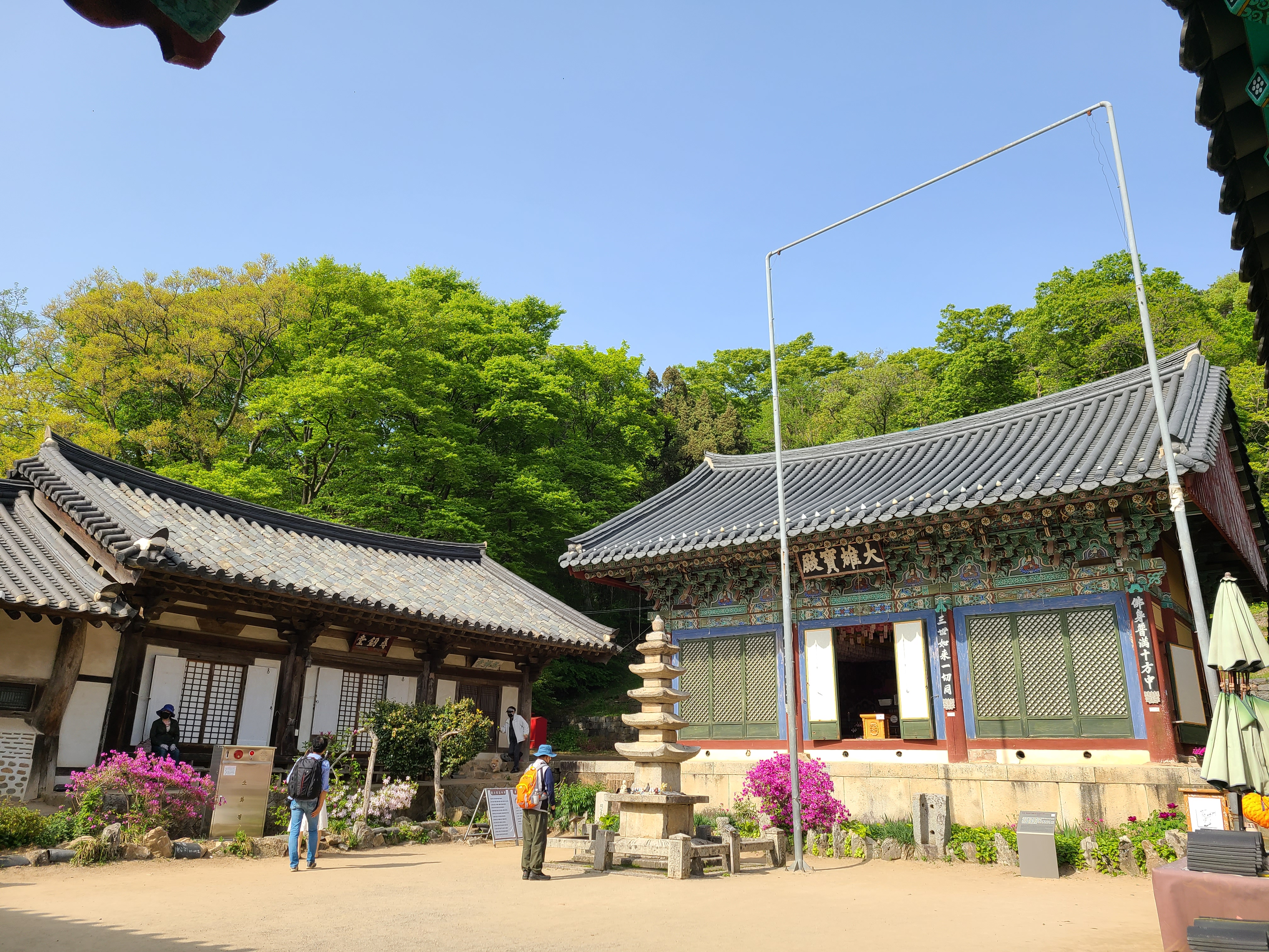 해탈문을 들어서니 서산 개심사 대웅전과 스님들이 생활하며 수행하는 건물인 심검당이 있다. 심검당 앞 뜰에 자목련과 철쭉이 피어있다.