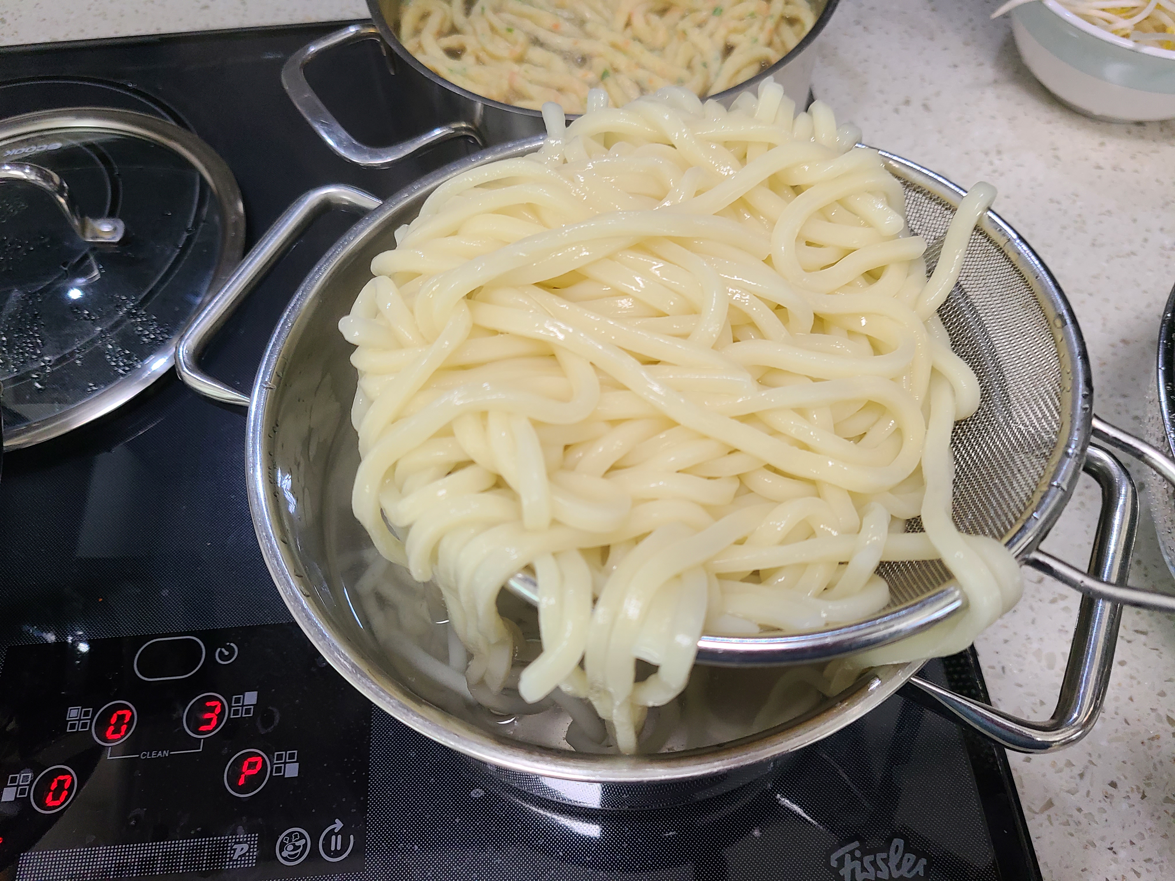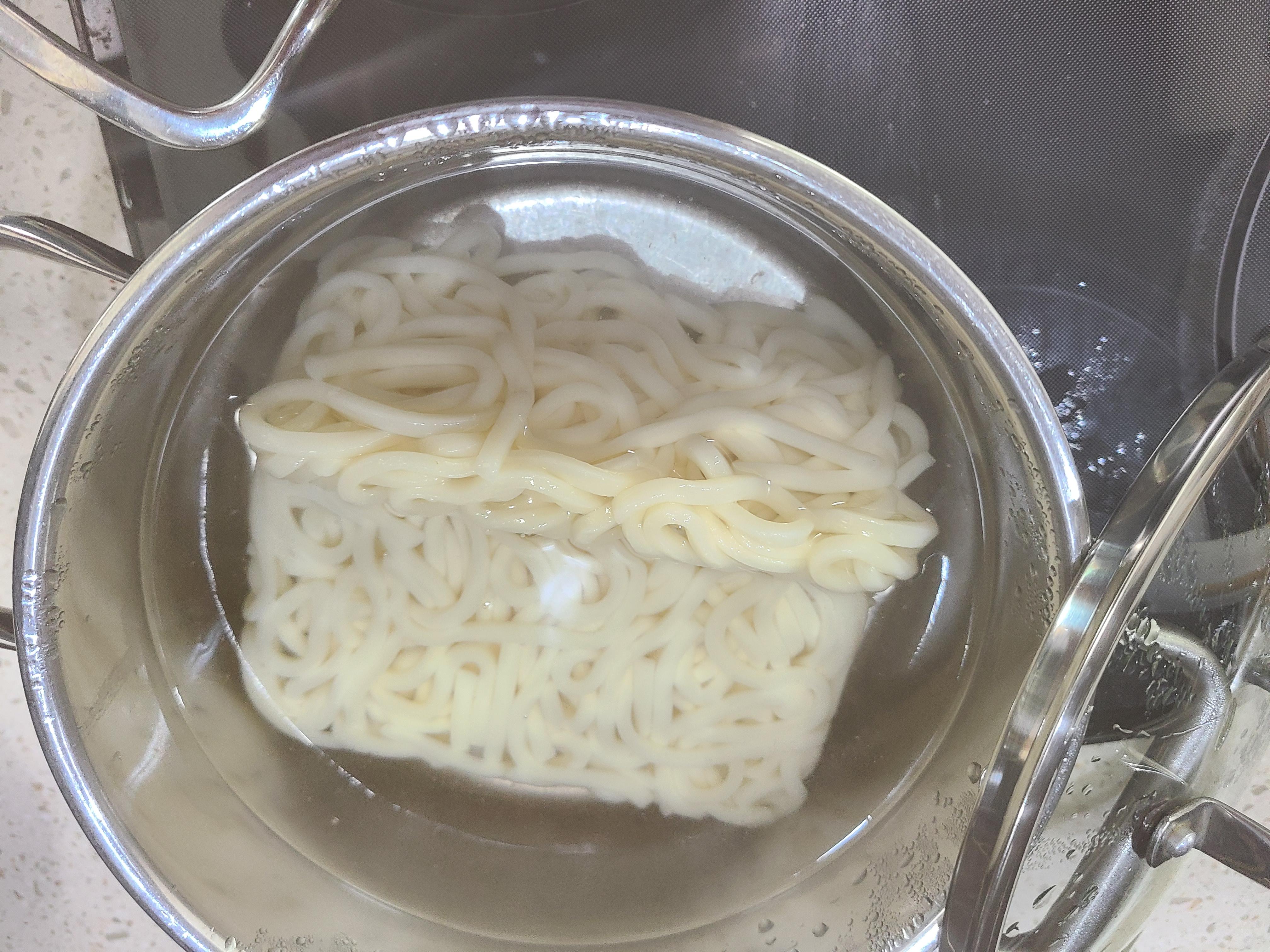1. 사누끼 우동면은 냉동상태에 있는 것을 팔팔 끓는 물에 1분 넣었다 소쿠리에 건져 물기를 뺀다.