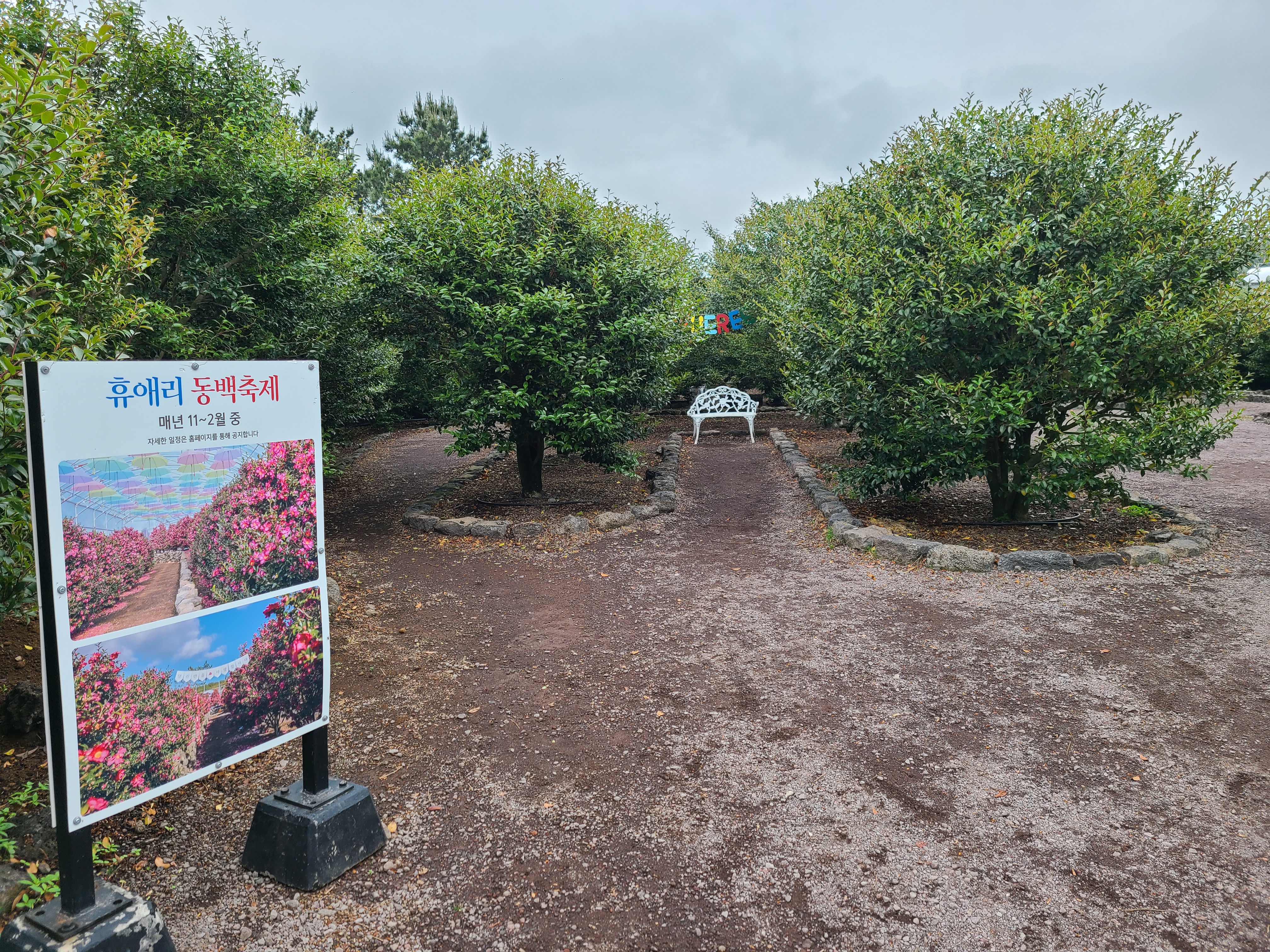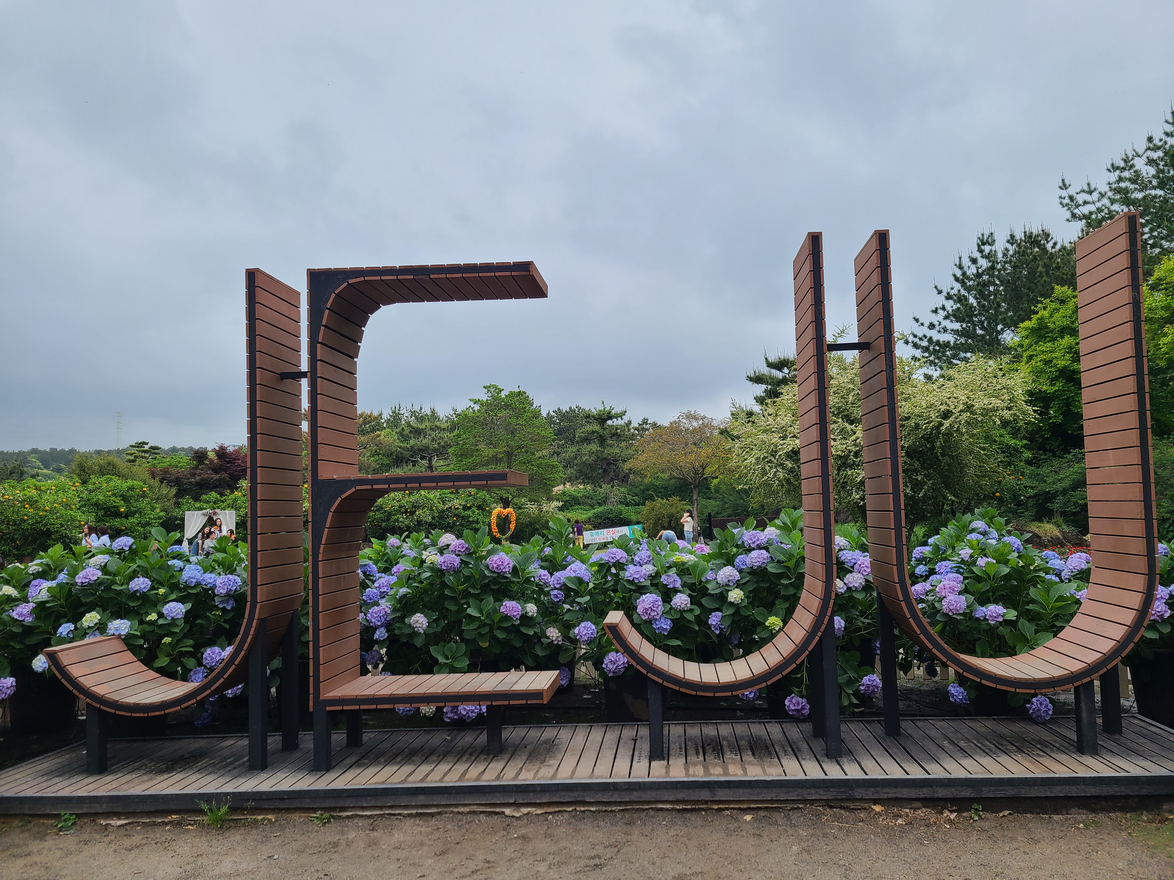 수국 올레길을 지나면 제주(JEJU), 제주 휴애리, 감귤 장식, 감귤 하트 등 여러 모양의 포토존이 있는 공원이 있다.