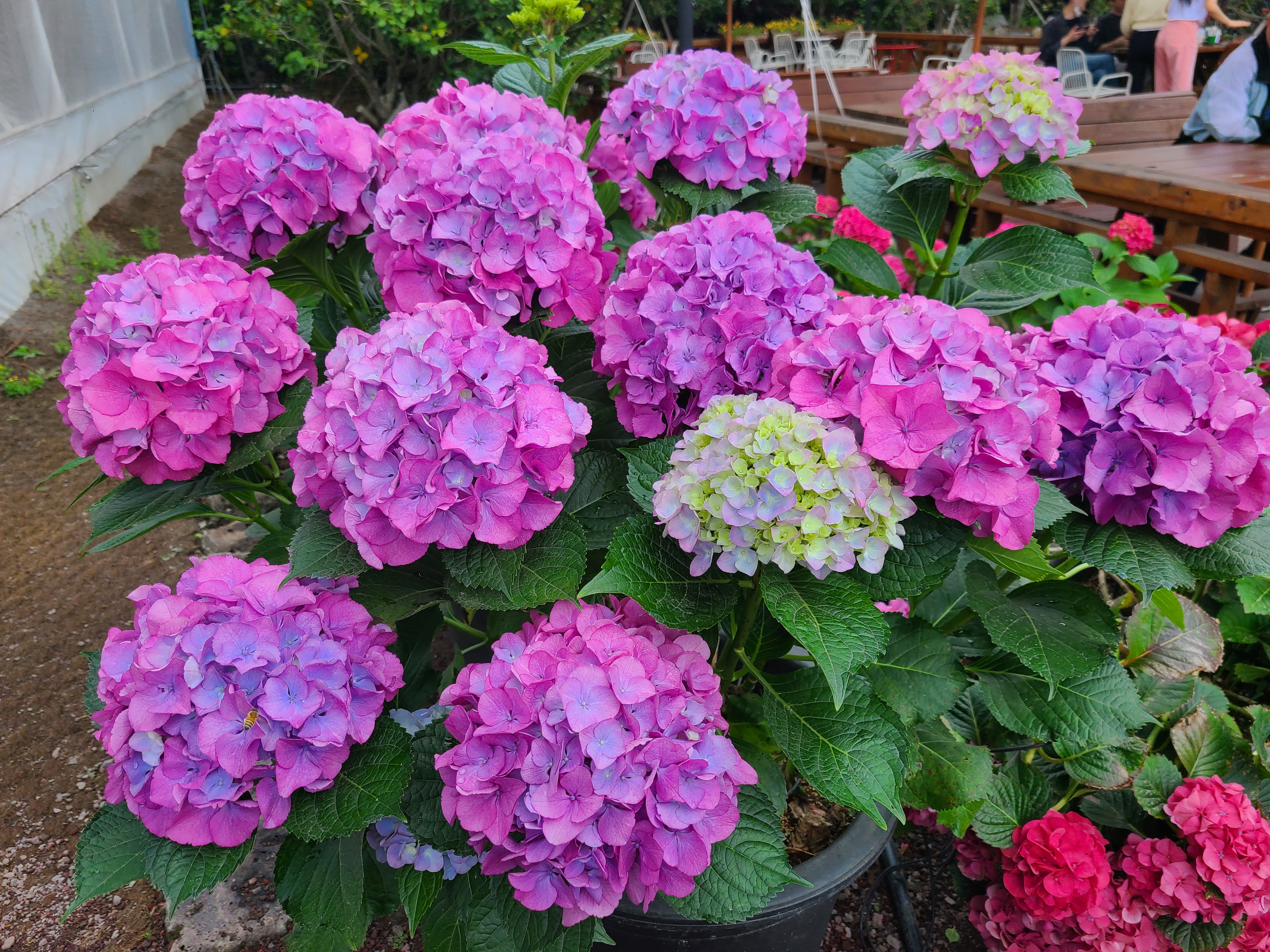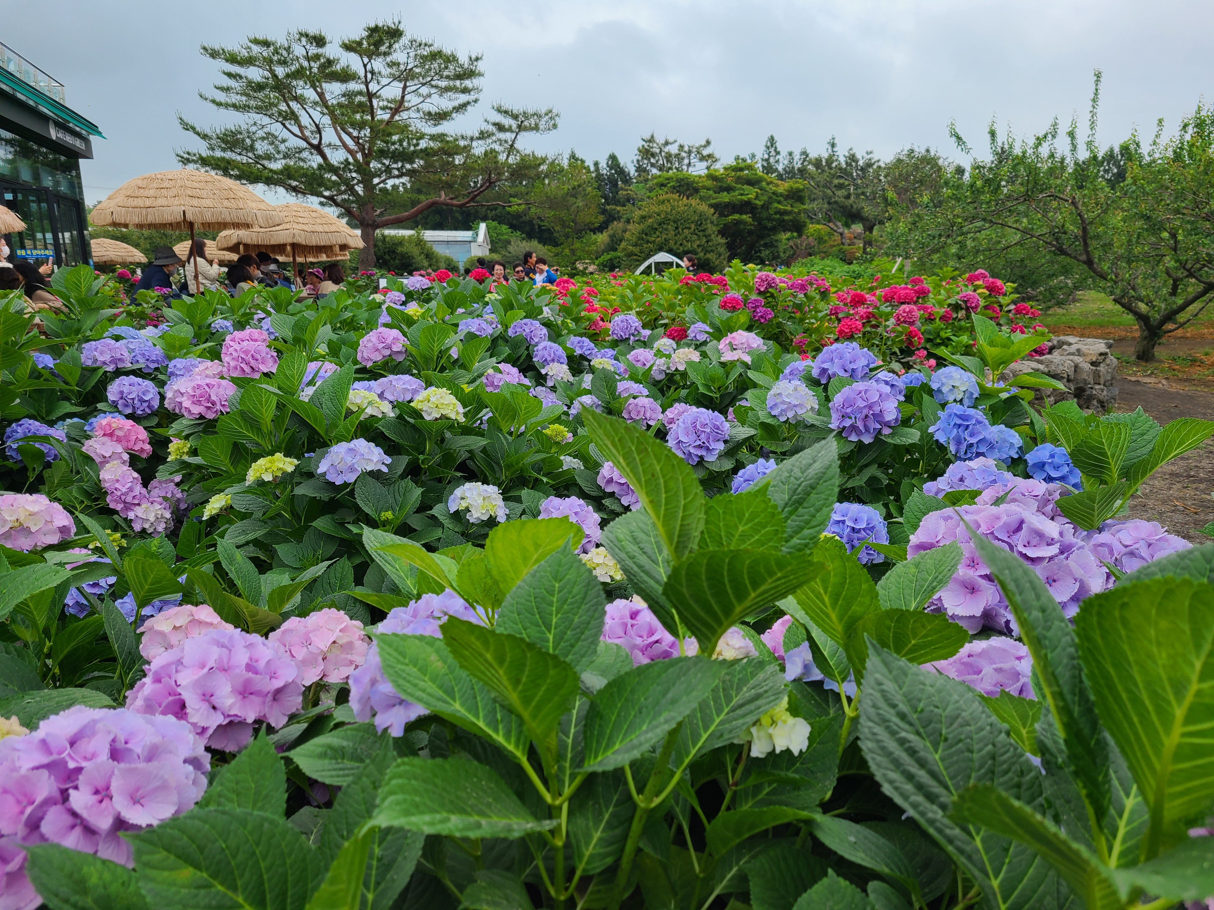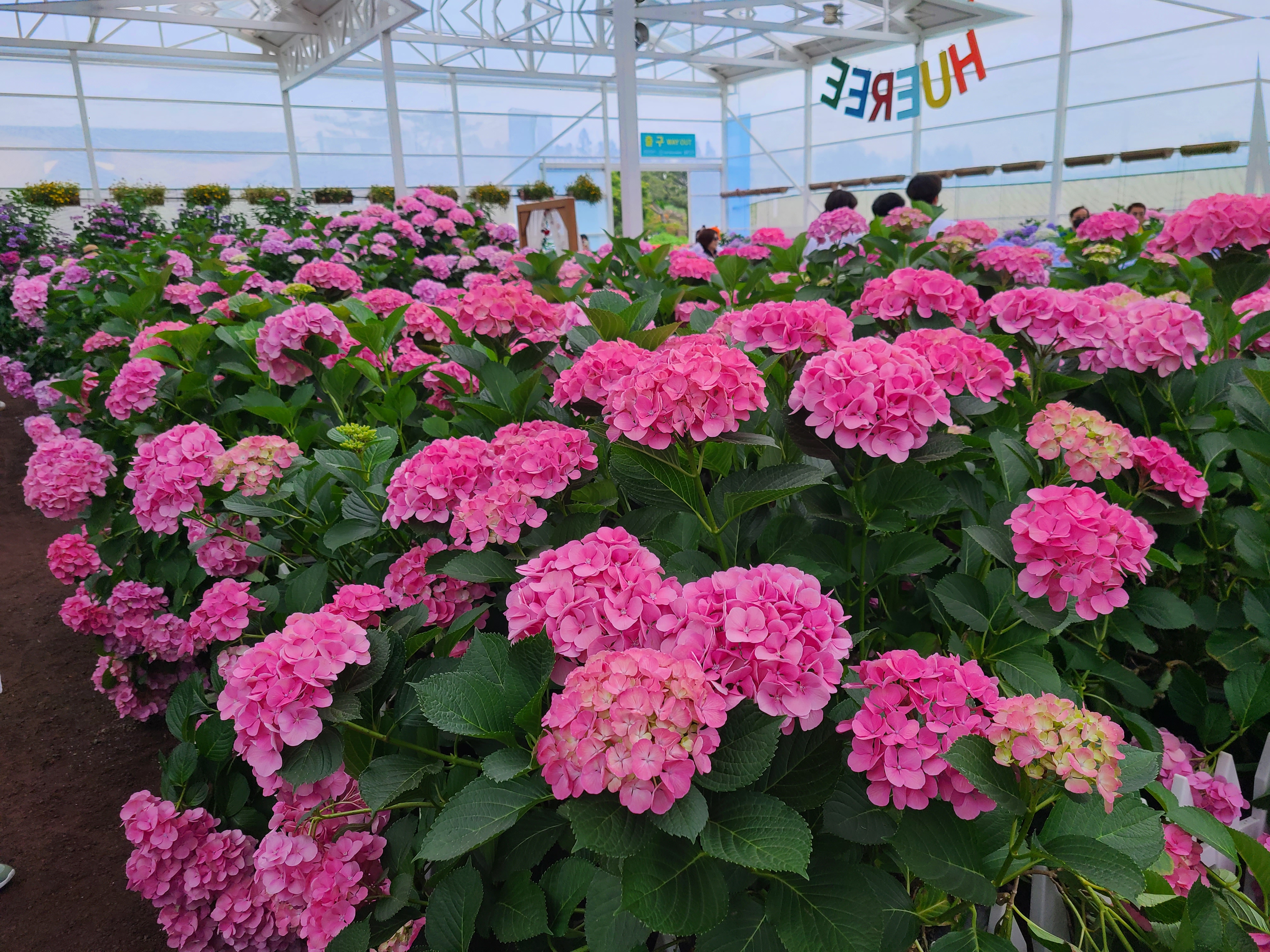휴애리 자연생활공원으로 들어서면 왼쪽으로 온실이 나오고 오른쪽으로는 화단정원과 매화 정원이 나오는데 온실과 화단정원에 형형색색의 다양한 모양의 수국이 활짝 피어 있었다.
