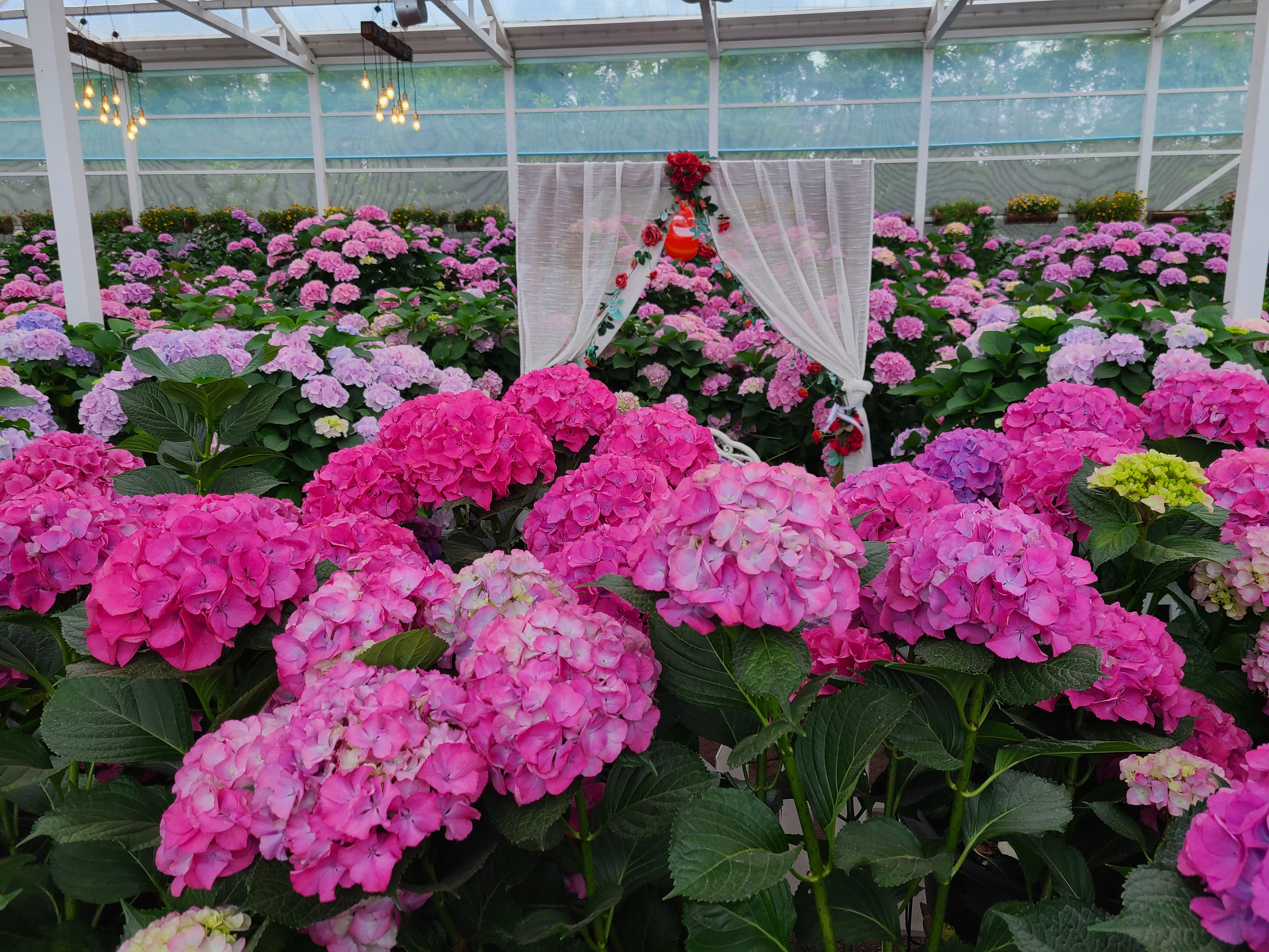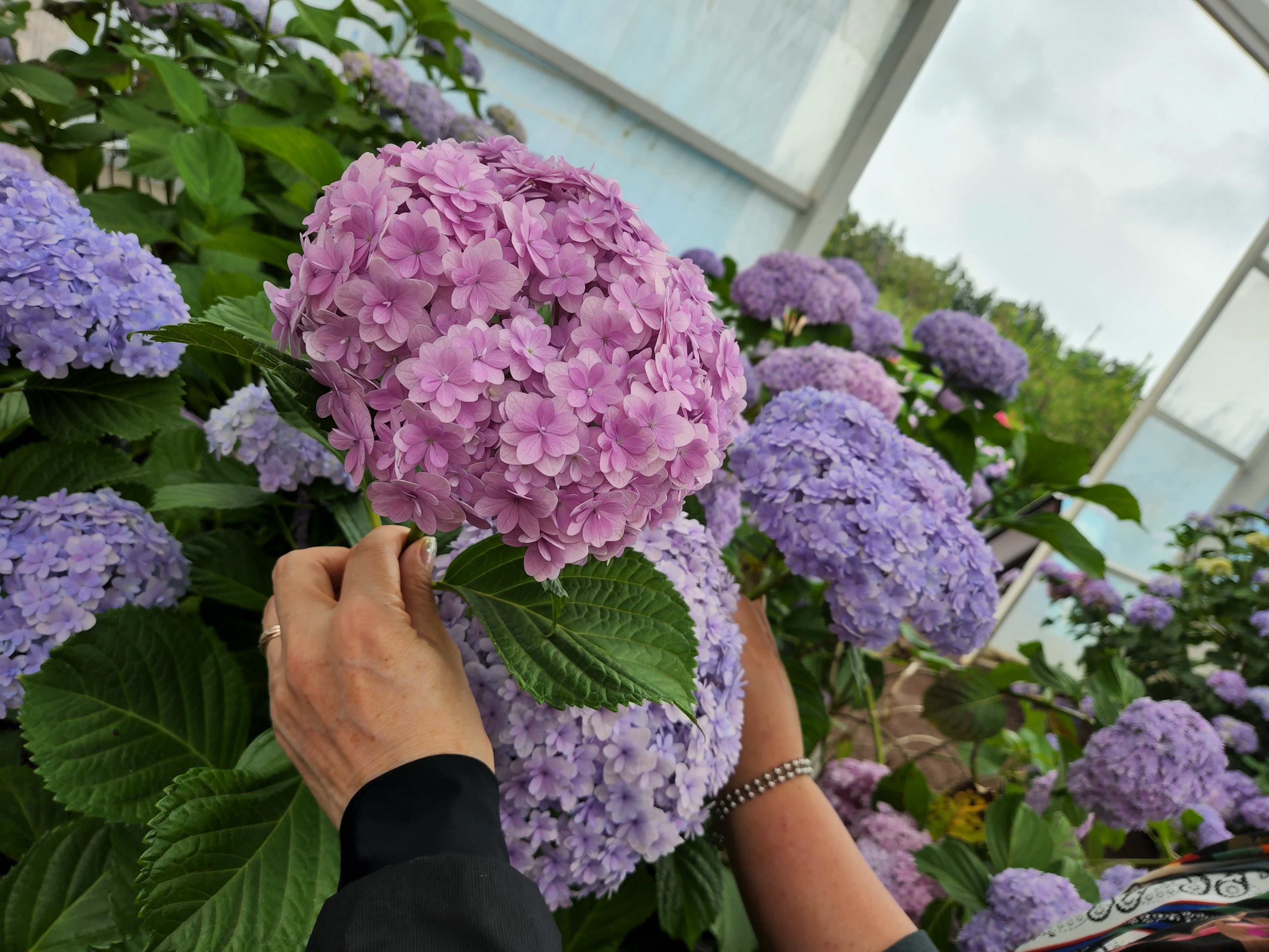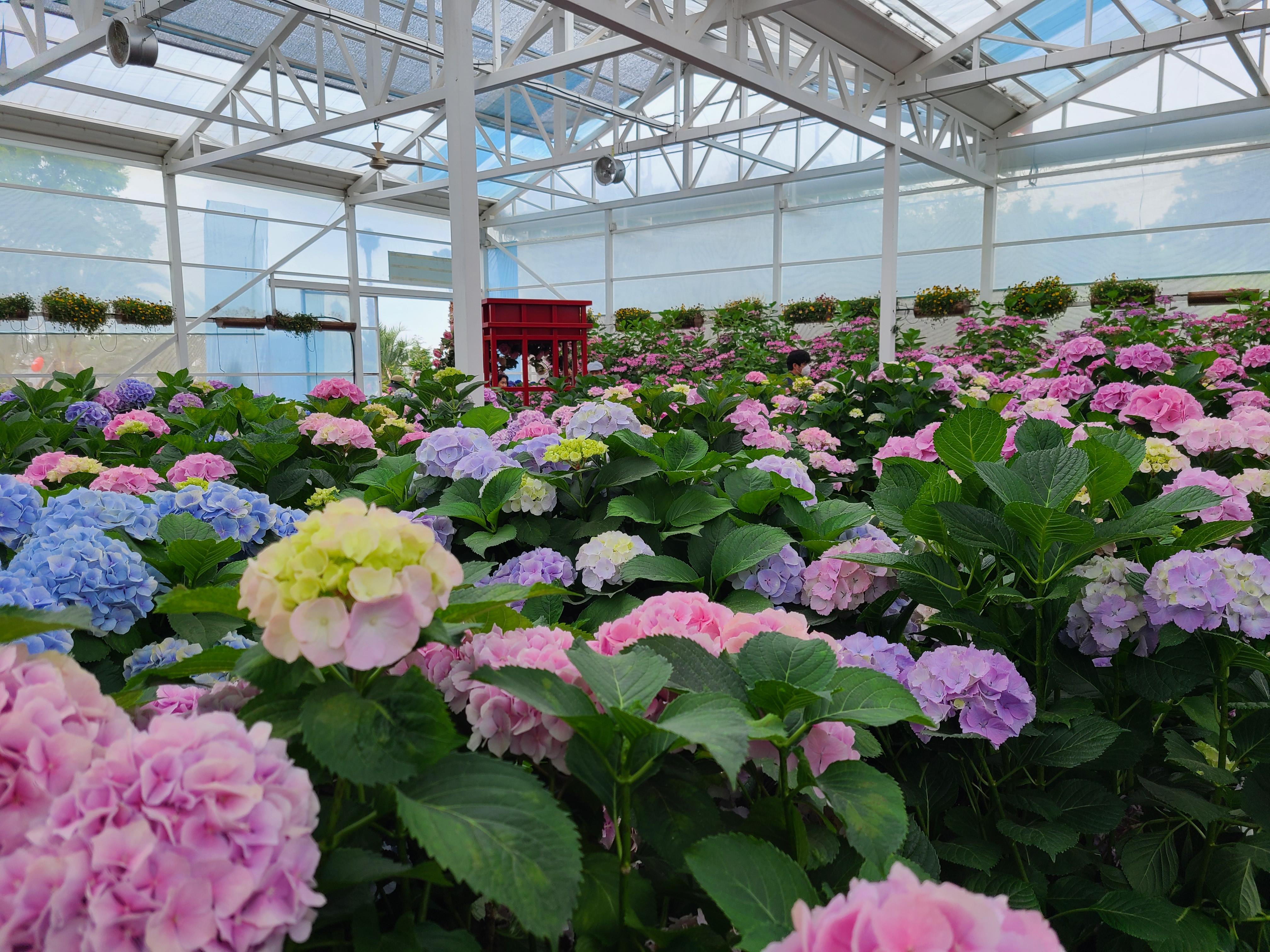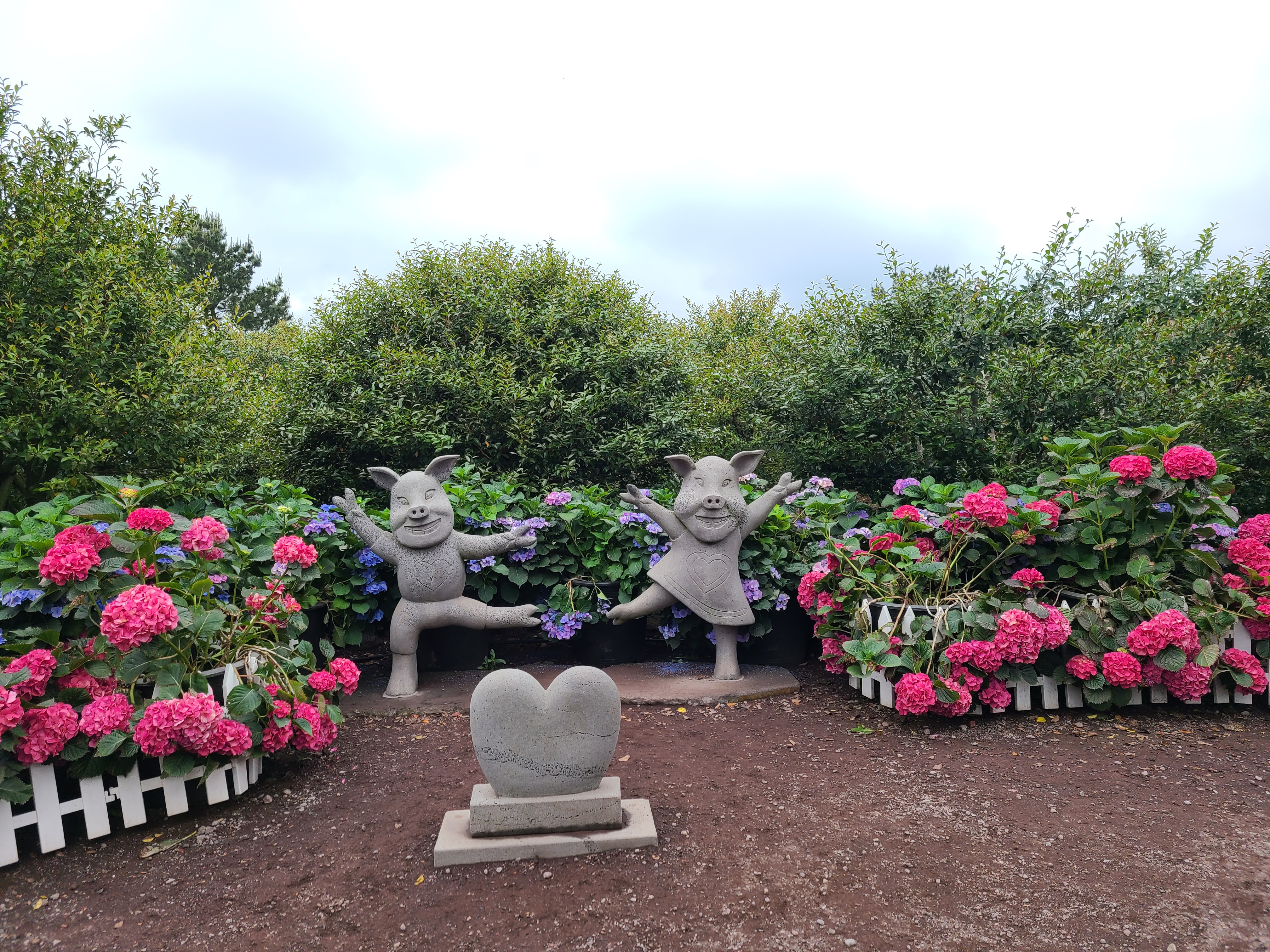 휴애리 자연생활공원으로 들어서면 왼쪽으로 온실이 나오고 오른쪽으로는 화단정원과 매화 정원이 나오는데 온실과 화단정원에 형형색색의 다양한 모양의 수국이 활짝 피어 있었다.