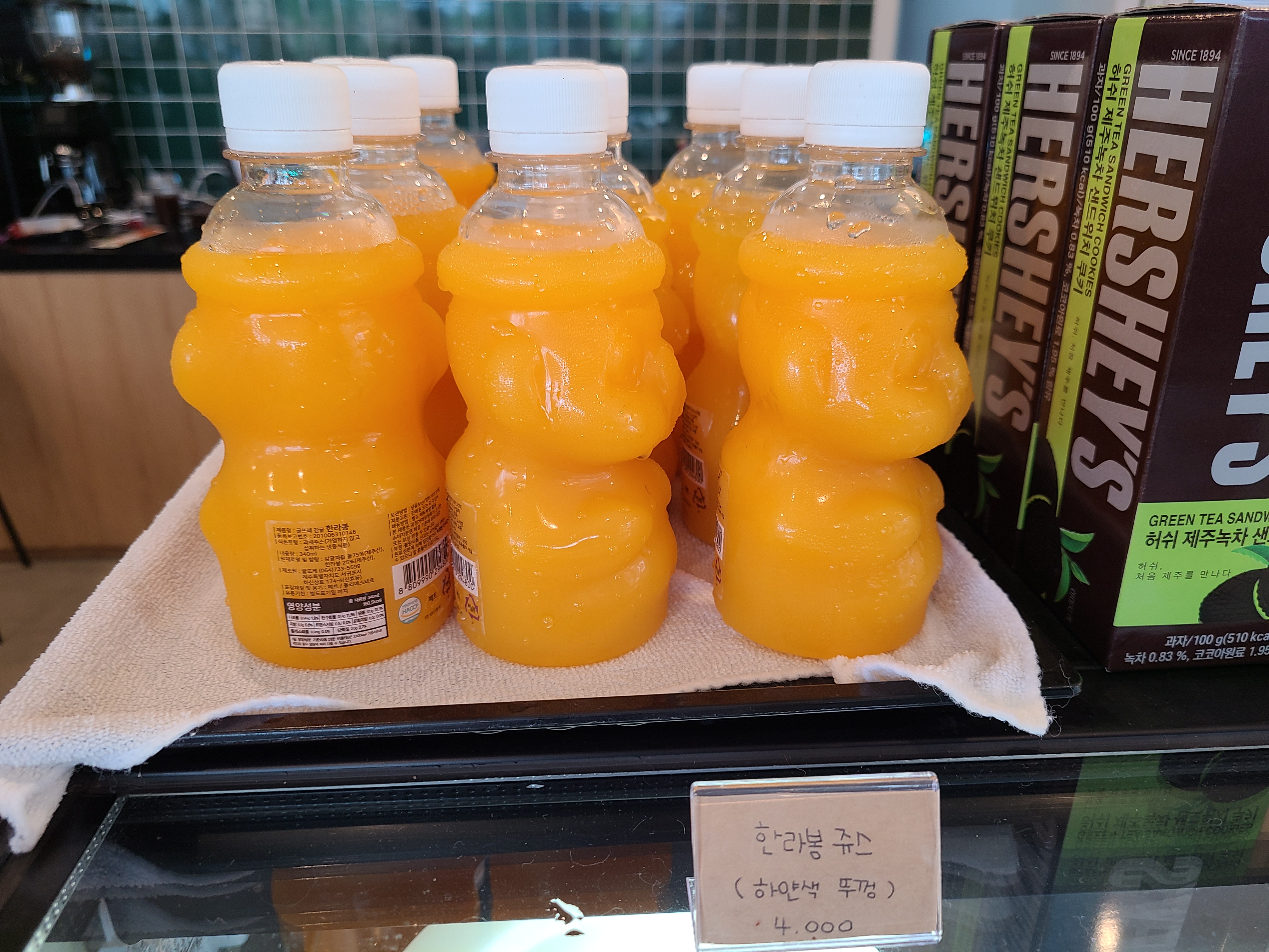 일행들은 카페 앞에 있는 야외테이블에 앉아 있고 음료를 주문하기 위해 카페에 들어가니 휴애리 매실차, 한라봉차, 유자차가 제주 특산 차로 준비되어있다. 가장 눈에 띄는 것 제주 감귤 착즙주스와 한라봉 주스였다.
