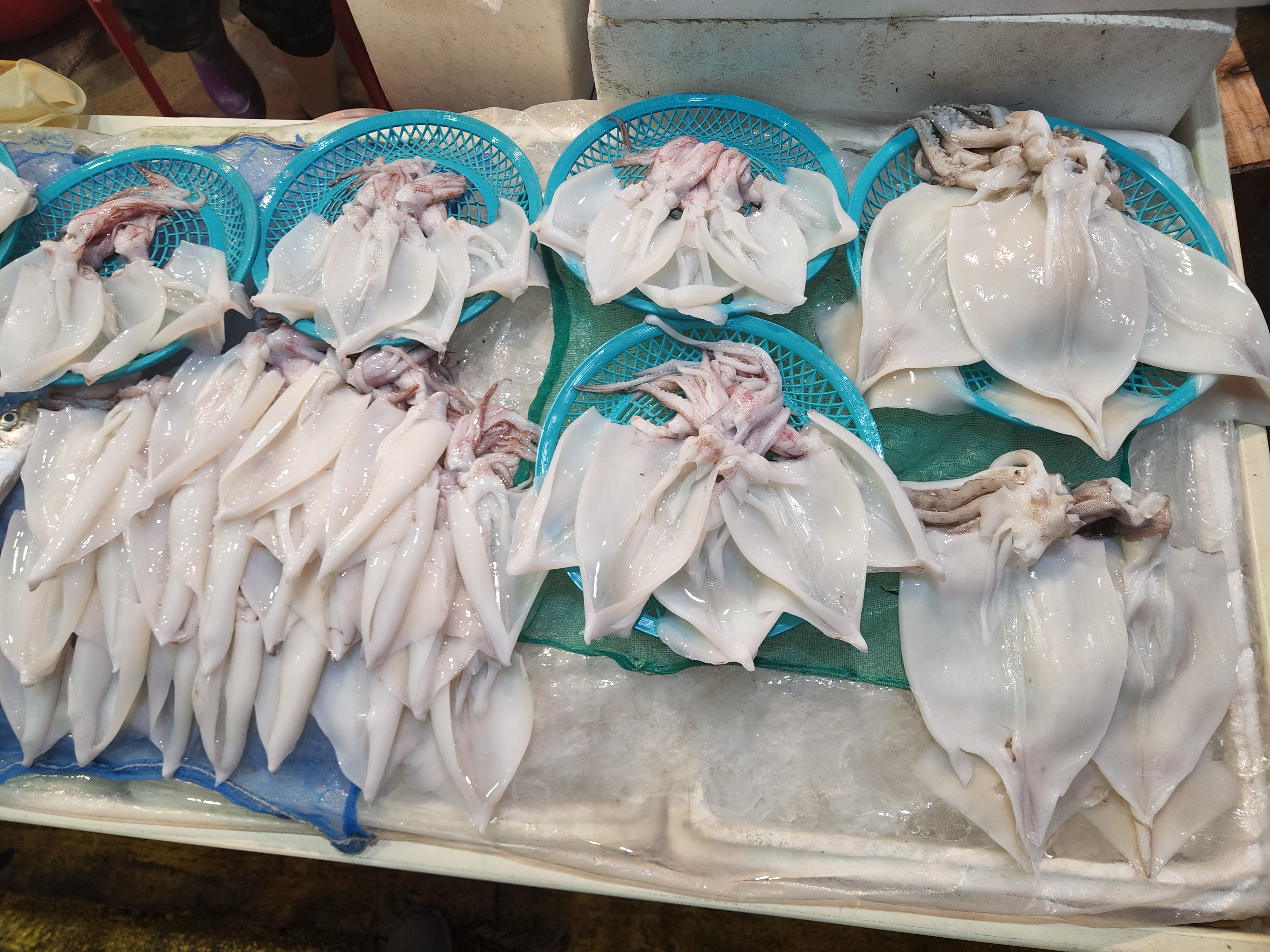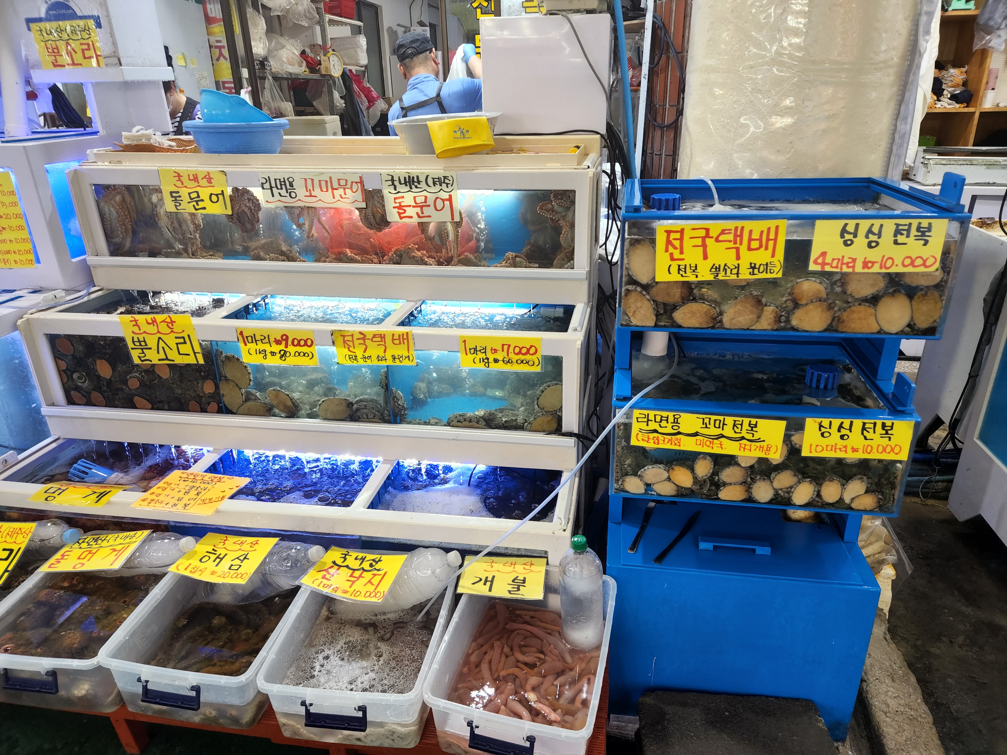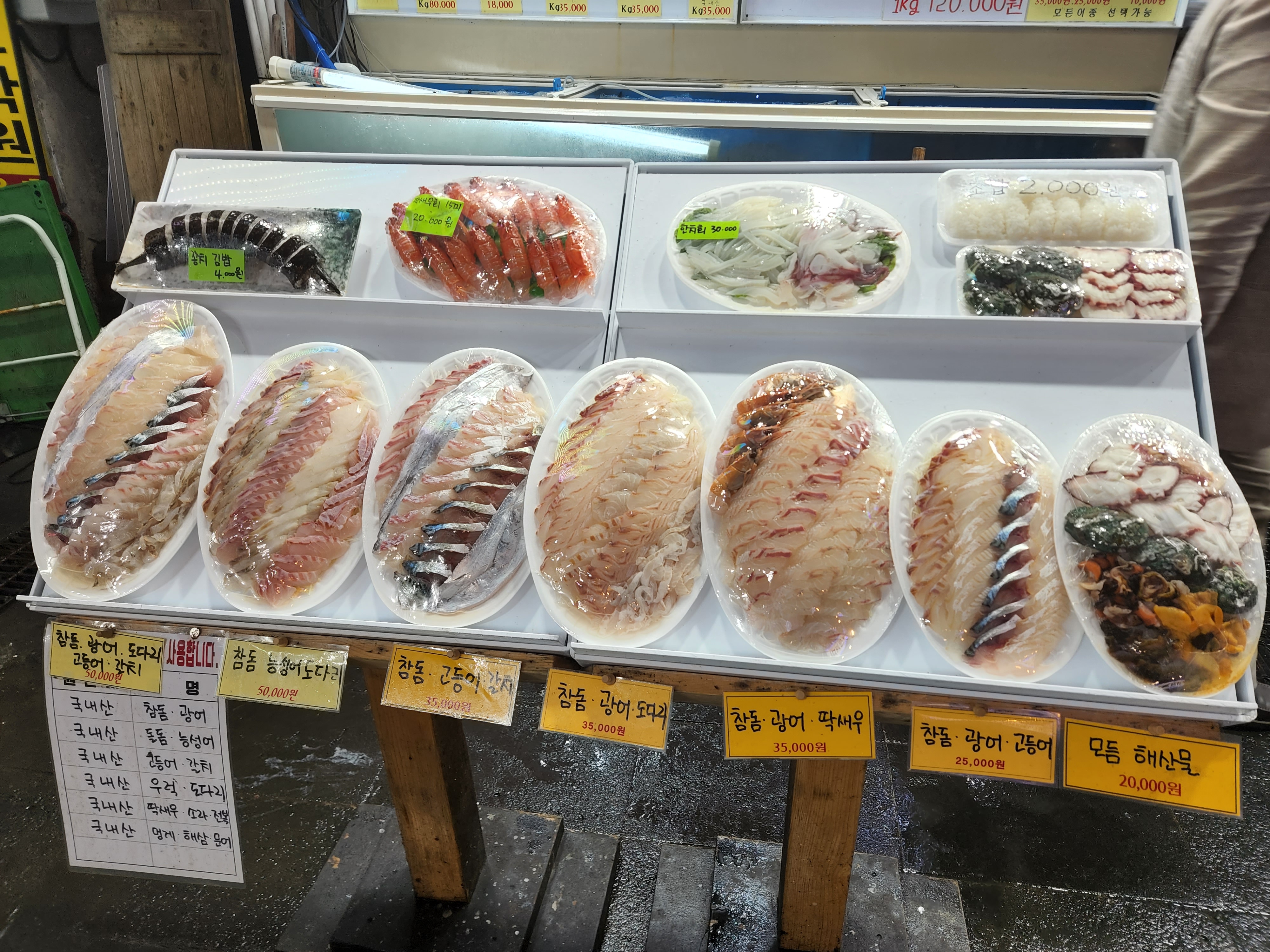 시장에 들어서니 생선회를 종류별로 썰어 포장해놓은 모습이 여기저기 즐비하게 보였다.