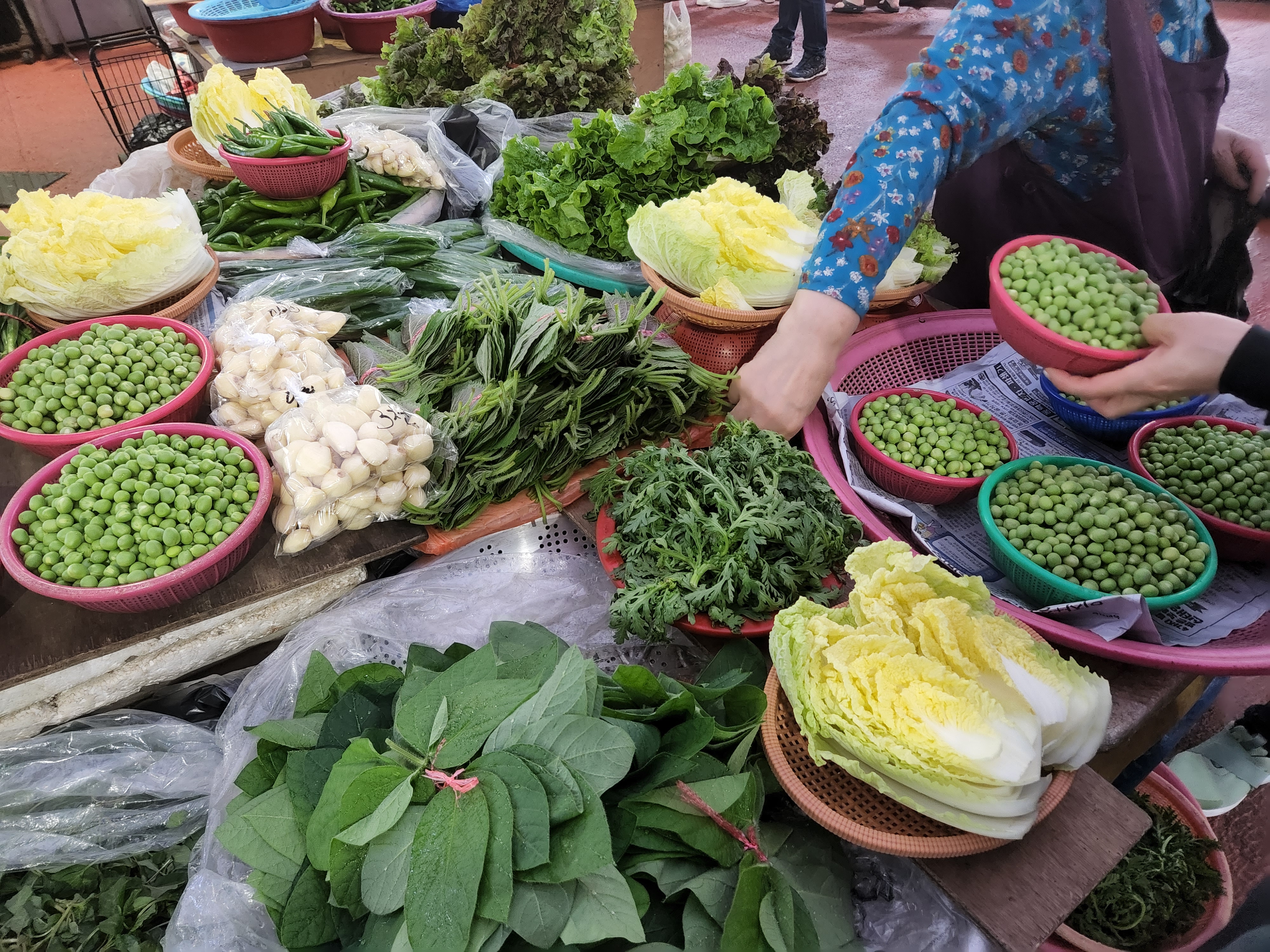 야채가게에서 완두콩과 통마늘, 깻잎, 알배추, 상추를 구입했다.