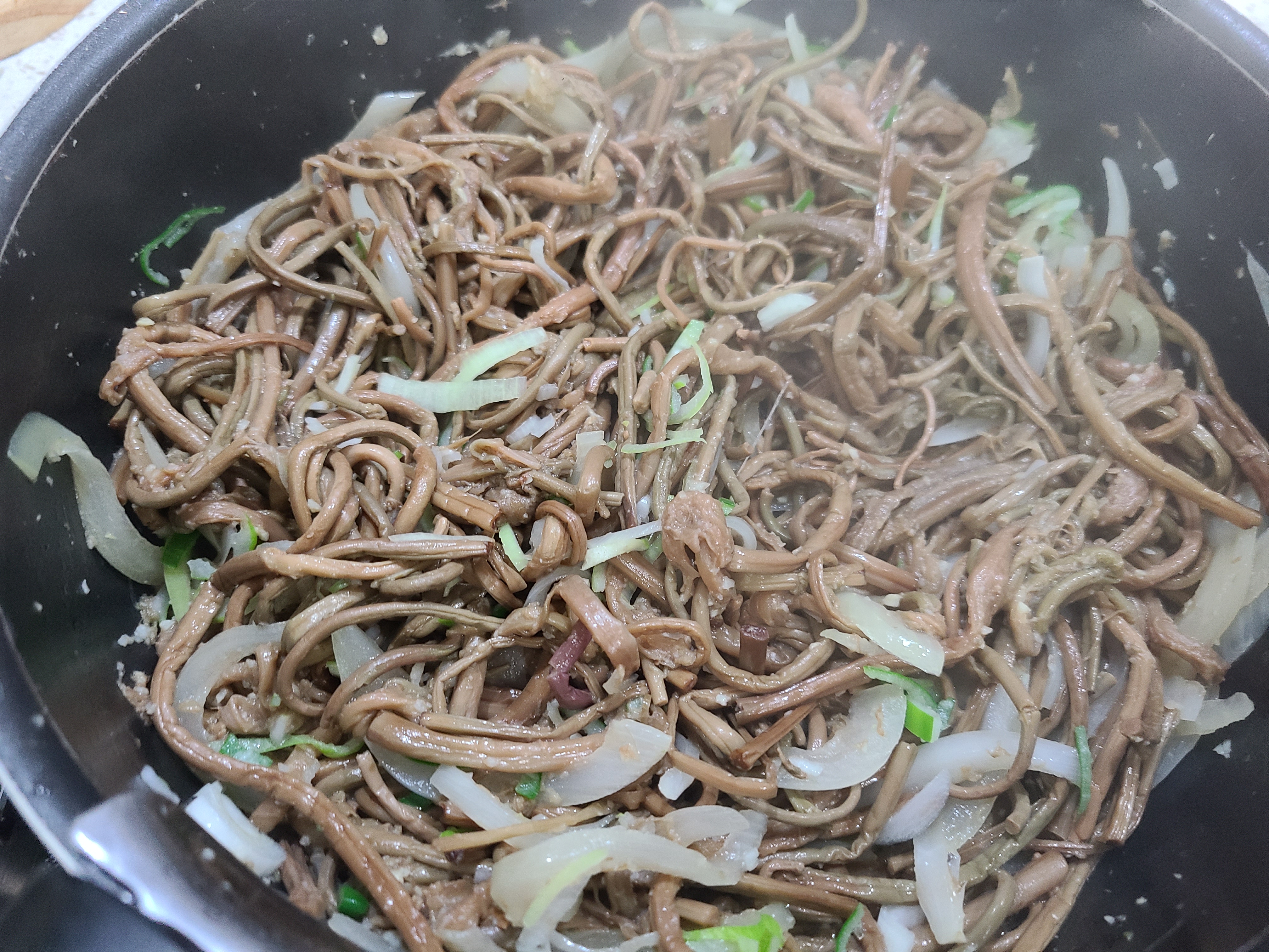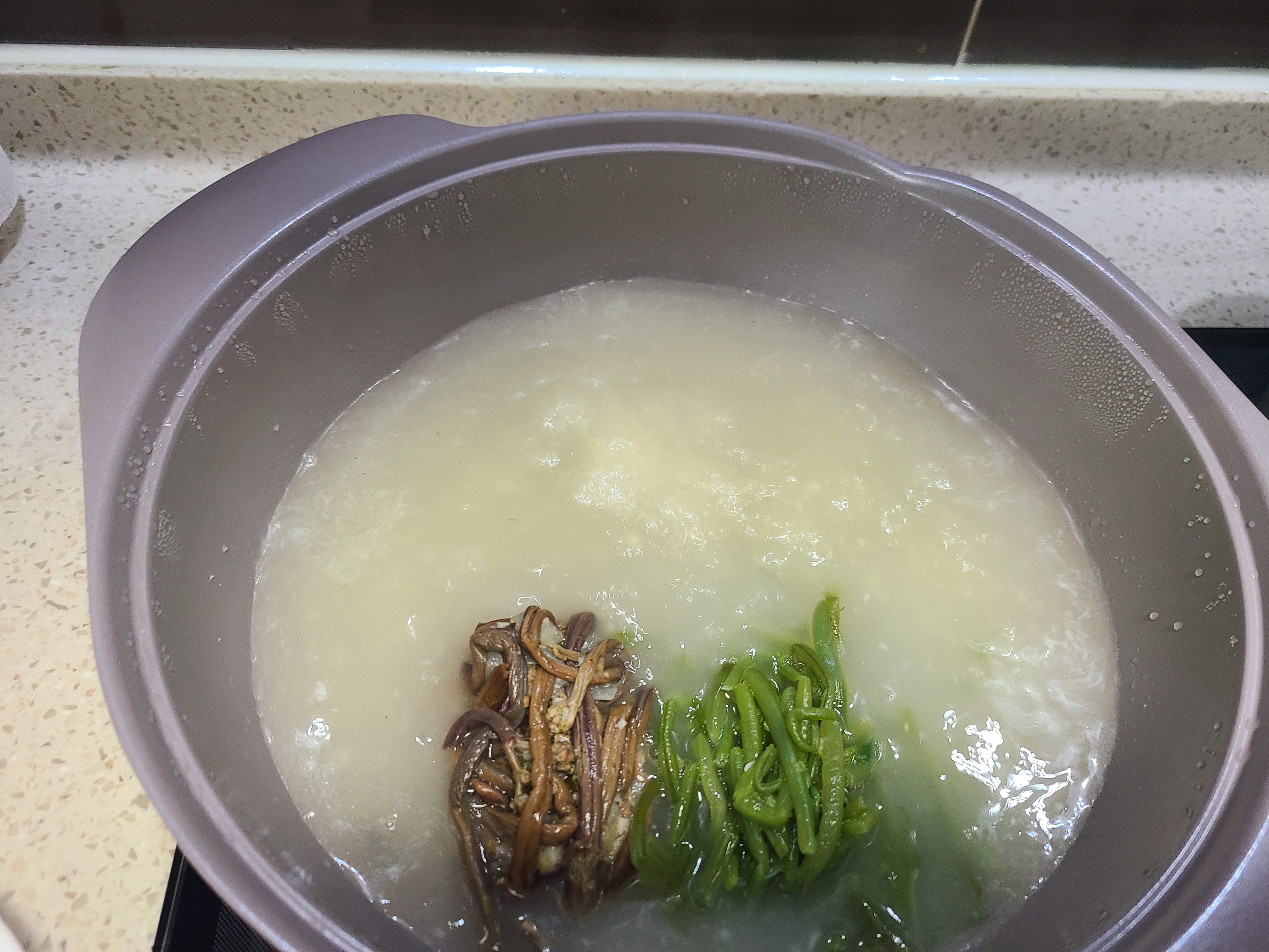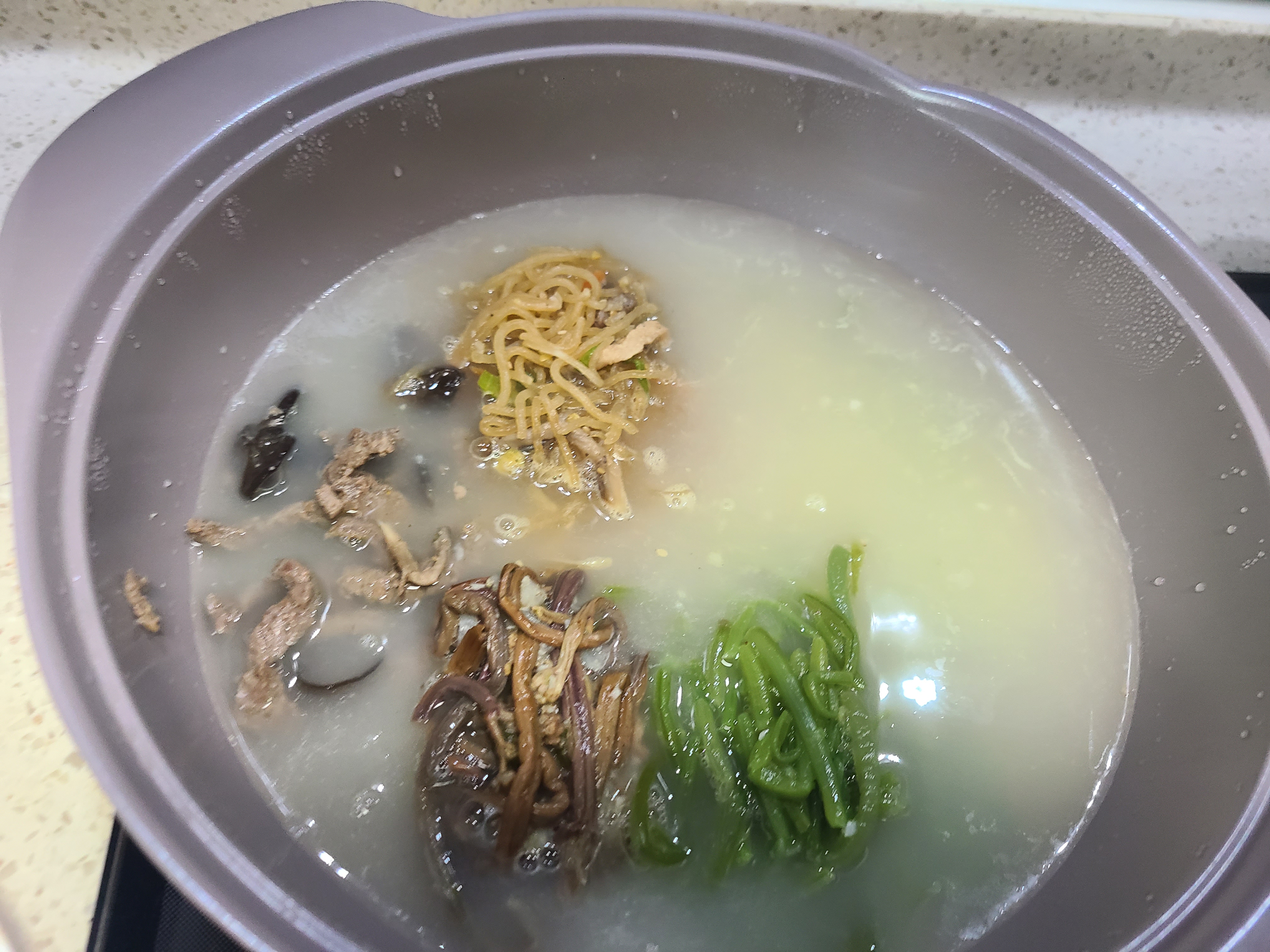 2. 사골육수가 끓으면 나물을 먼저 넣어준다.