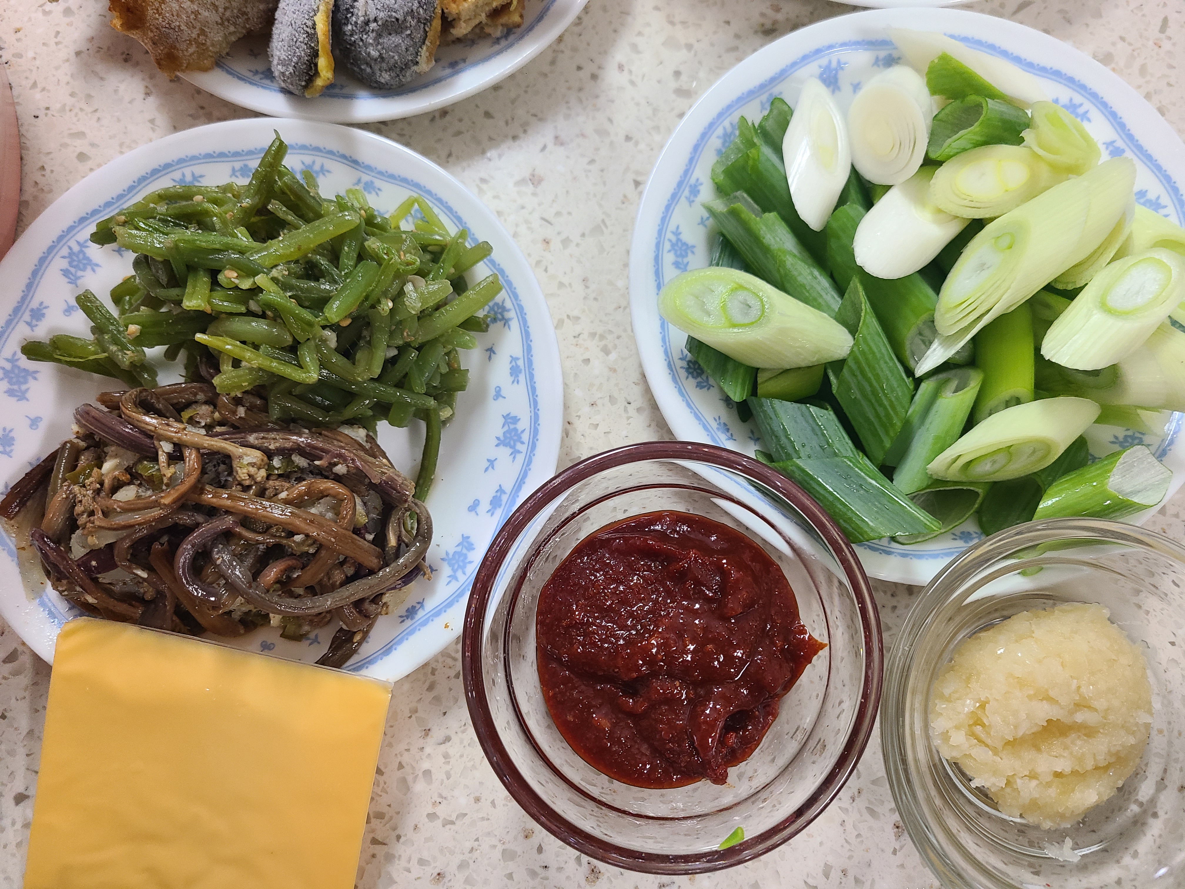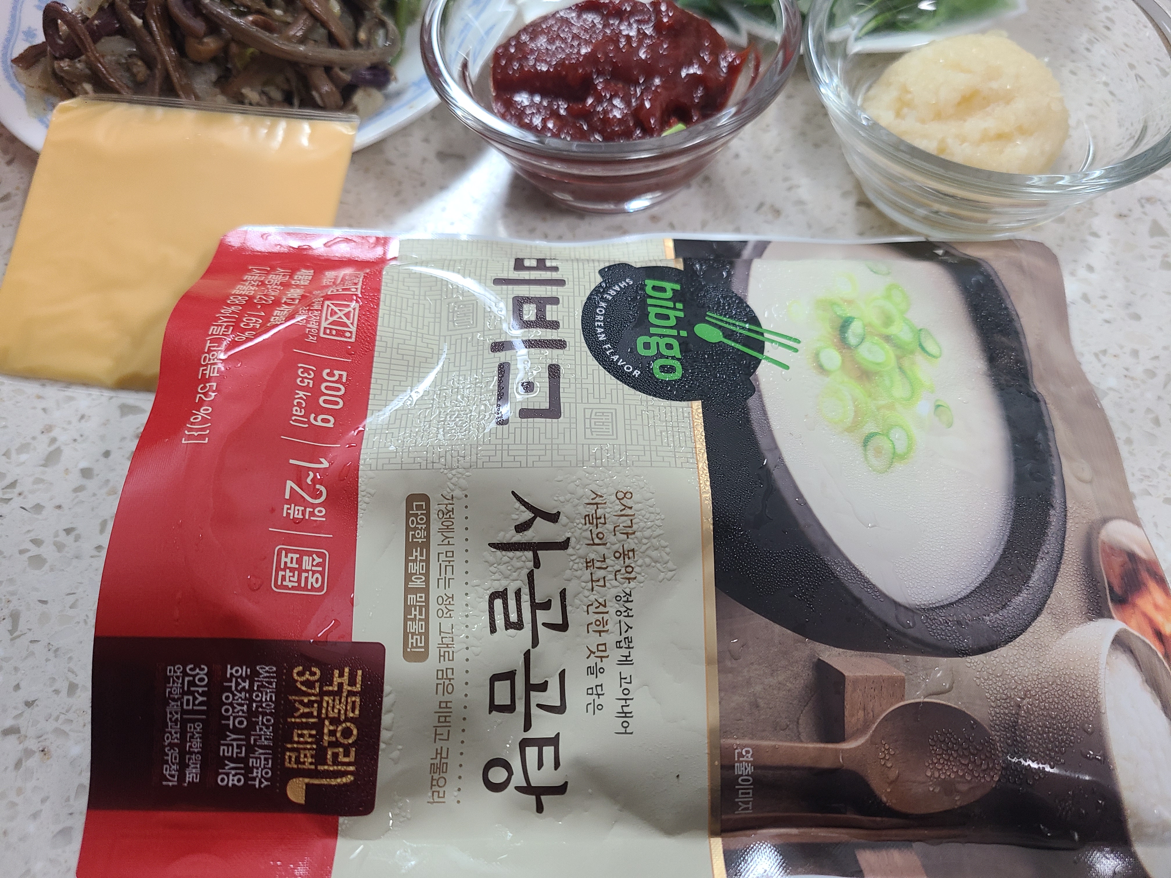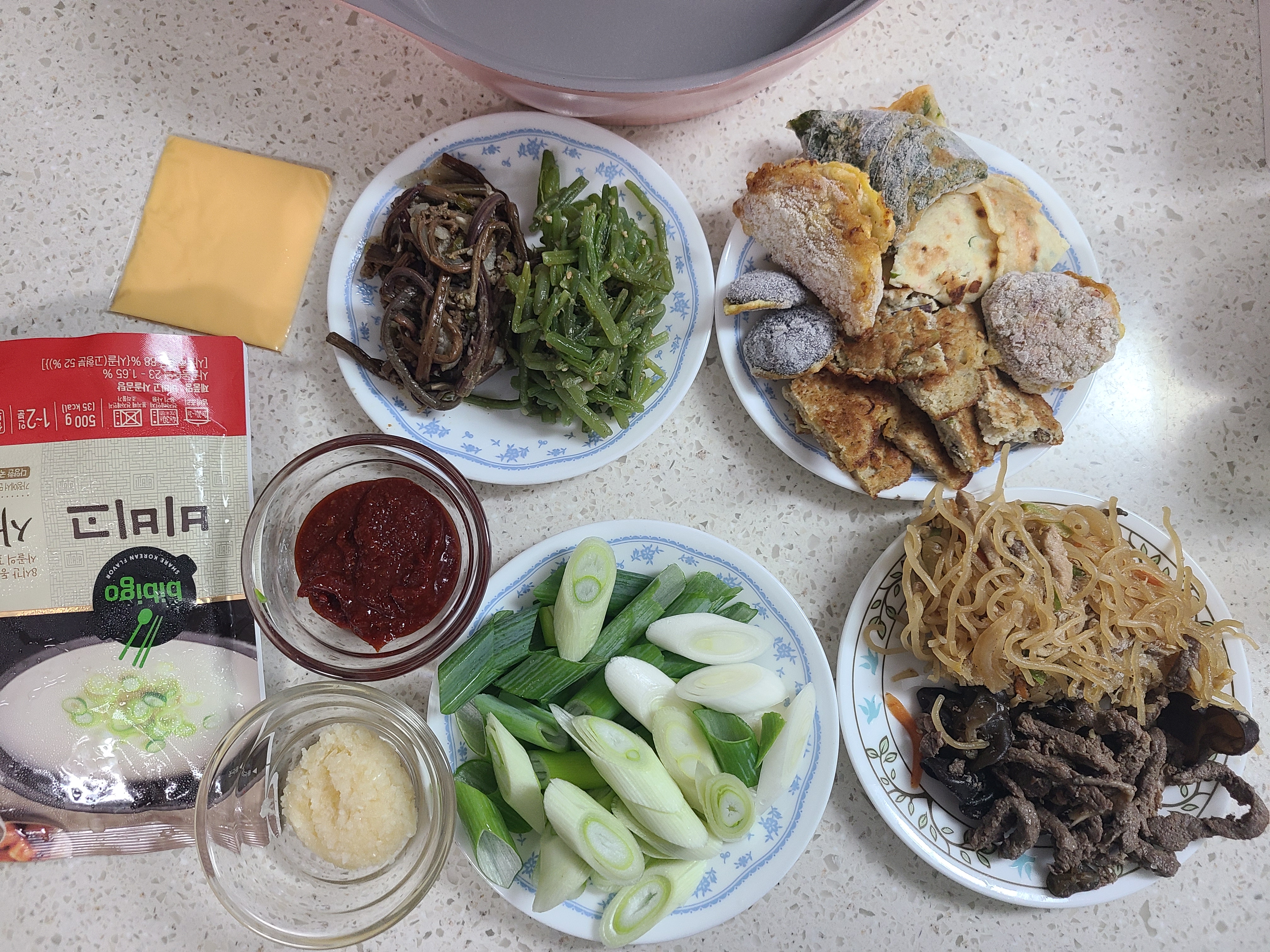 사골육수 500g, 모둠전, 고사리나물, 고구마 줄기(나물은 종류는 상관이 없다.), 잡채, 산적, 고추장 2큰술, 다진 마늘 1큰술, 대파 1 뿌리, 치즈 1장
