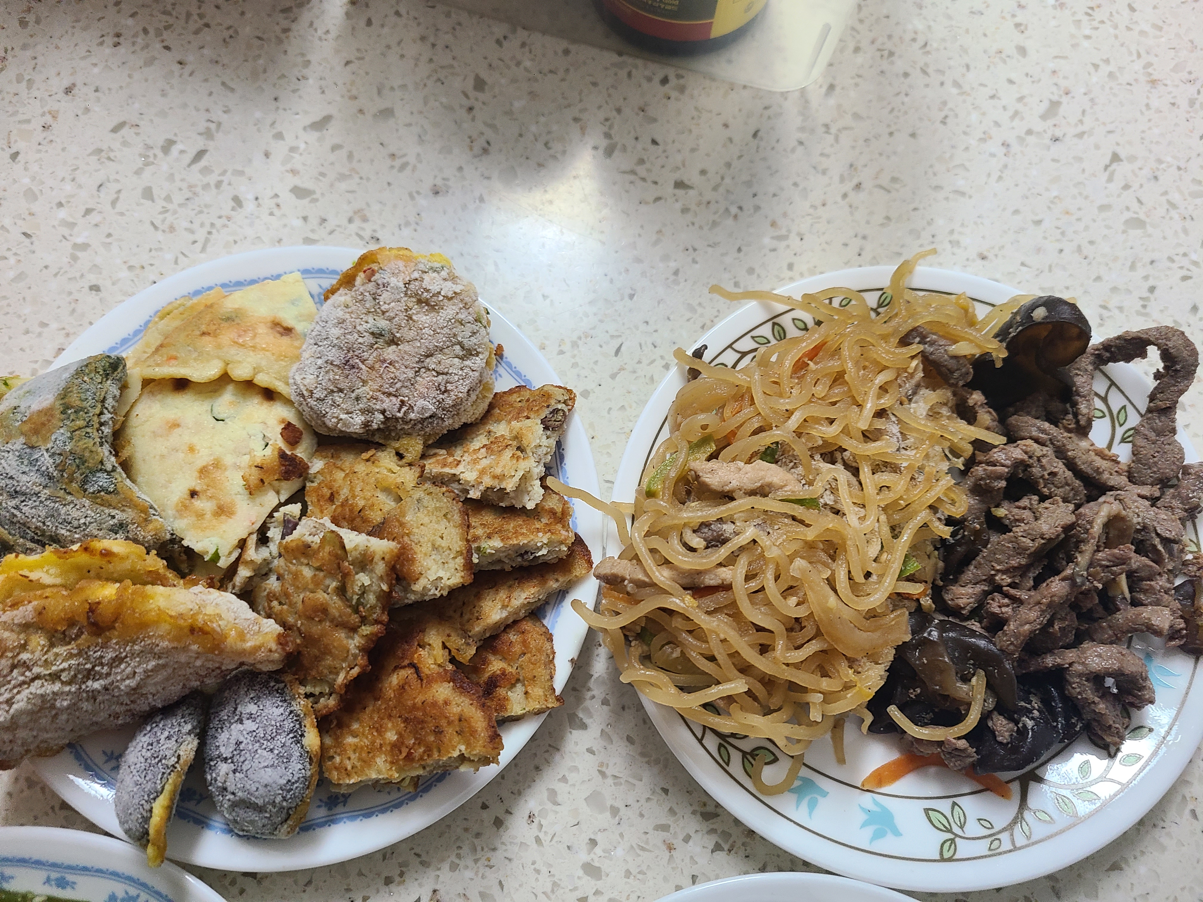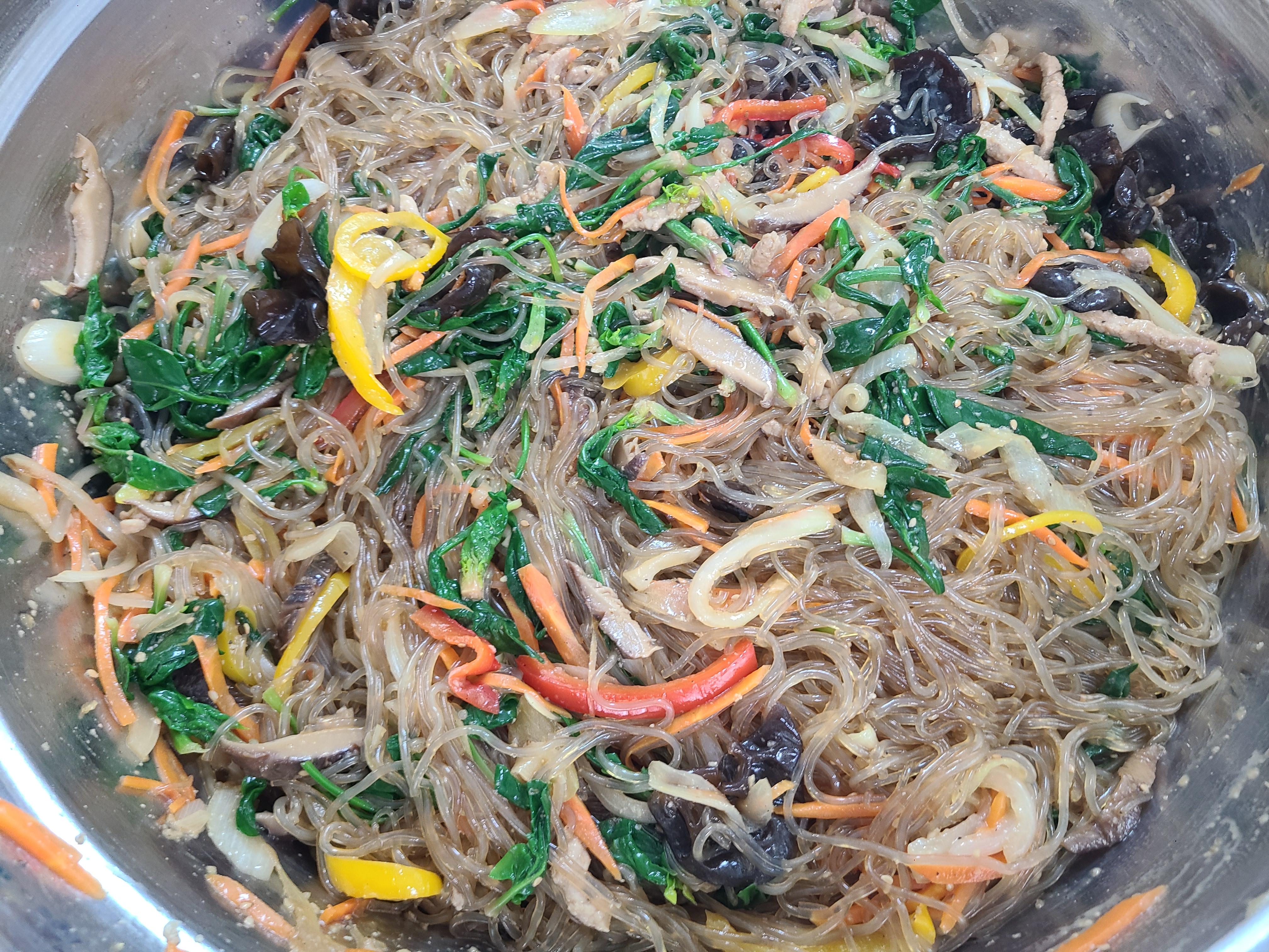 2. 잡채와 산적 썰은 것을 넣어주고 냉동실에 있던 모둠전도 넣어준다.(잡채를 소분해서 냉동실에 넣어두었던 것을 사용했다.)