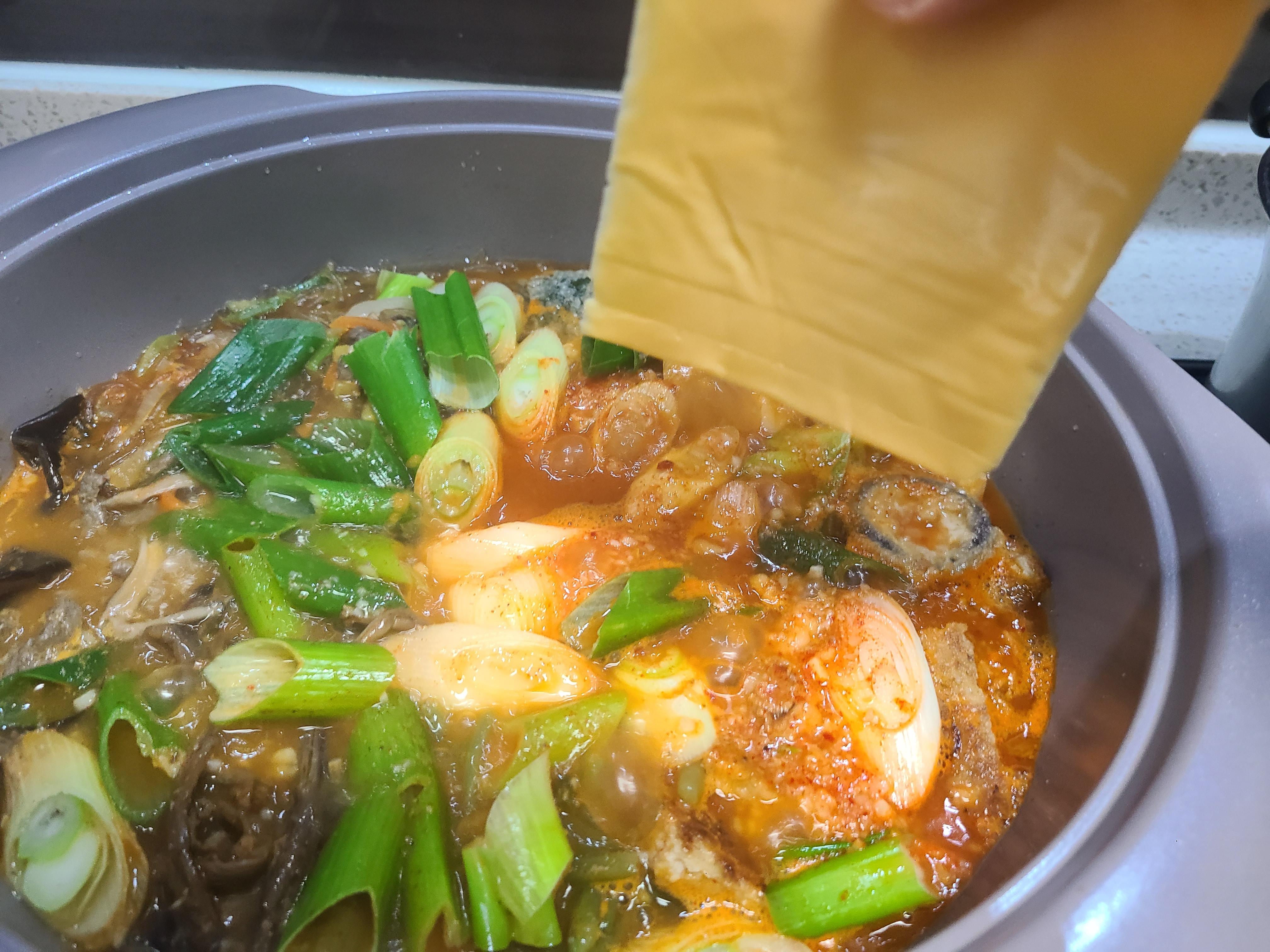 3. 재료를 모두 넣은 후 고추장 2큰술을 넣어준다. 고추장을 풀지 않았도 끓으면서 섞인다.