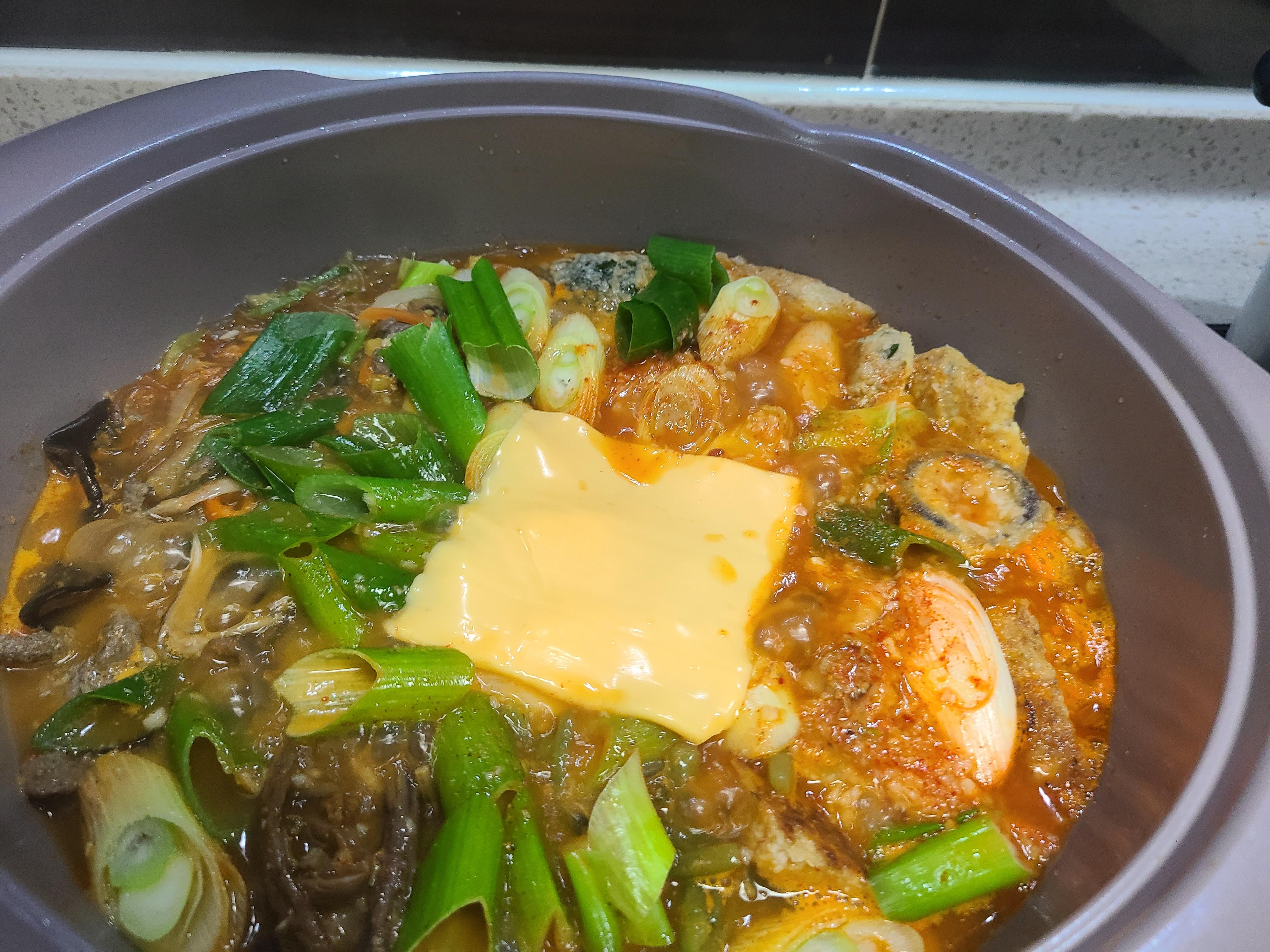 7. 전골 위에 올린 치즈가 녹아내리면 잡탕찌개가 완성된다.